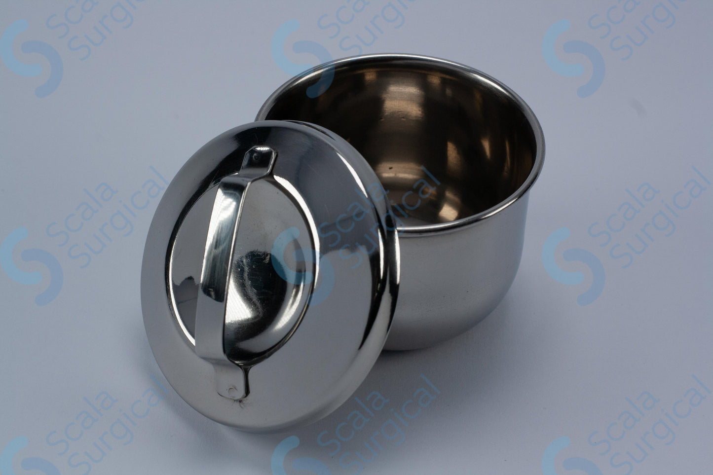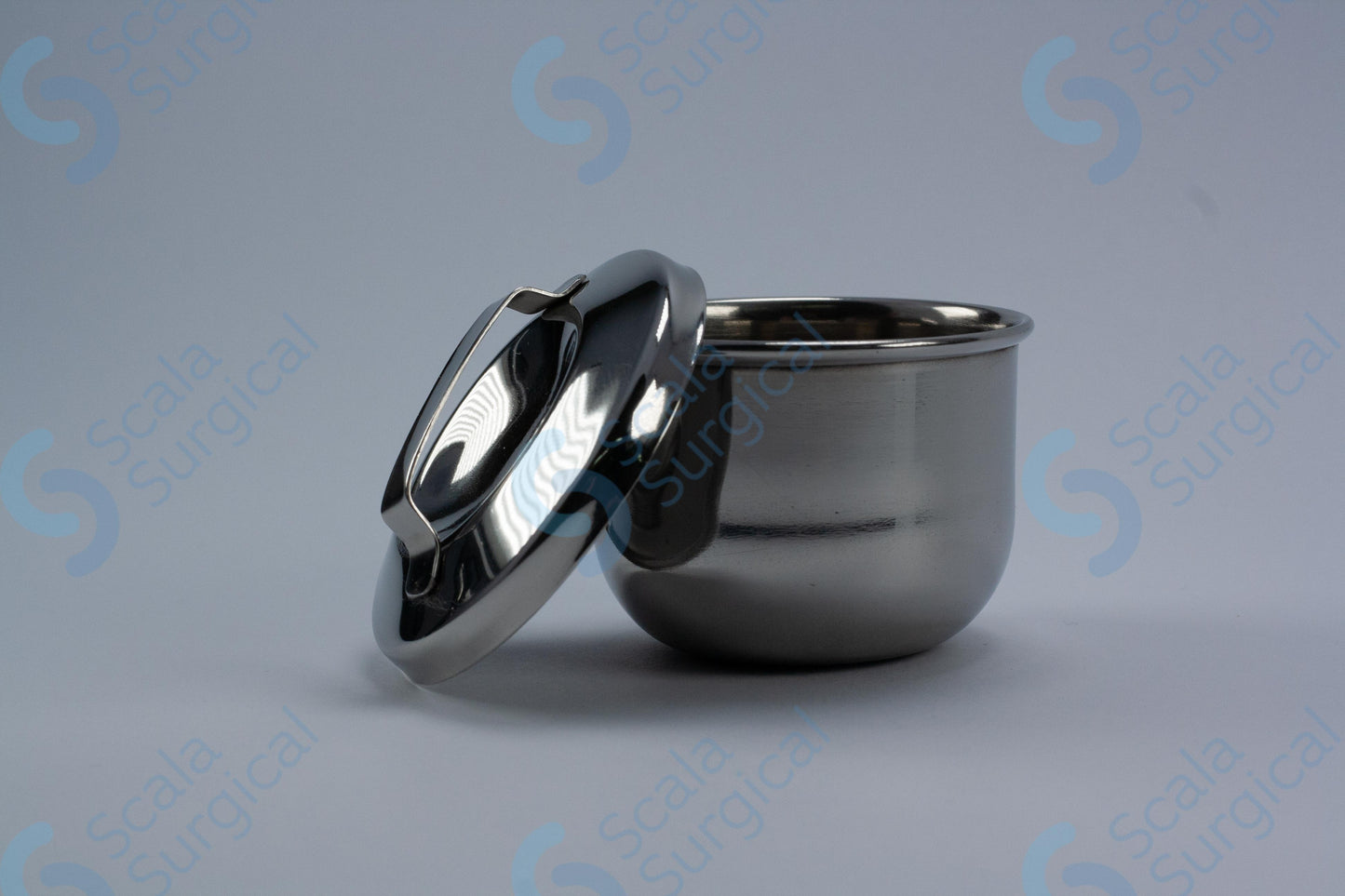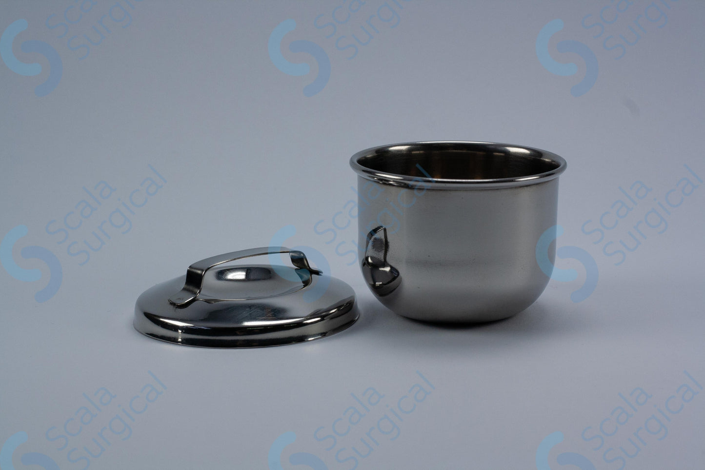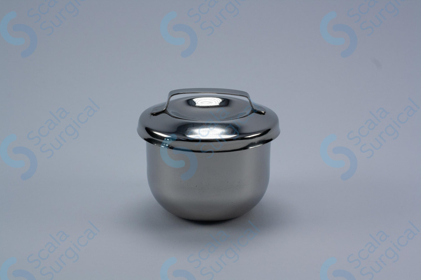 A gallipot with lid is a small container used in the surgical field to hold and dispense small amounts of a substance, such as medication or a cleaning solution. The 2 oz/55 ml size is typically used to hold and dispense small amounts of medication or other substances.