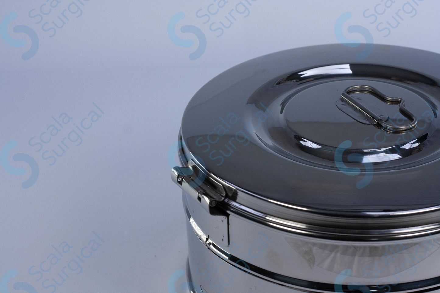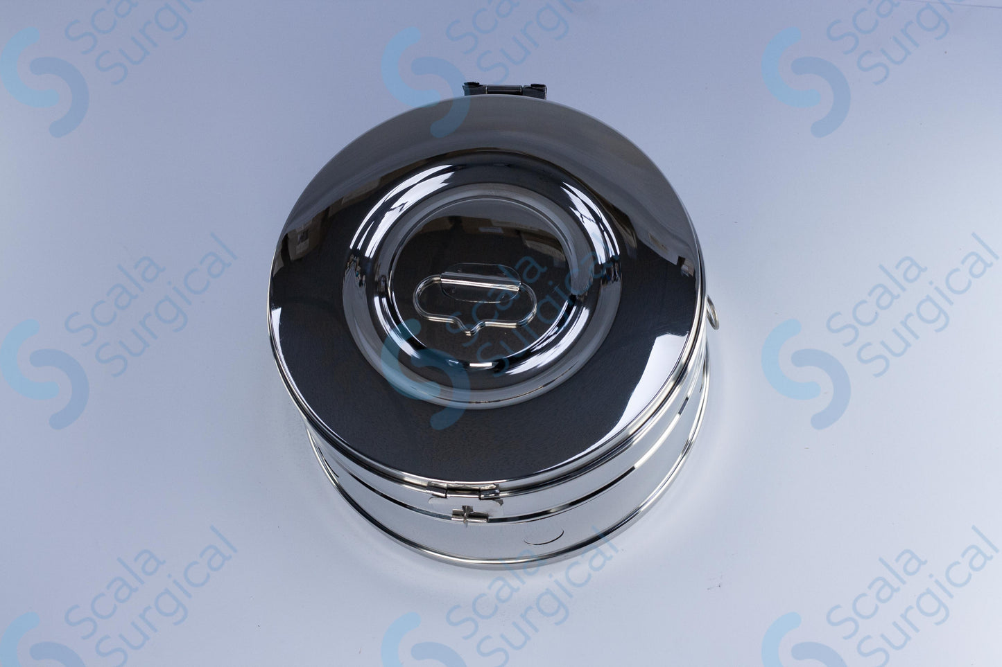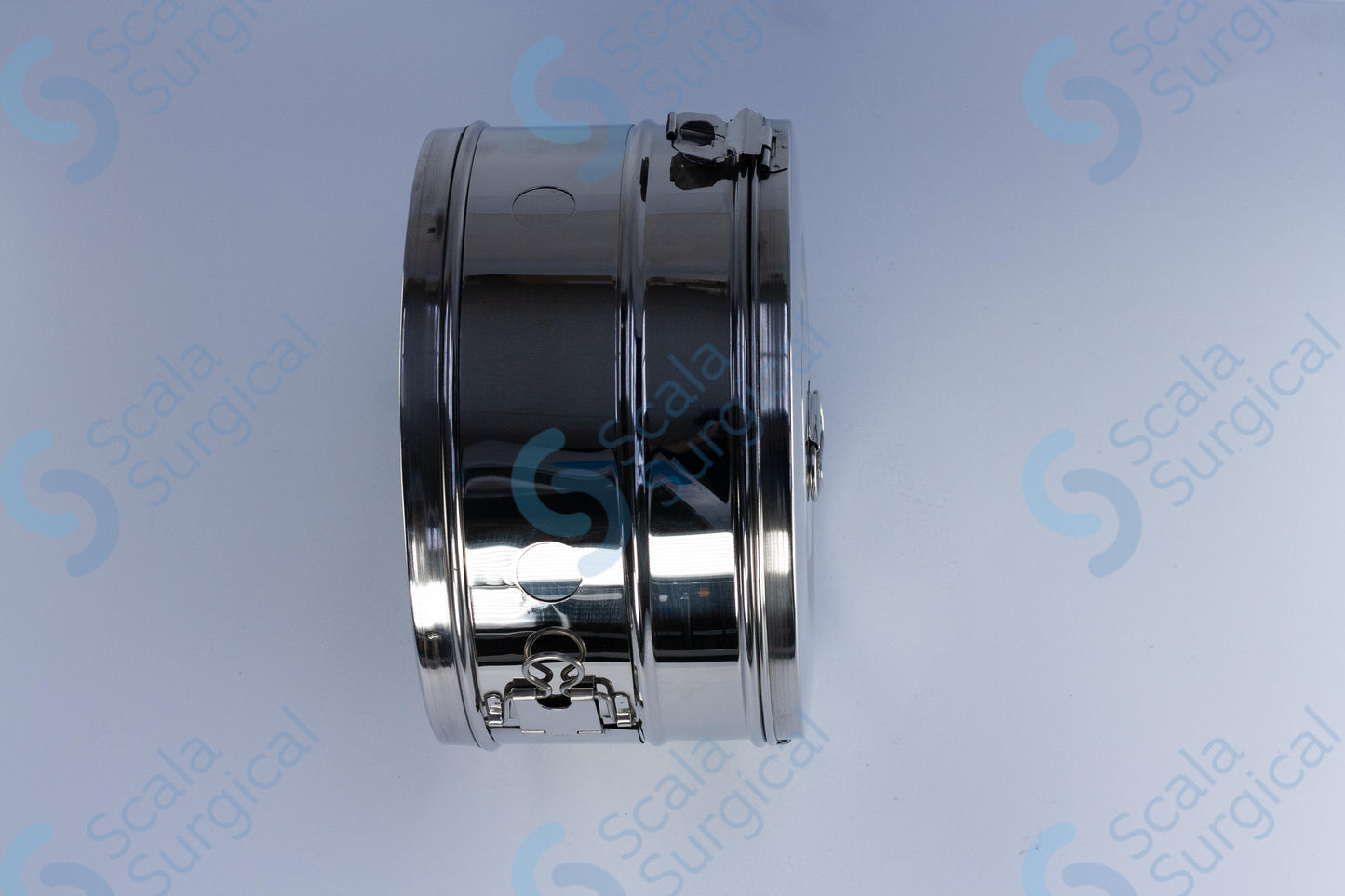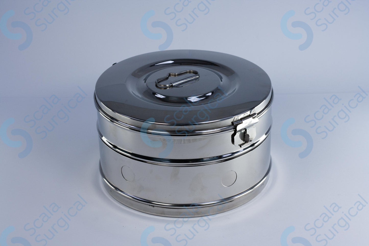 A sterilising drum is a device used to sterilise surgical instruments in the operating room. It is typically used to sterilise single-use instruments and reusable instruments that cannot be sterilised in an autoclave. The drum is filled with a sterilising solution or powder, and the instruments are placed inside the drum and agitated to ensure that all surfaces are exposed to the sterilising agent. The dimensions of this particular sterilising drum are 241.3 x 139.7mm (9? x 5? inch).