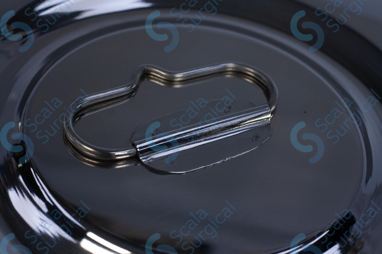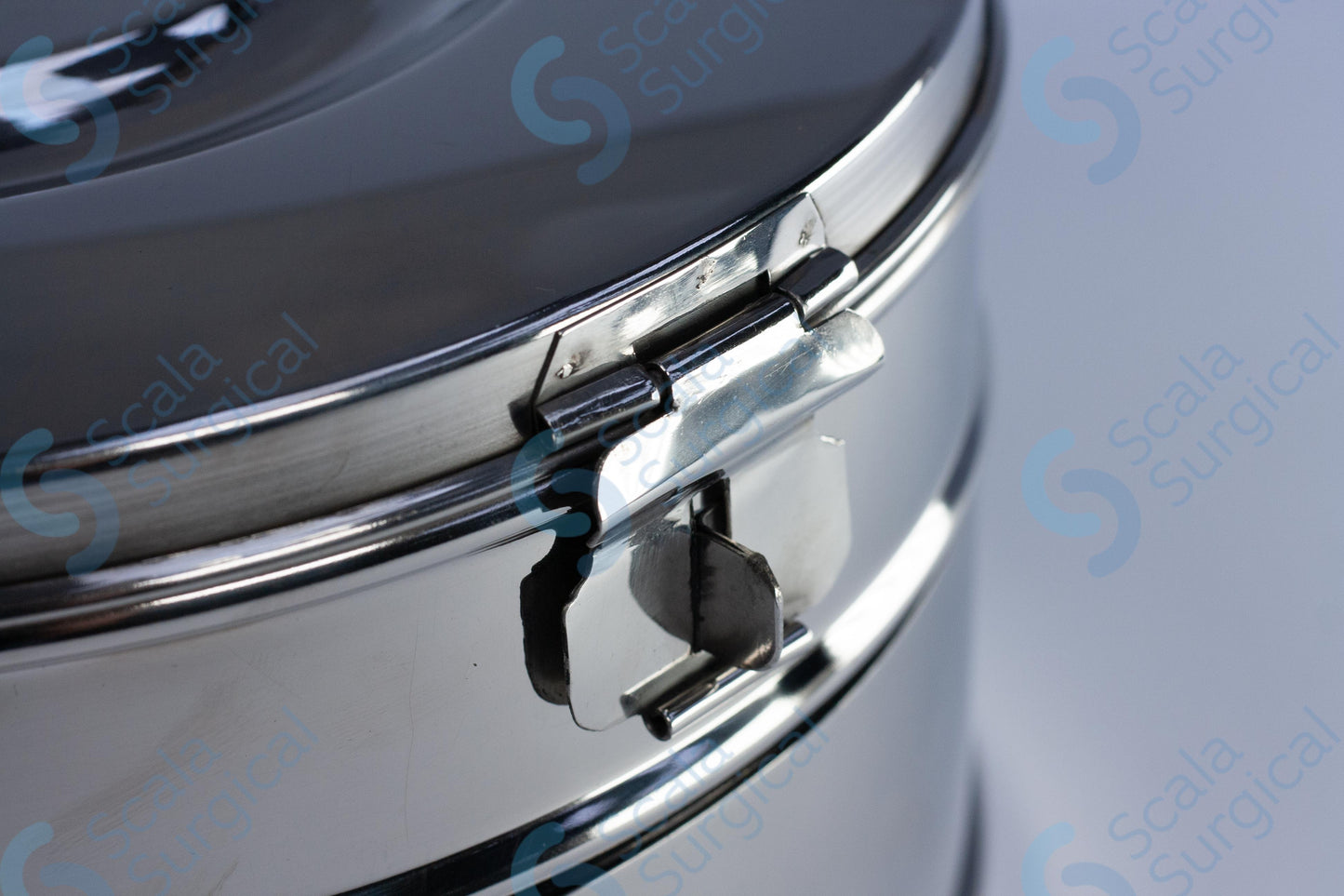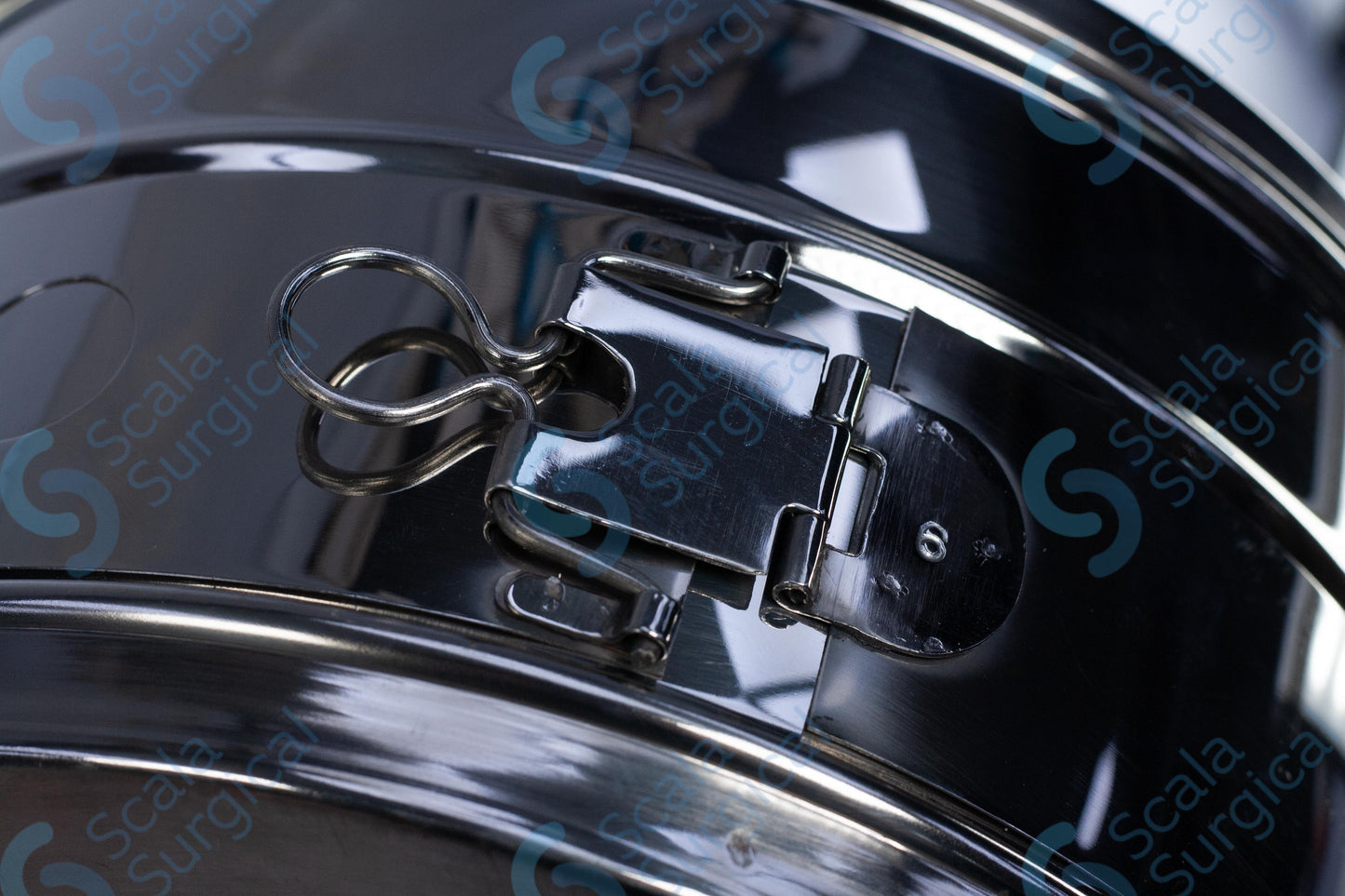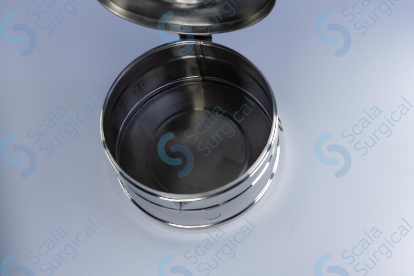 A sterilising drum is a device used to sterilise surgical instruments in the operating room. It is typically used to sterilise single-use instruments and reusable instruments that cannot be sterilised in an autoclave. The drum is filled with a sterilising solution or powder, and the instruments are placed inside the drum and agitated to ensure that all surfaces are exposed to the sterilising agent. The dimensions of this particular sterilising drum are 241.3 x 139.7mm (9? x 5? inch).
