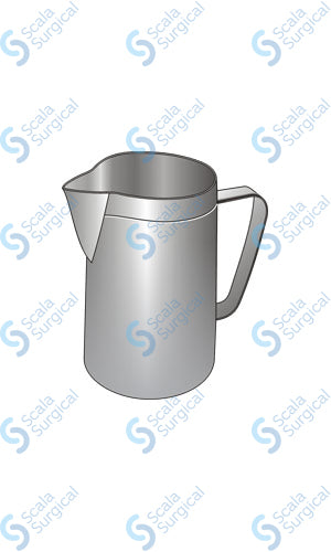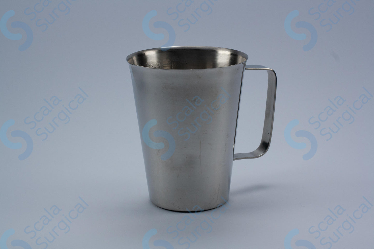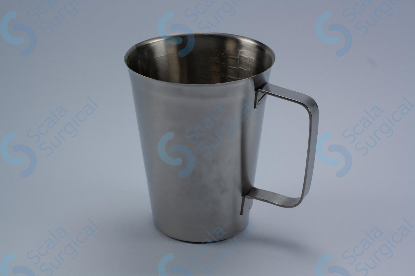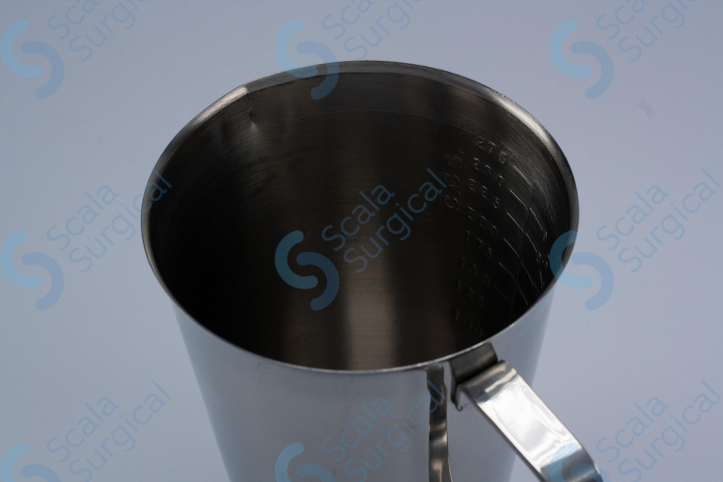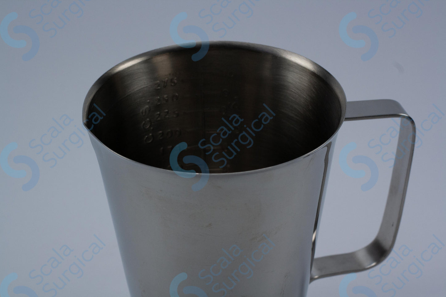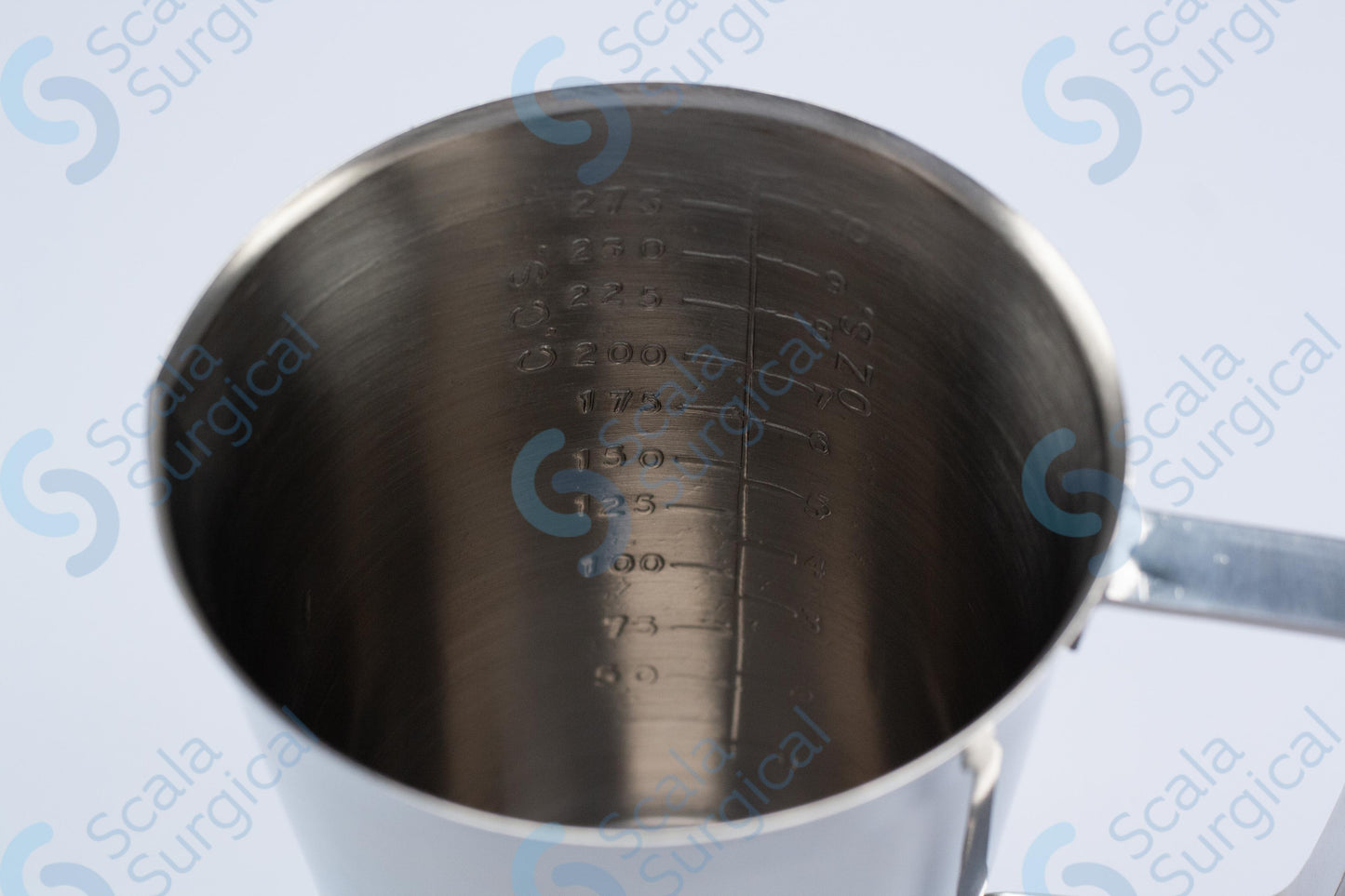 This item is a jug that is used to measure liquids during surgery. It is internally graduated, meaning that it is marked with measurements inside so that the user can easily read the amount of liquid in the jug. The jug has a capacity of 250 ml.