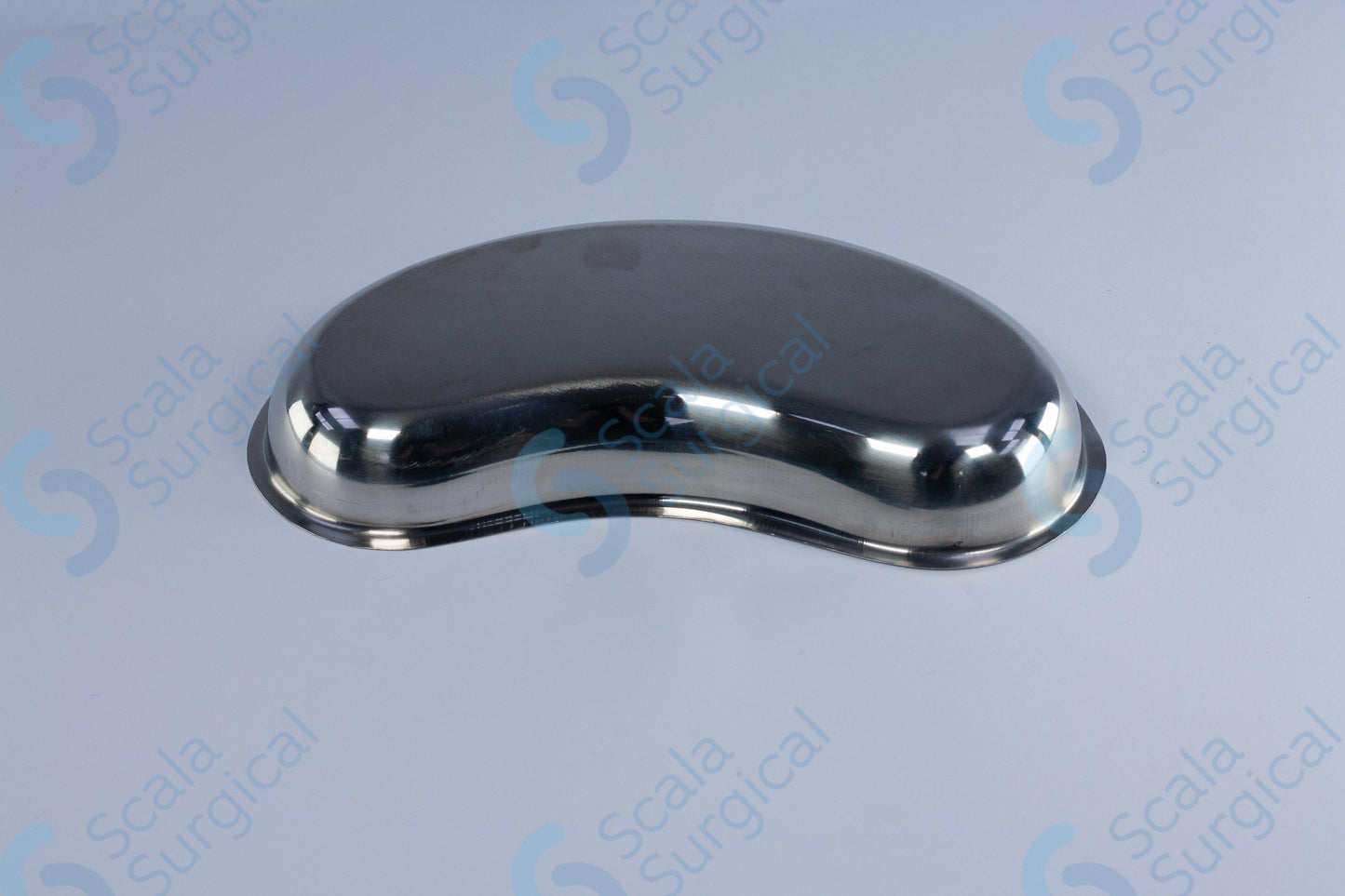 A kidney dish with a flat base and straight edges without a lid is typically used to hold surgical instruments during surgery or to contain tissues or organs during the procedure. It is also used to collect blood and body fluids during surgery.