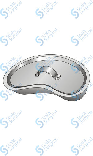 A kidney dish with a flat base and straight edges with a lid is used to contain and transport medical instruments and other items in the surgical field. The lid helps to keep the items contained and prevent them from spilling or becoming contaminated. The size of the dish, in this case, 304.8mm (12 inch) is typically used for larger instruments and items.