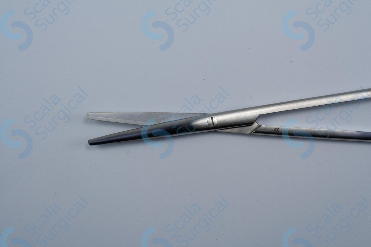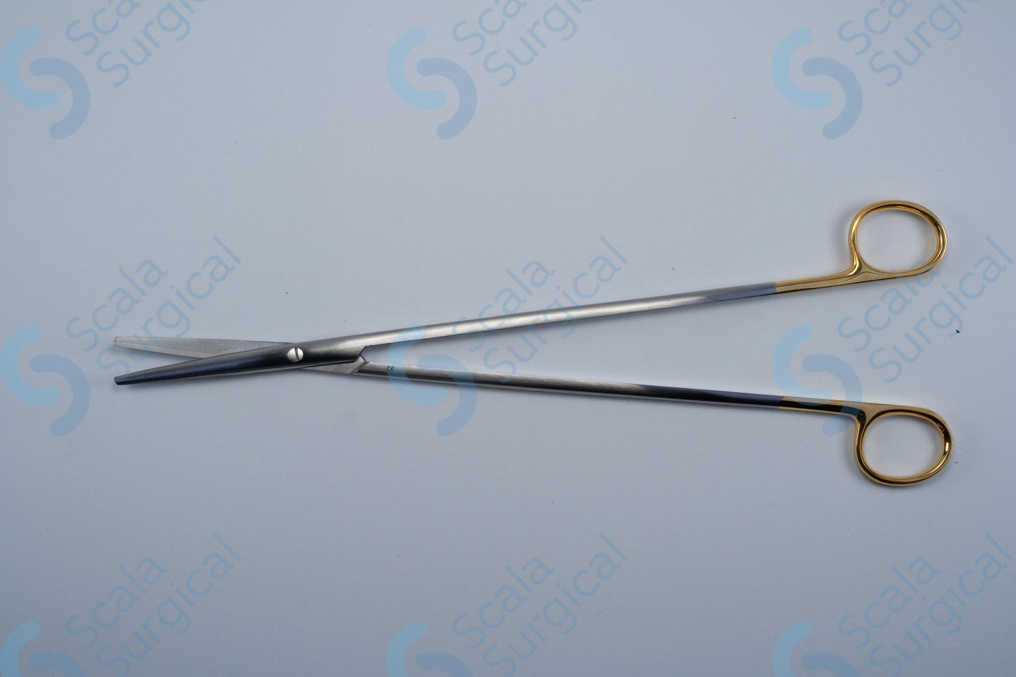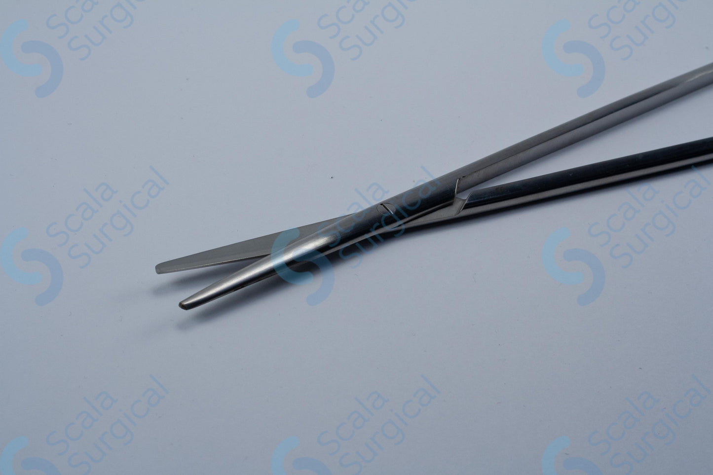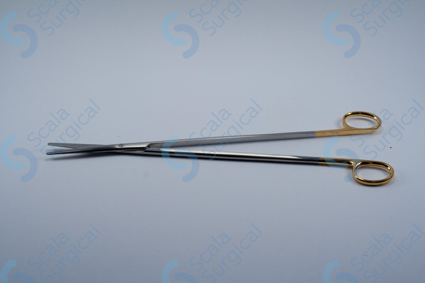 Metzenbaum scissors are surgical scissors used for cutting delicate tissue and sutures. They have tungsten carbide jaws, which are harder and more durable than stainless steel, allowing them to cut through tougher materials and last longer. The straight design of these scissors makes them ideal for cutting and trimming in tight spaces.