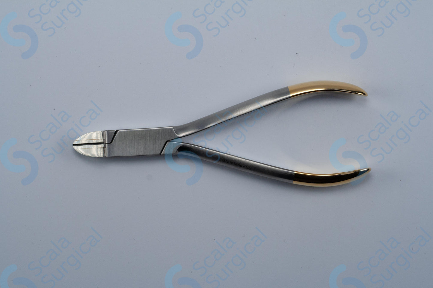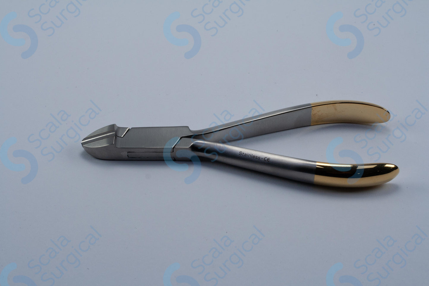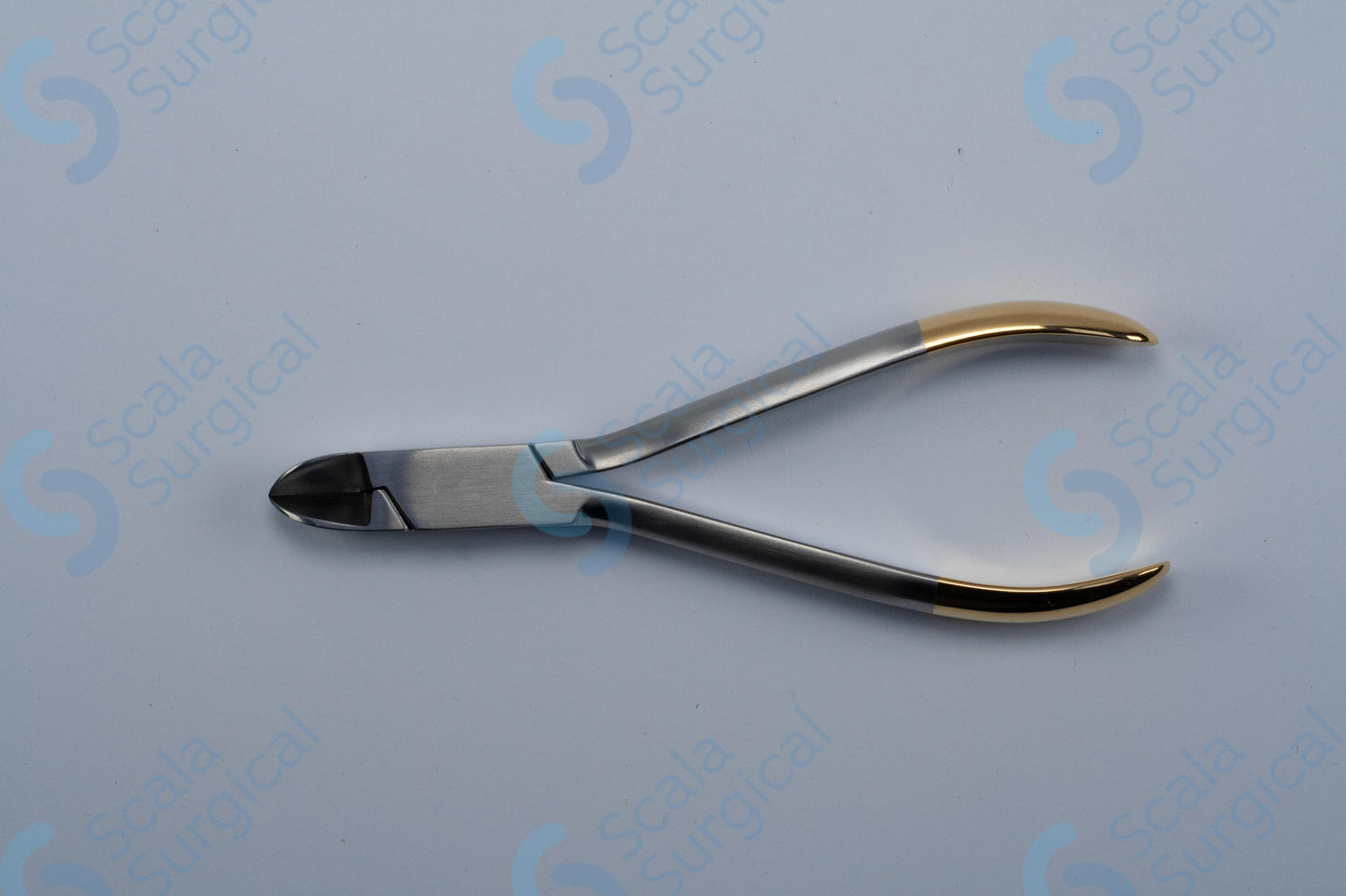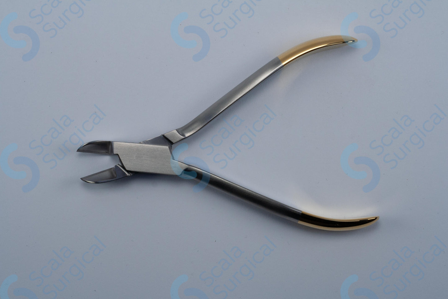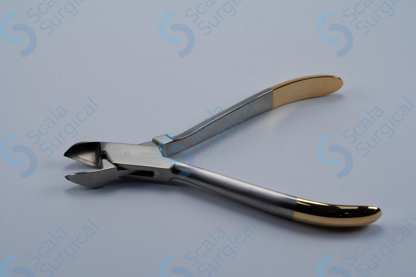 This wire cutter is used to cut through wires, such as sutures, in the surgical field. It features a simple action handle, tungsten carbide jaws, and a hardened cutting edge for precise and efficient cutting. The size of the cutter is 139.7mm (5? inch).