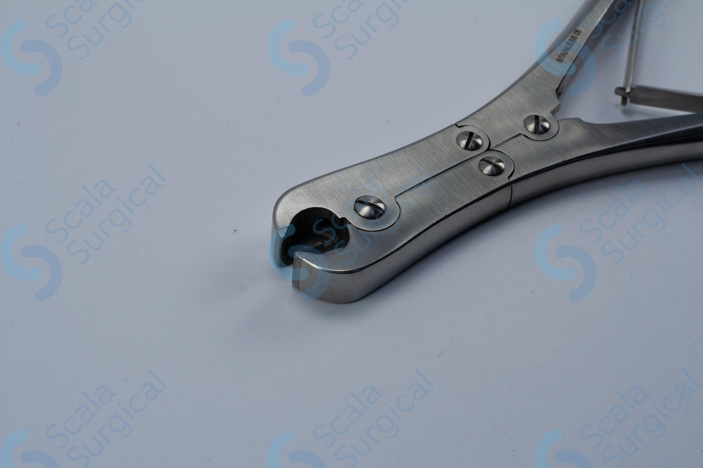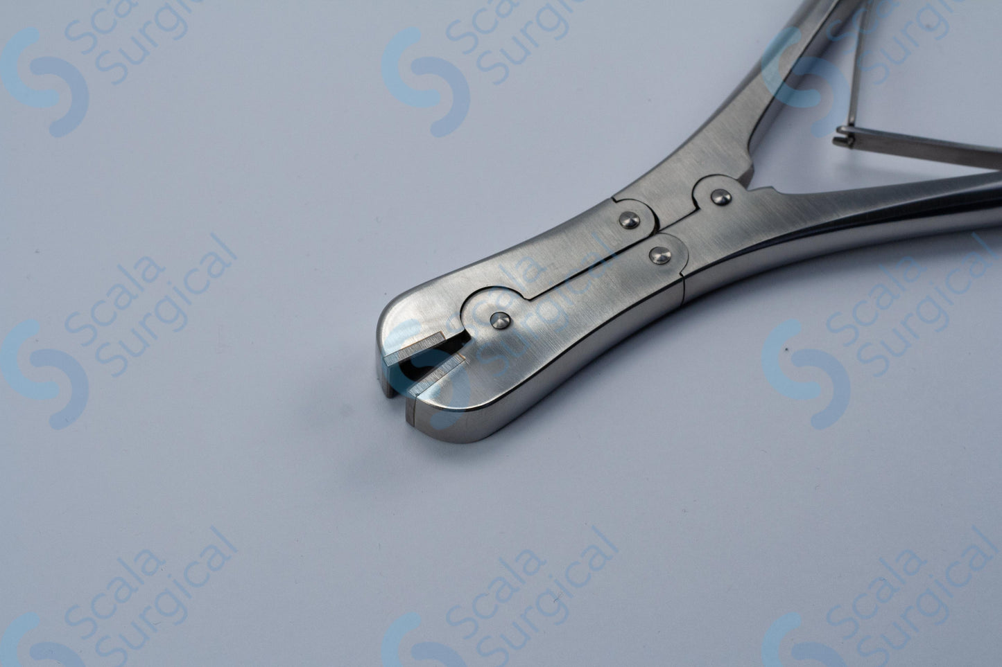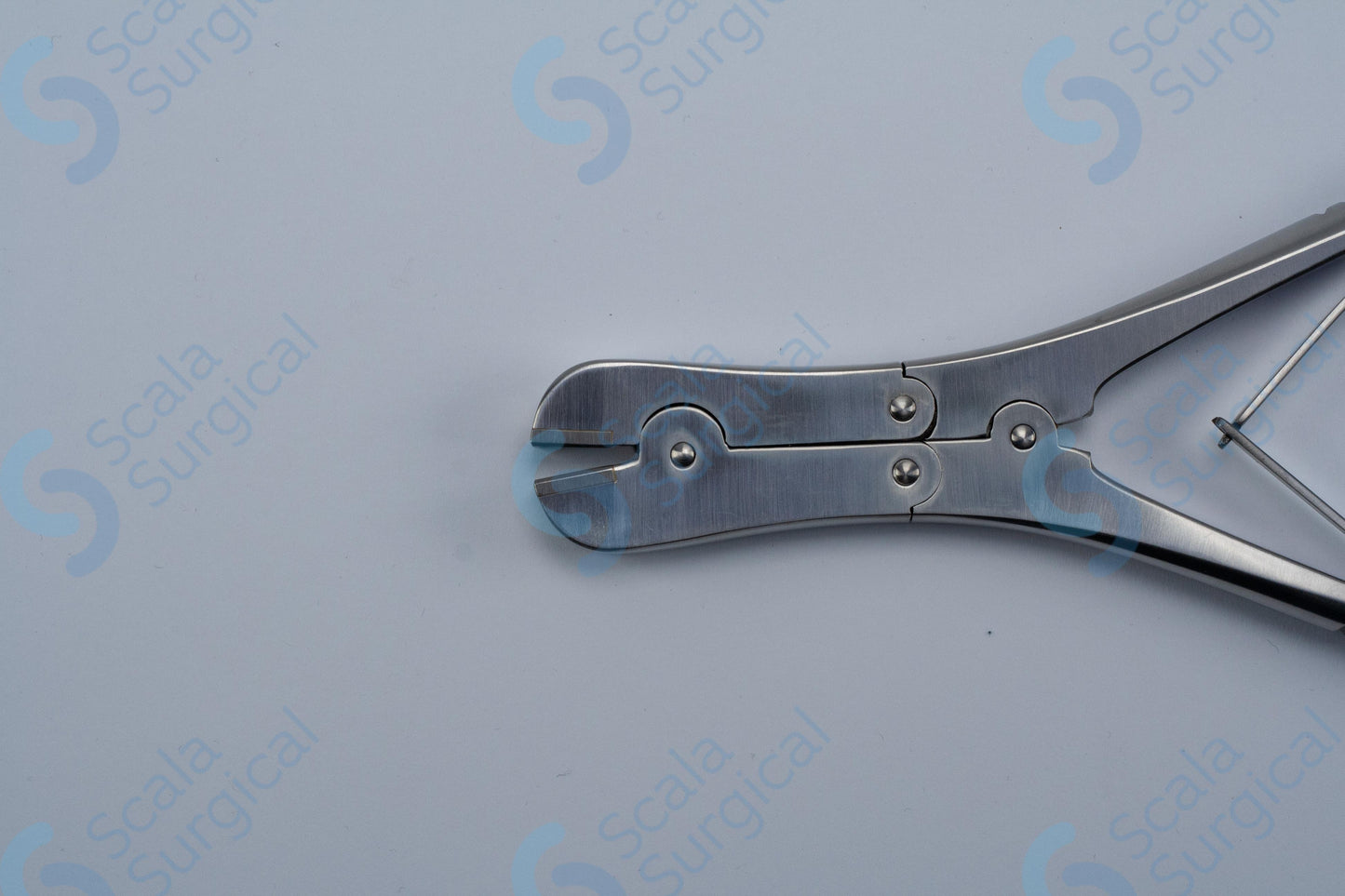 A wire cutter compound action handle TC jaws front and lateral cutting 177.8 mm is a surgical instrument used to cut wires and sutures with precision and accuracy. It has a compound action handle for better control and a TC jaw design for improved cutting performance. The 177.8 mm length allows for easier access to hard-to-reach areas.