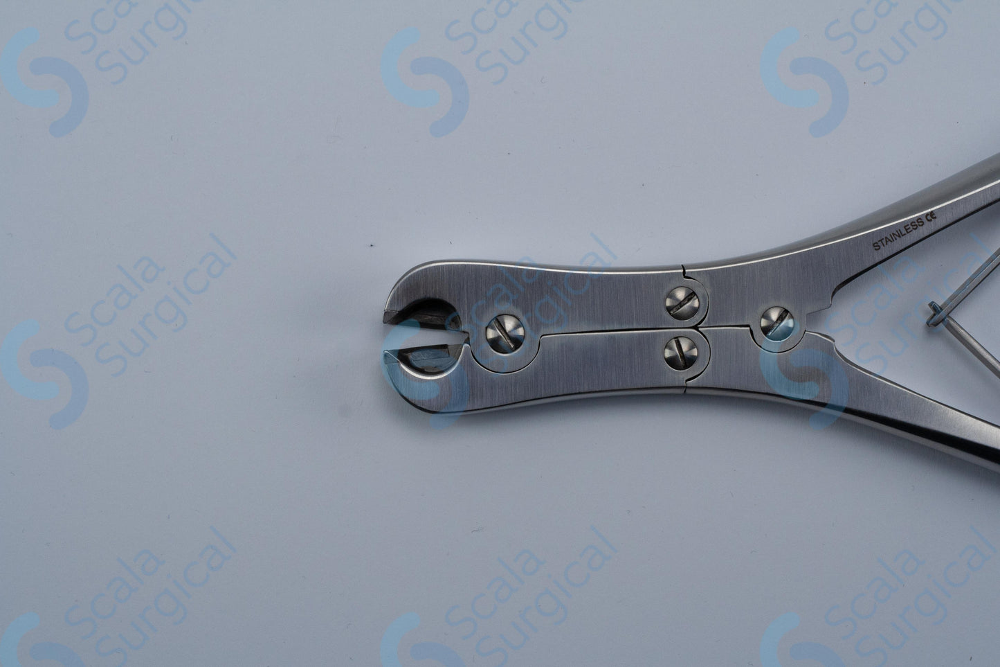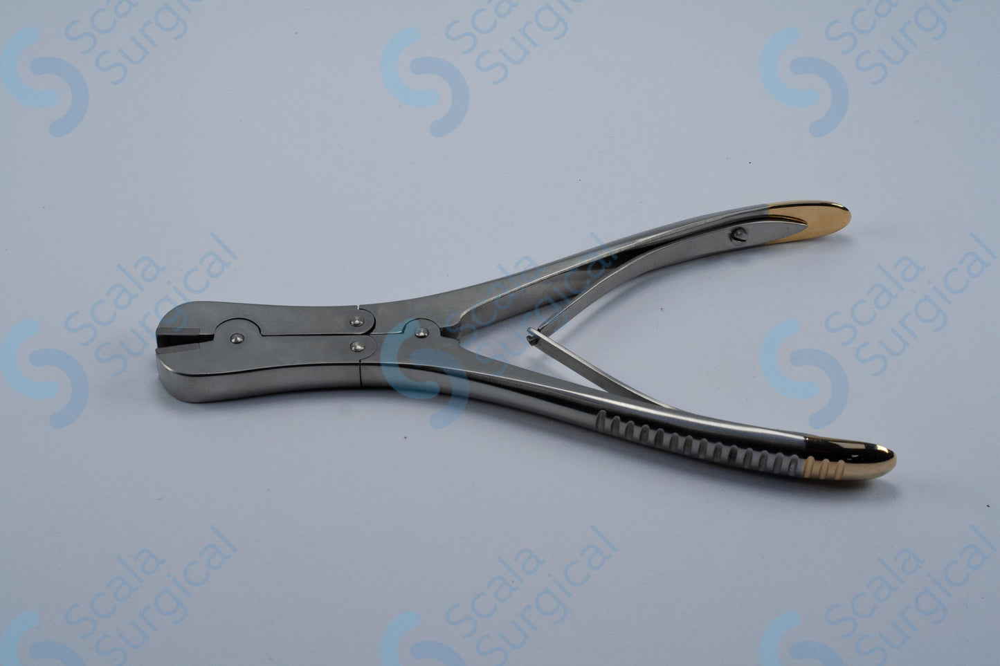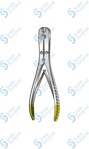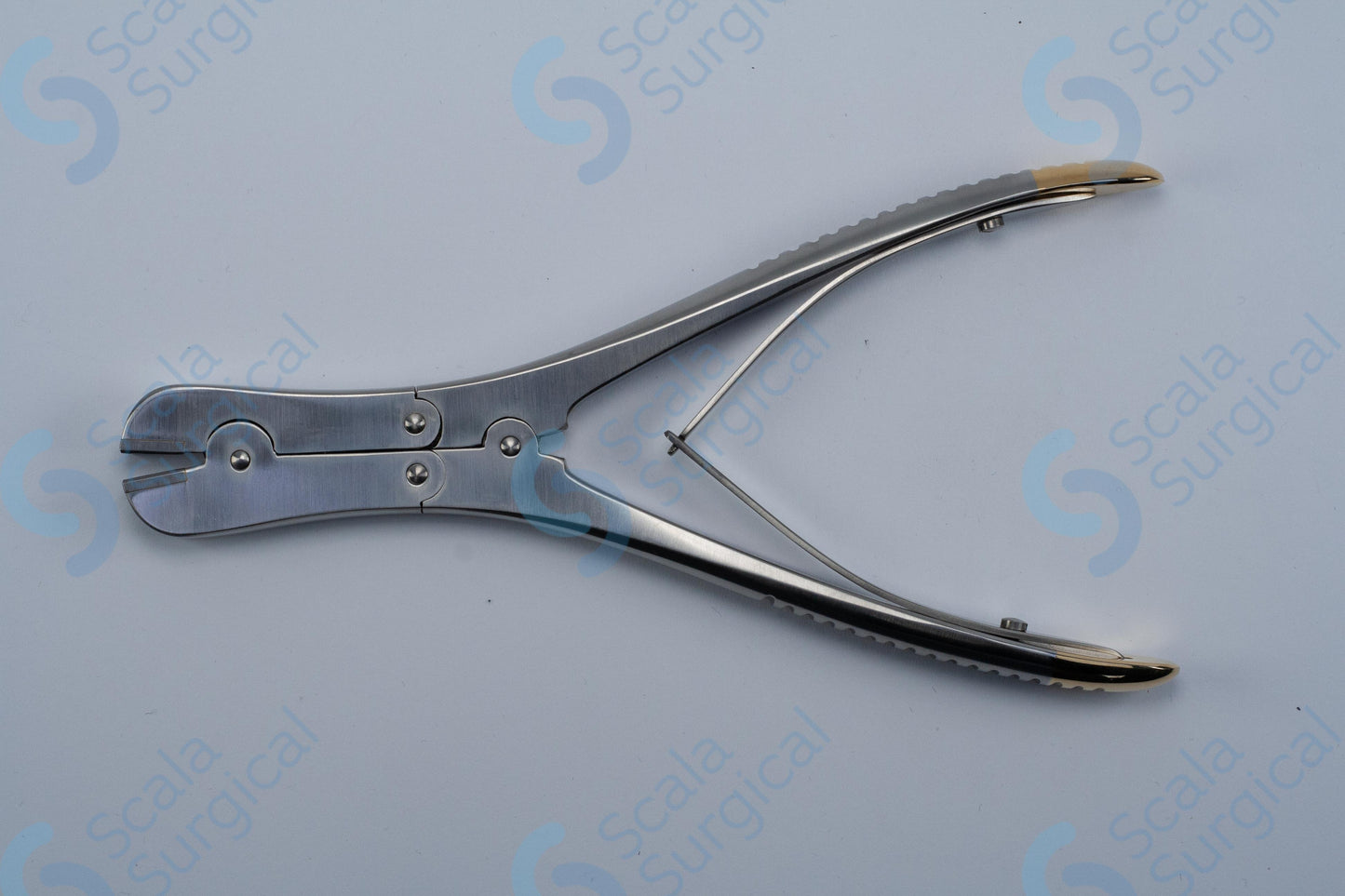 A wire cutter compound action handle TC jaws front and lateral cutting 177.8 mm is a surgical instrument used to cut wires and sutures with precision and accuracy. It has a compound action handle for better control and a TC jaw design for improved cutting performance. The 177.8 mm length allows for easier access to hard-to-reach areas.