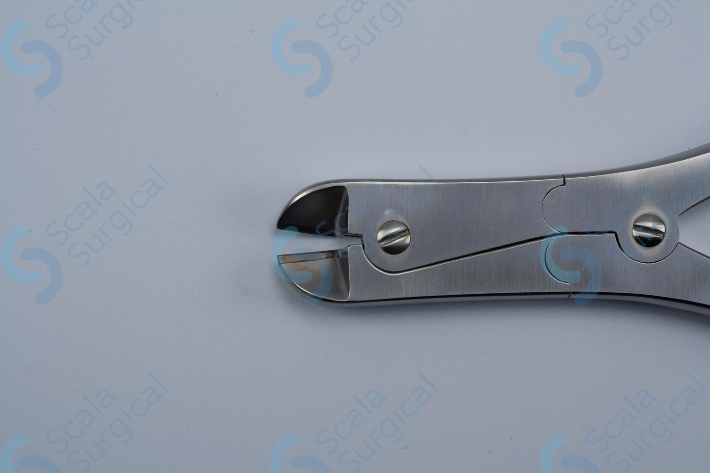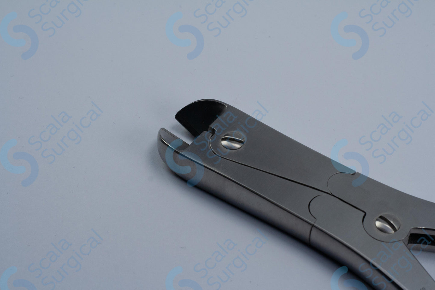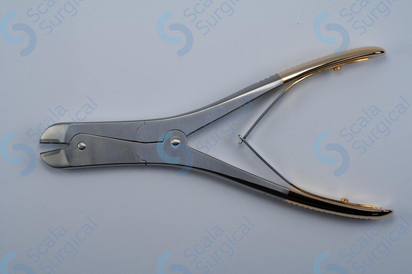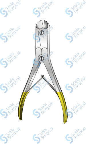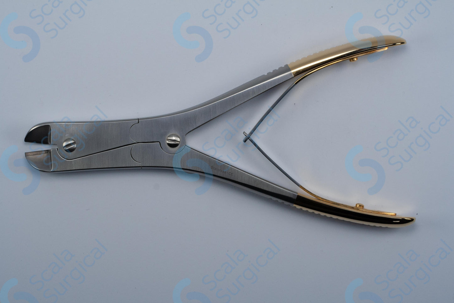 This wire cutter is designed to cut through metal wires in the surgical field. It has a compound action handle, tungsten carbide jaws, and lateral cutting capabilities. It is 234.95mm (9? inch) in length.