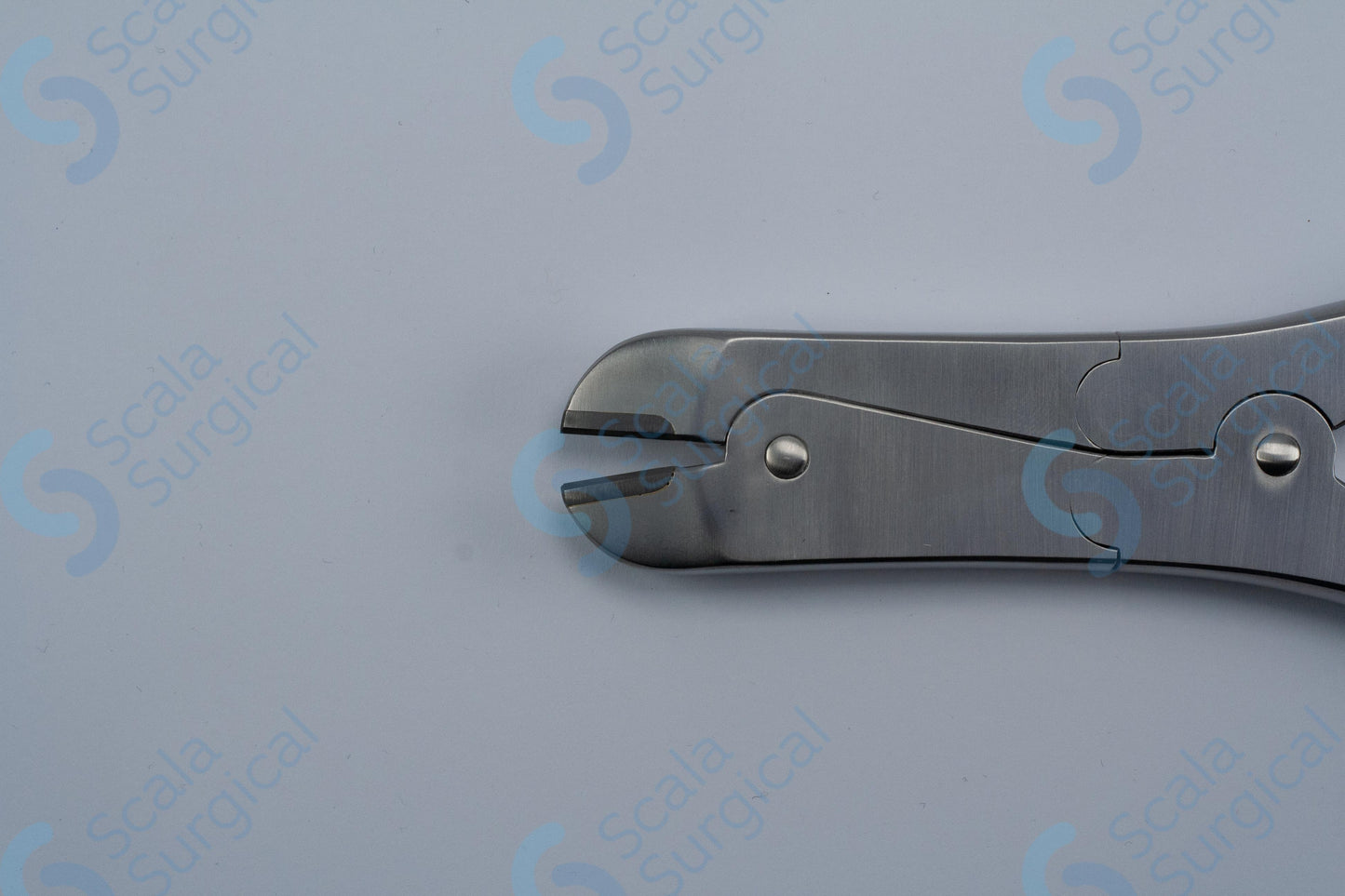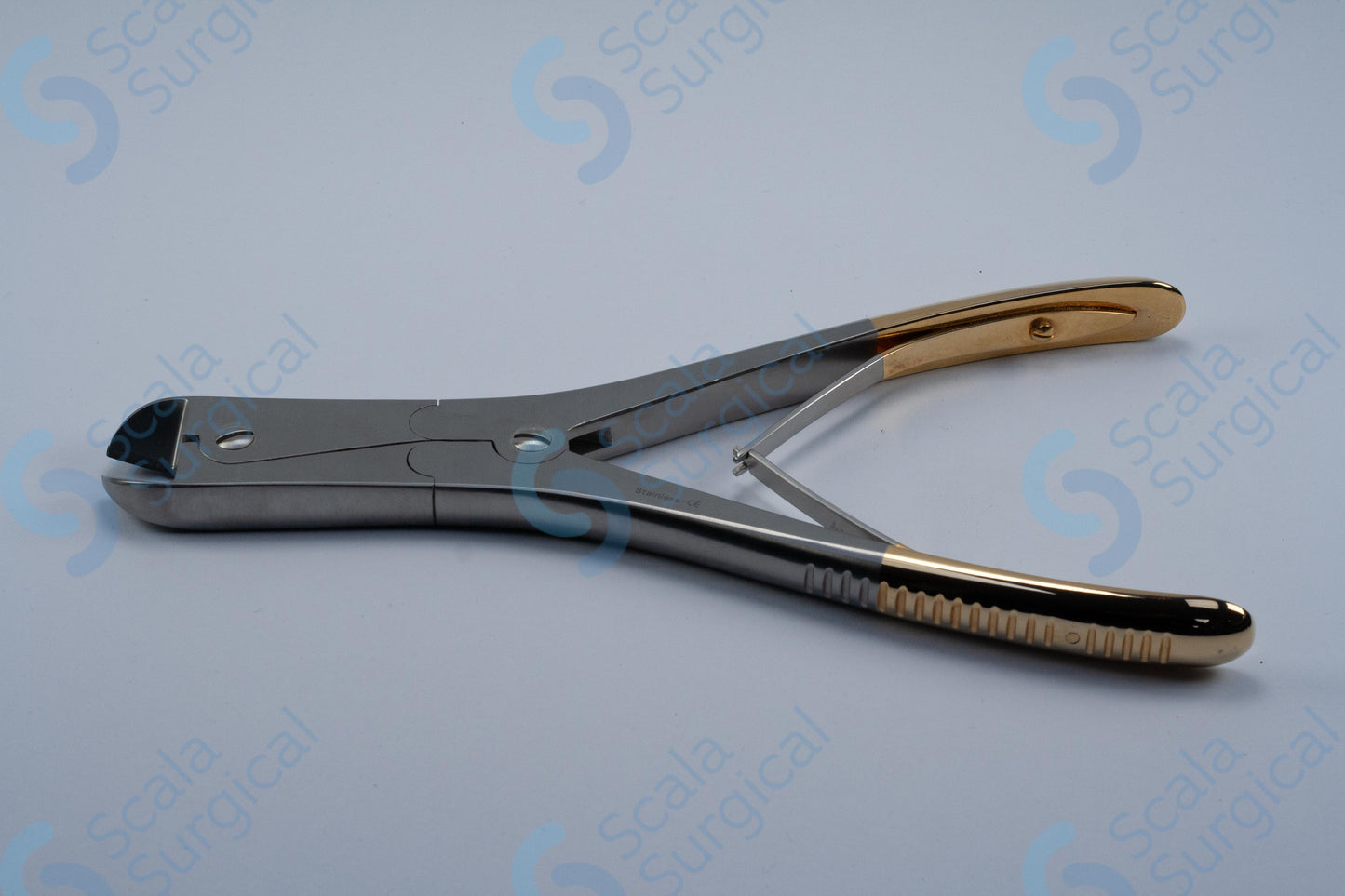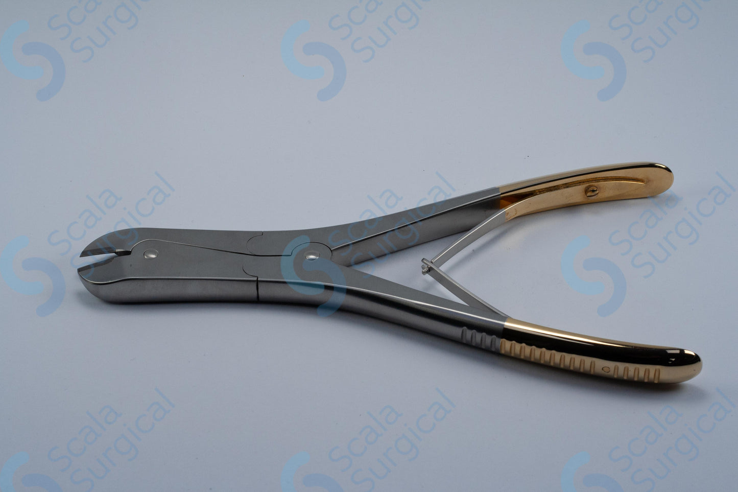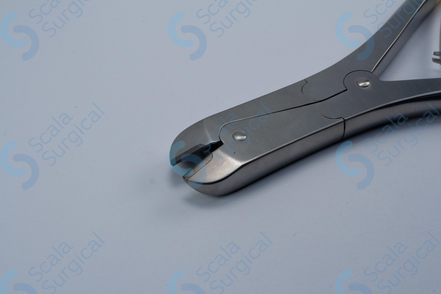 This wire cutter is designed to cut through metal wires in the surgical field. It has a compound action handle, tungsten carbide jaws, and lateral cutting capabilities. It is 234.95mm (9? inch) in length.