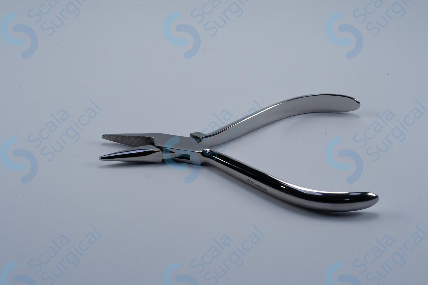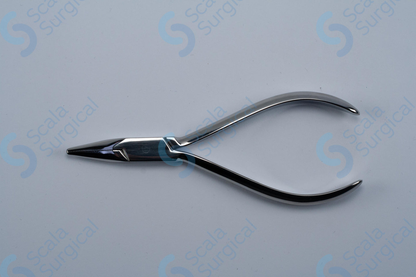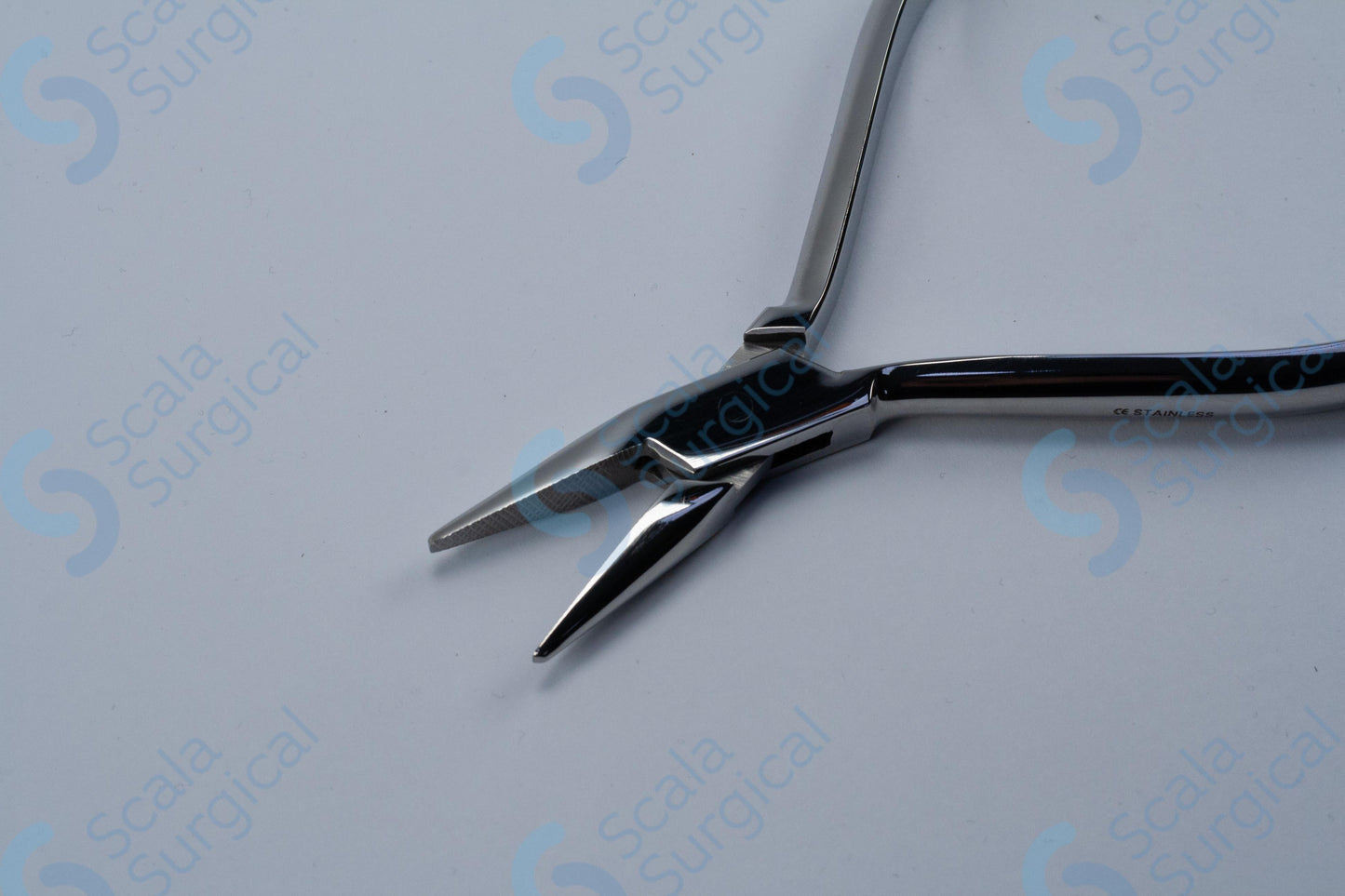 This type of plier is used for grasping, holding, and manipulating tissue during surgical procedures. The criss-cross serrations and pointed tip allow for precise control and manipulation of delicate tissue.