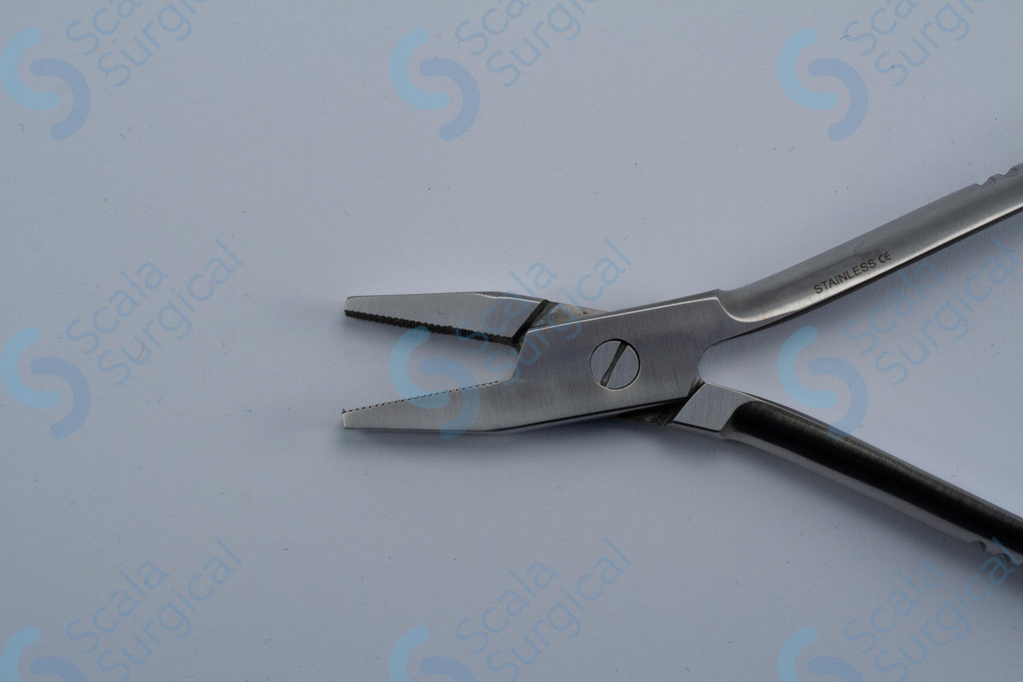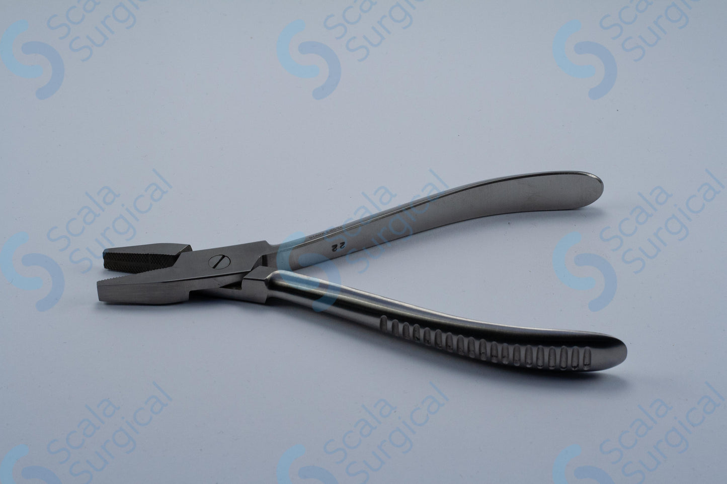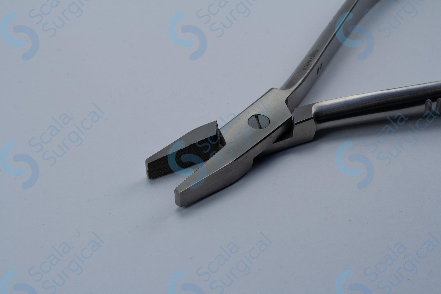 This type of plier is used for grasping and manipulating tissue in the surgical field. The criss-cross serrations and longitudinal and transversal groove allow for a secure grip while the flat tip allows for precise control. The length of the plier is 171.45mm (6? inch).