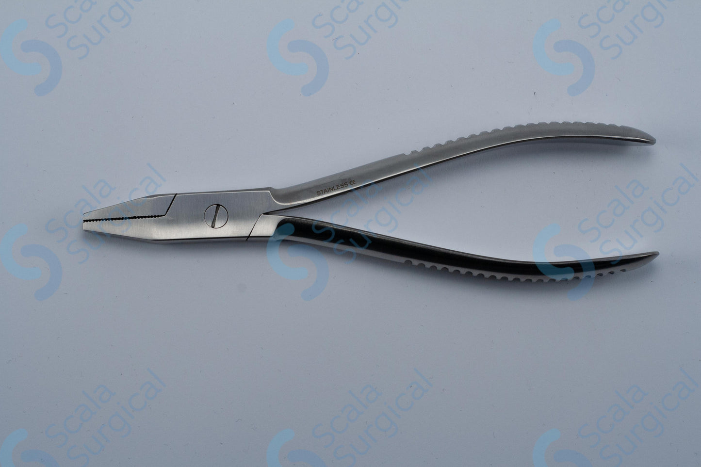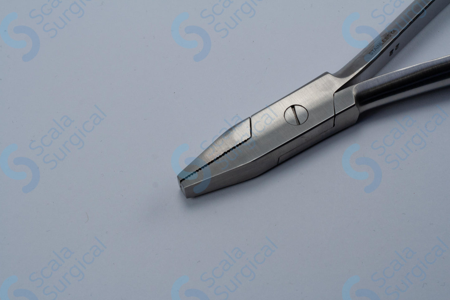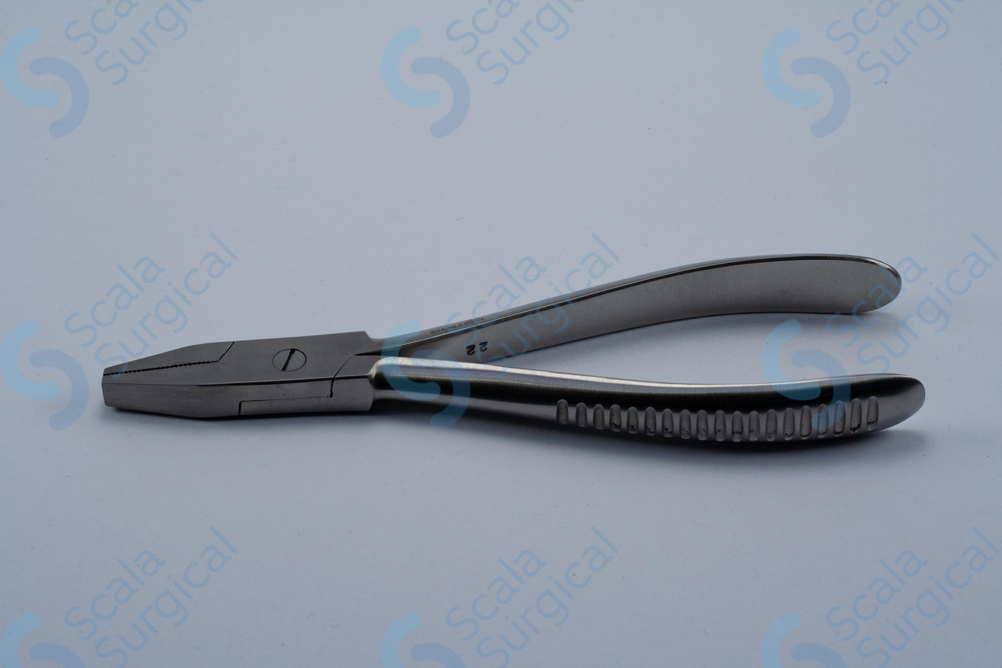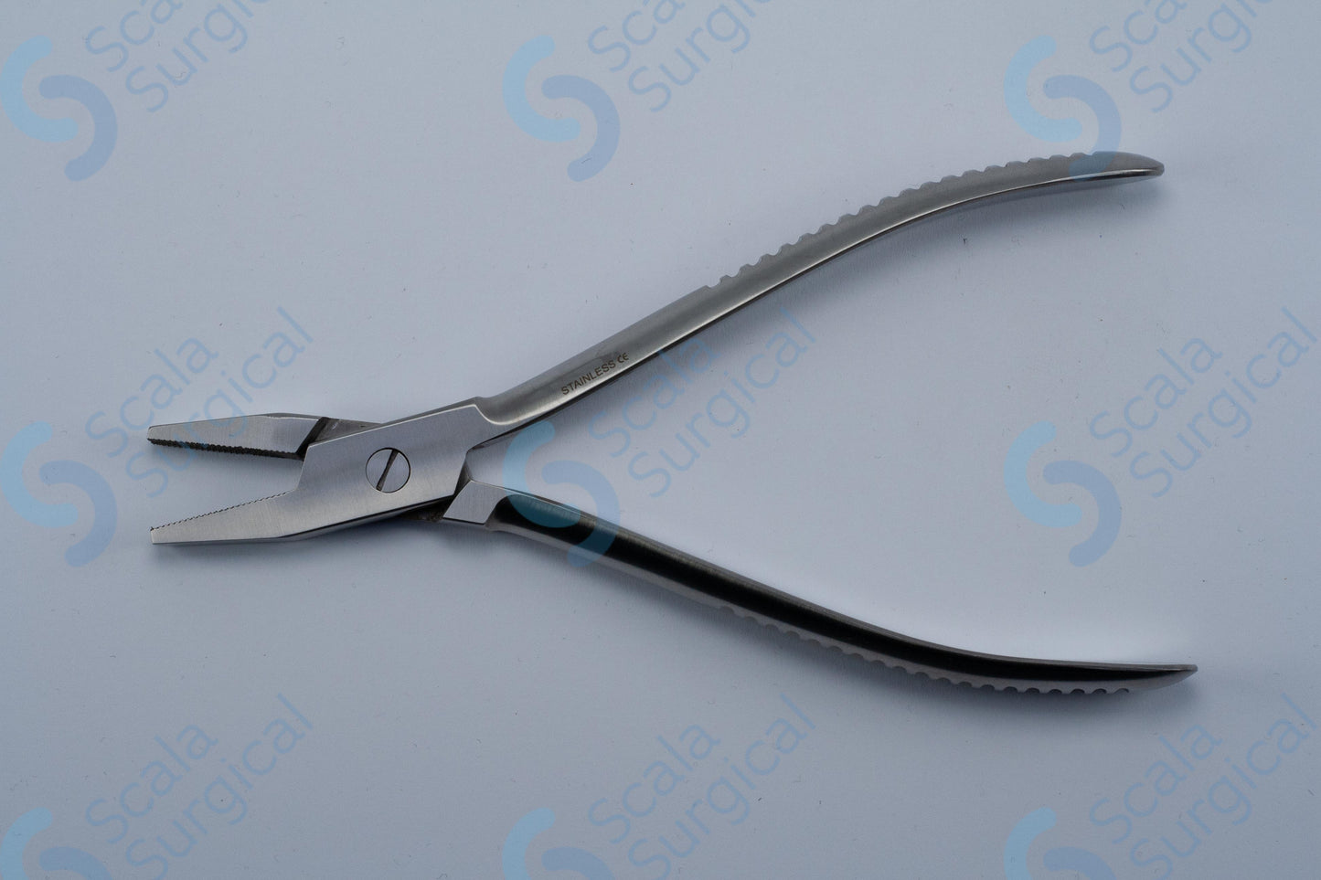 This type of plier is used for grasping and manipulating tissue in the surgical field. The criss-cross serrations and longitudinal and transversal groove allow for a secure grip while the flat tip allows for precise control. The length of the plier is 171.45mm (6? inch).