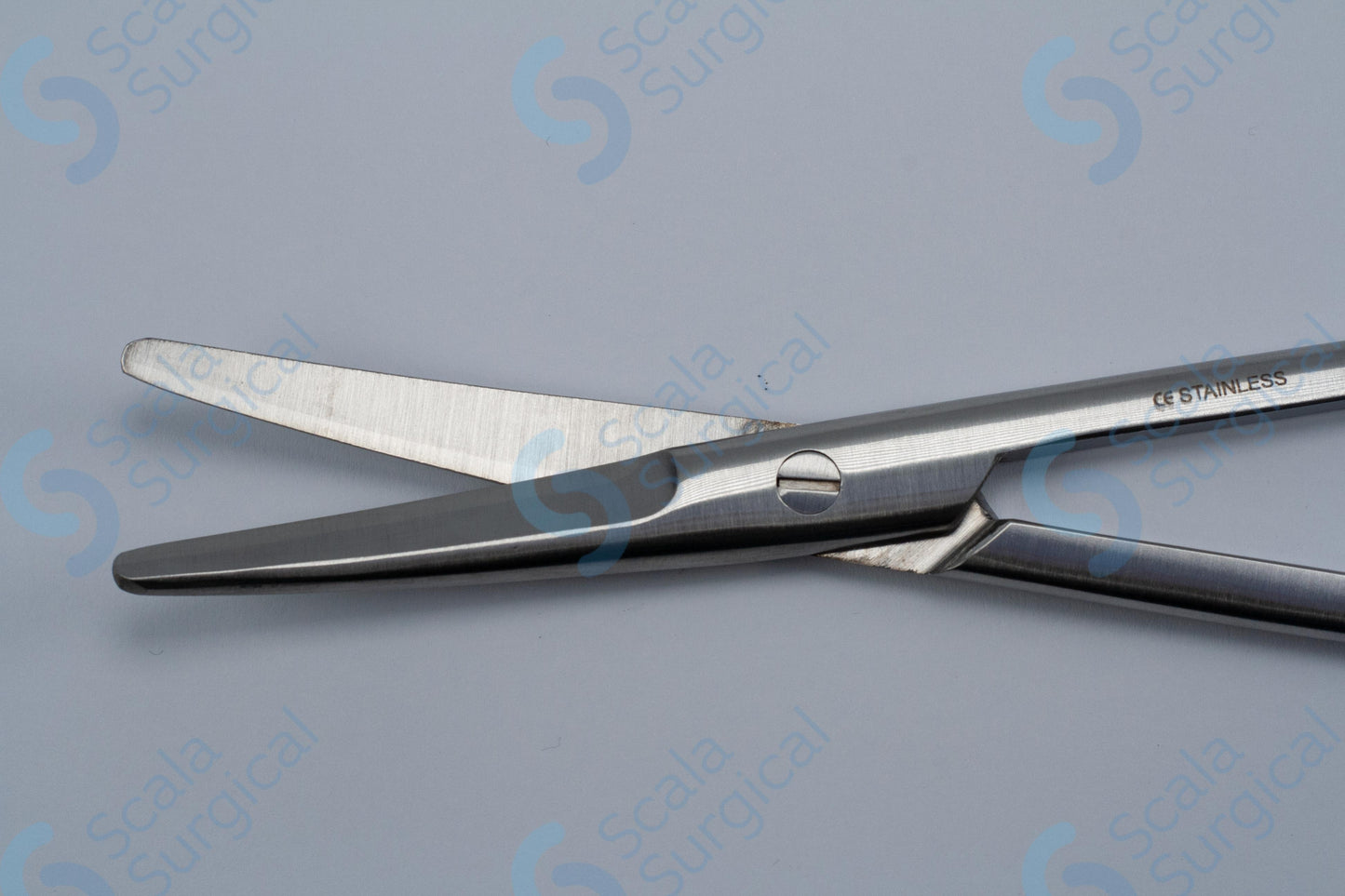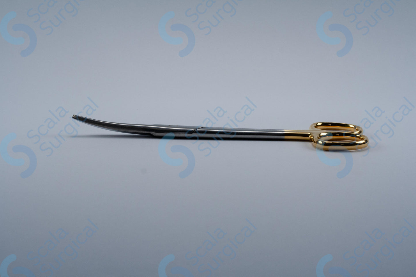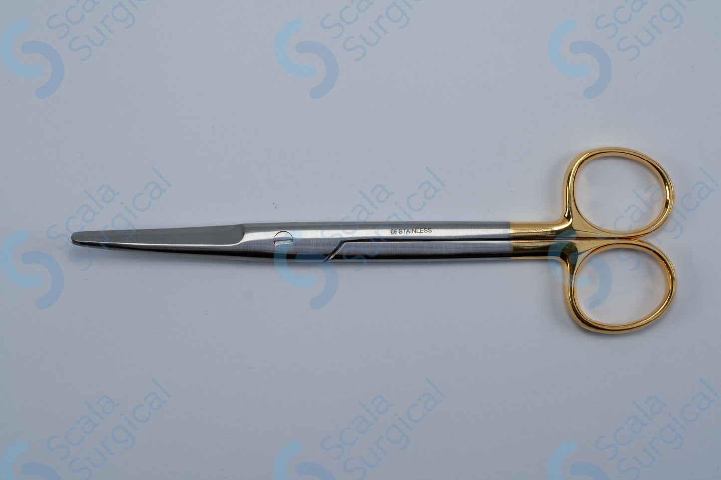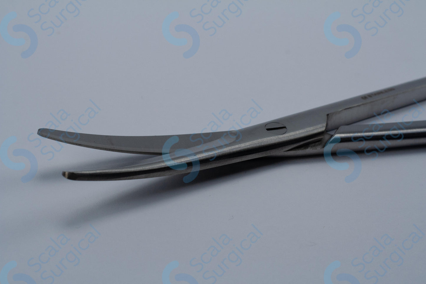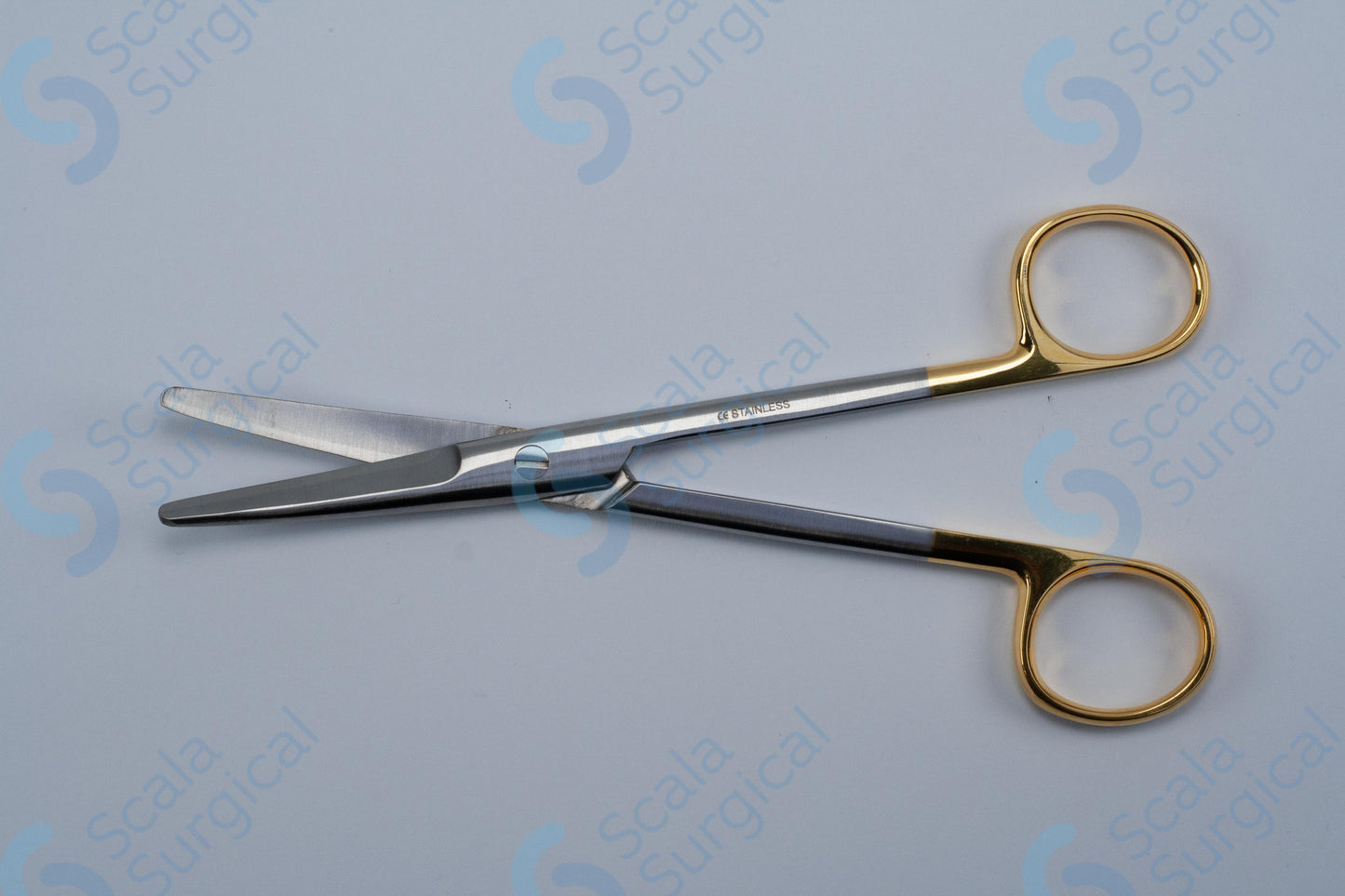 Mayo scissors with tungsten carbide jaws are used in the surgical field for cutting fine tissue and sutures. The curved shape of the scissors allows for precise cutting and maneuvering of the tissue.