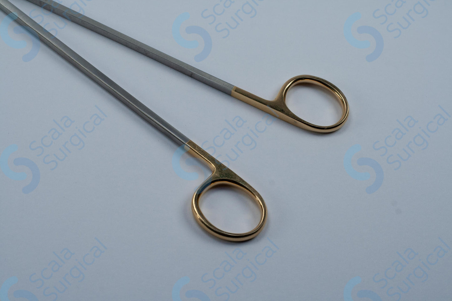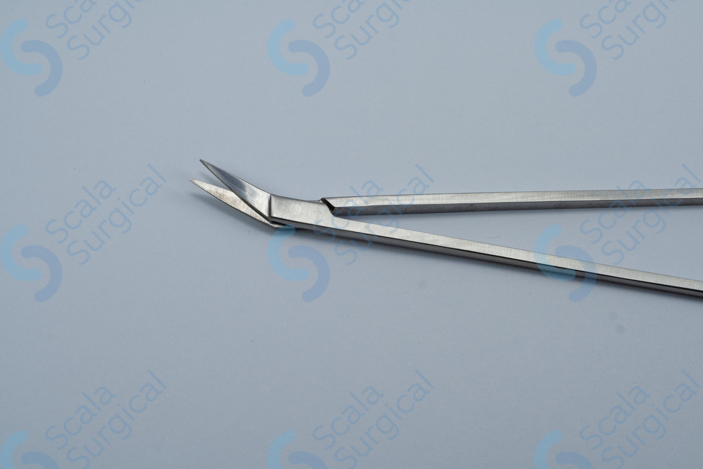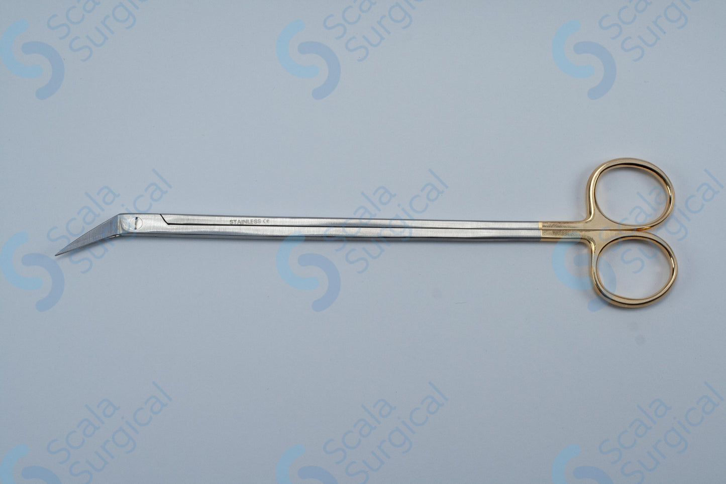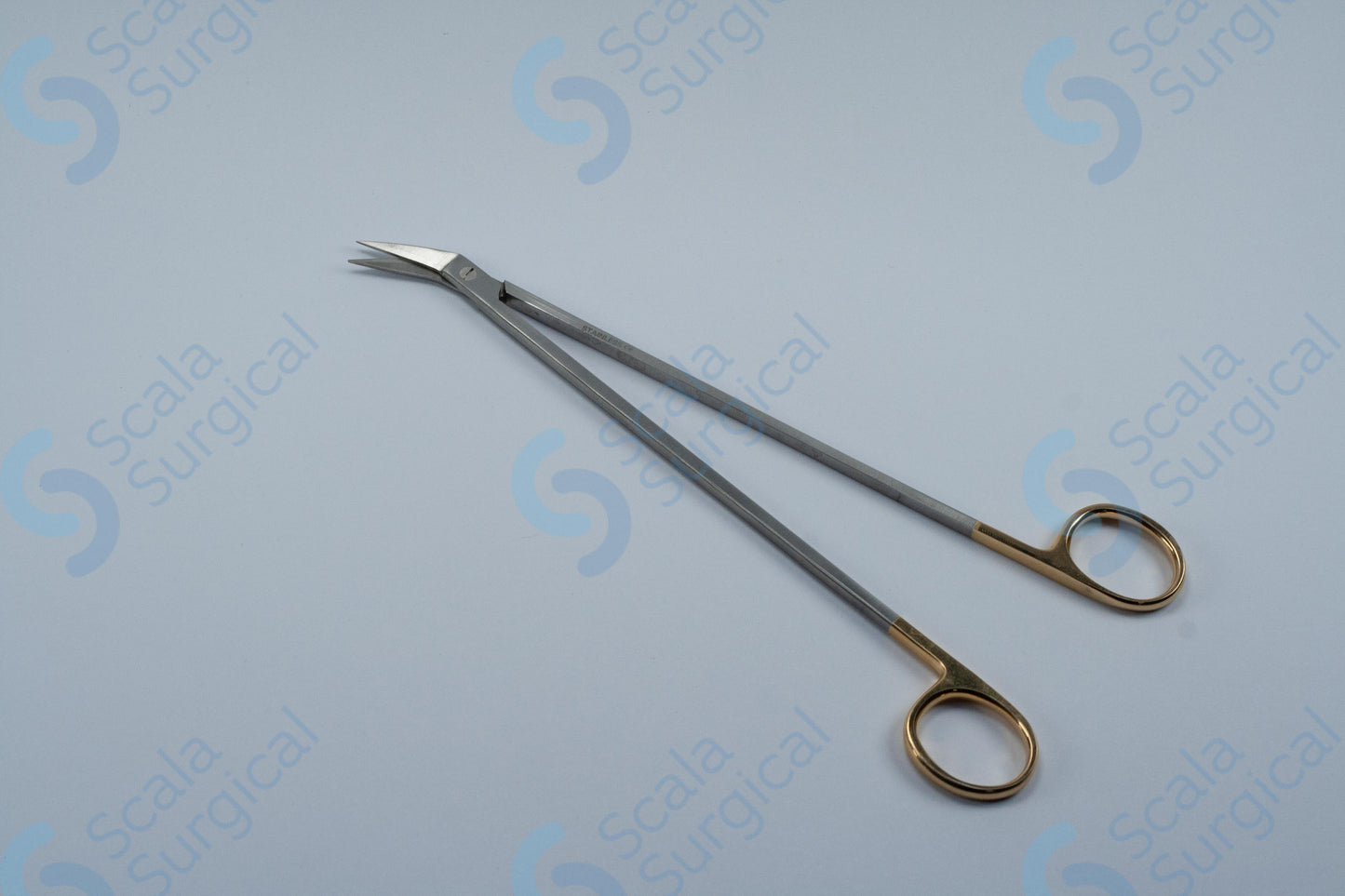 Pott-Smith Scissors are a type of surgical scissors with tungsten carbide jaws that are angled 25 degrees to the side. They are used for cutting and dissecting tissue during surgical procedures.