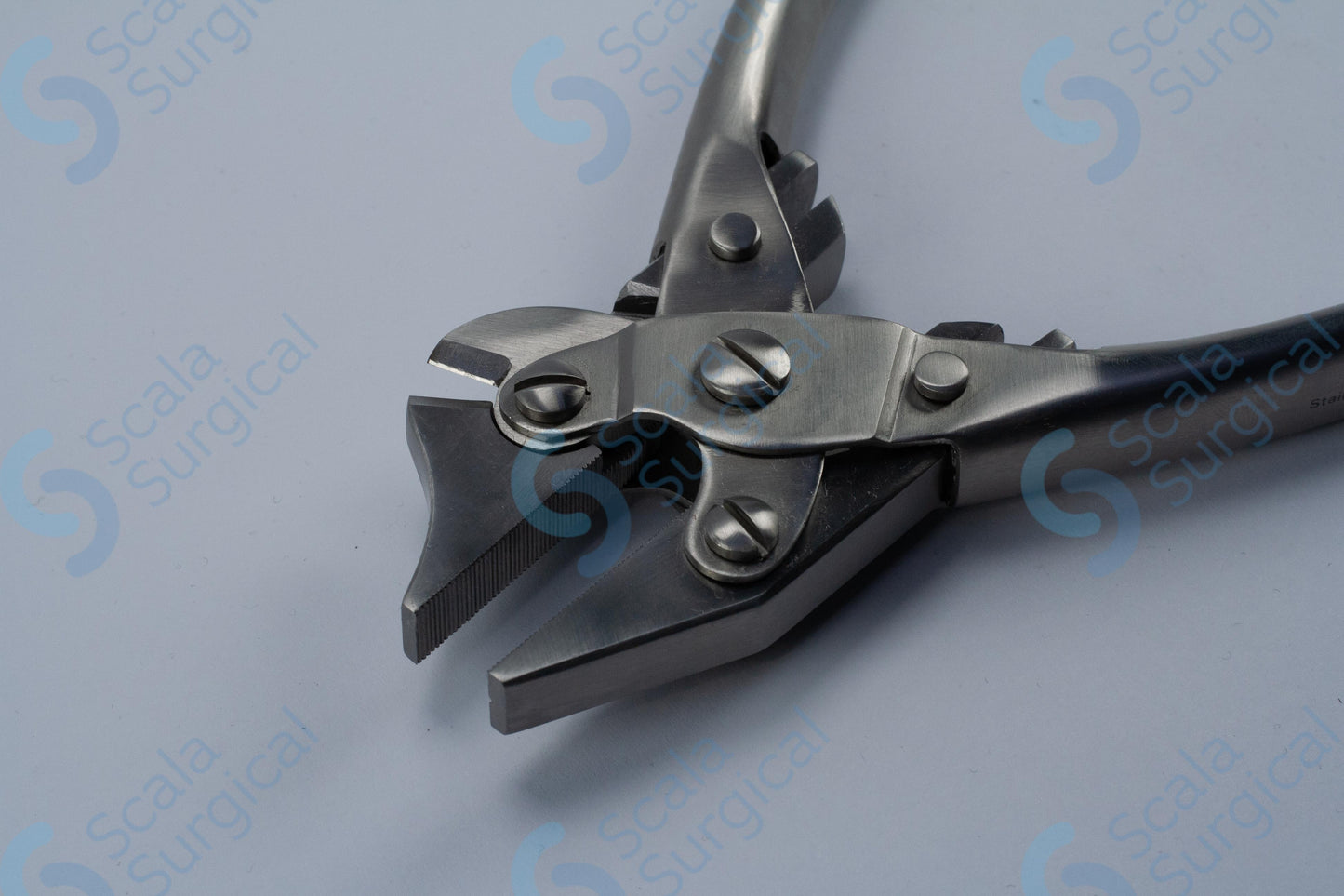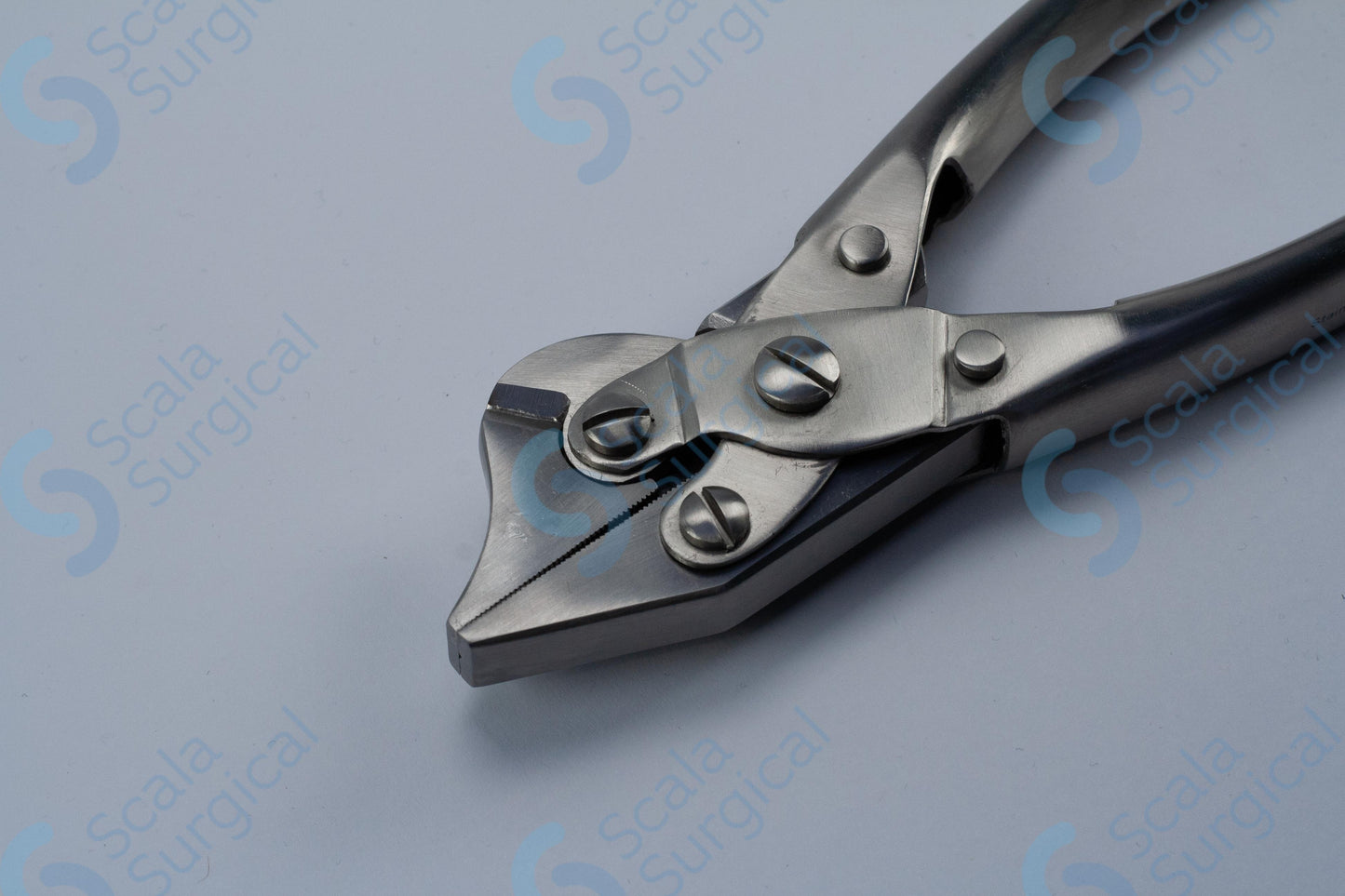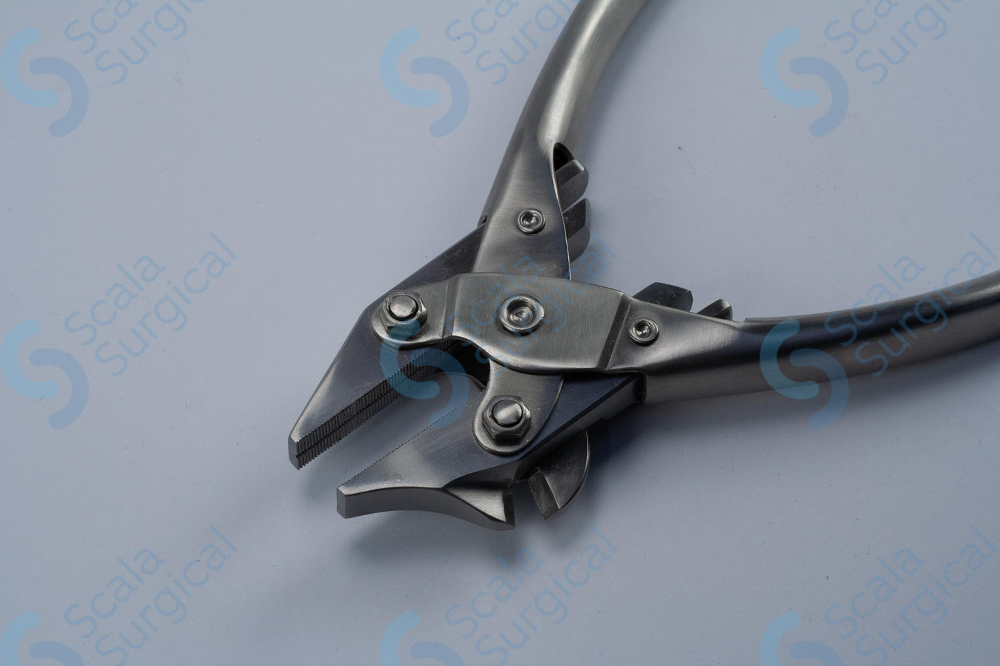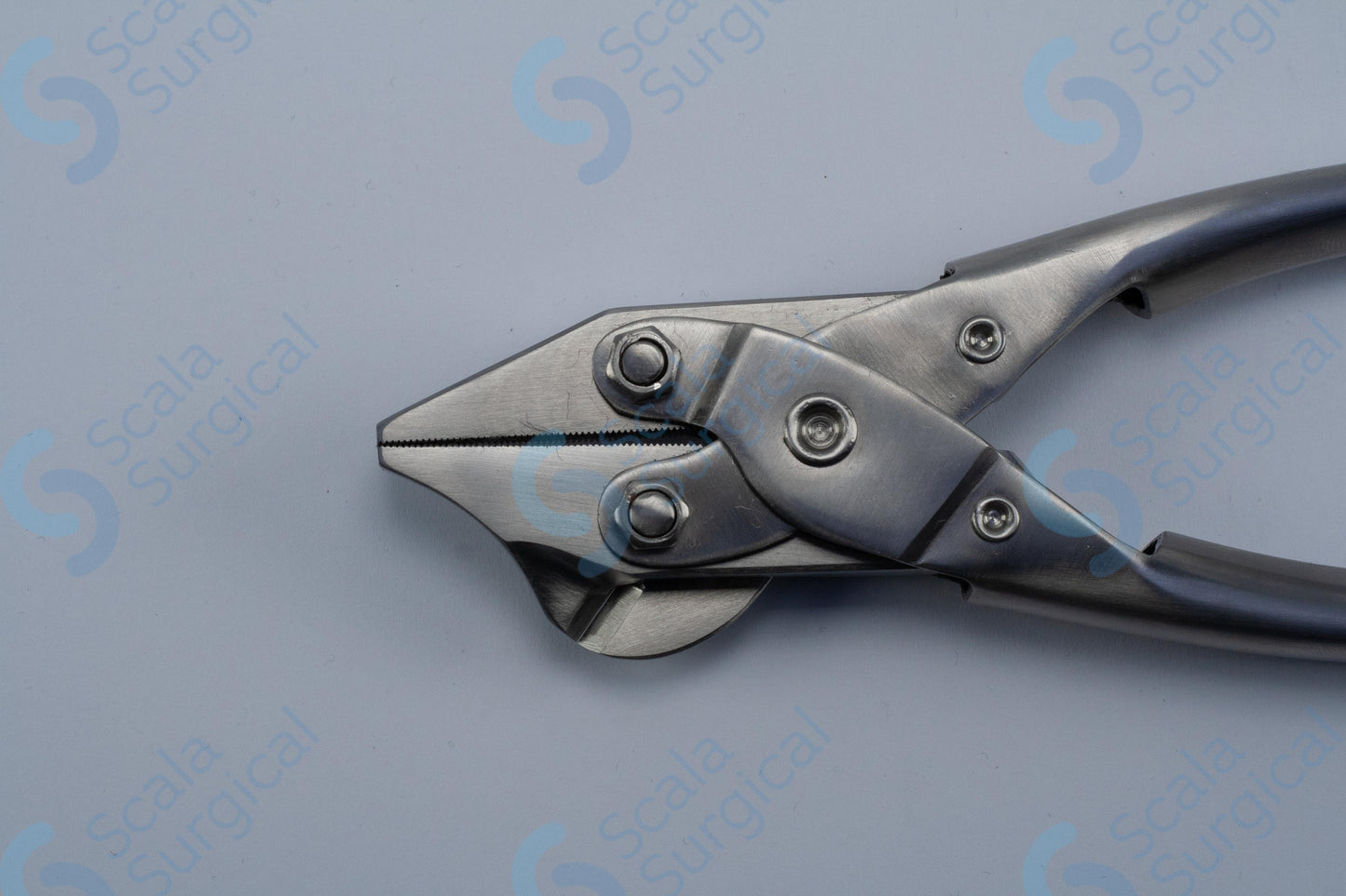 This type of plier is used for a variety of surgical procedures, such as cutting sutures, clamping vessels, and dissecting tissue. The flat nose and horizontal serrations allow for precise gripping of delicate tissue, while the side cutter allows for cutting of sutures and other materials.