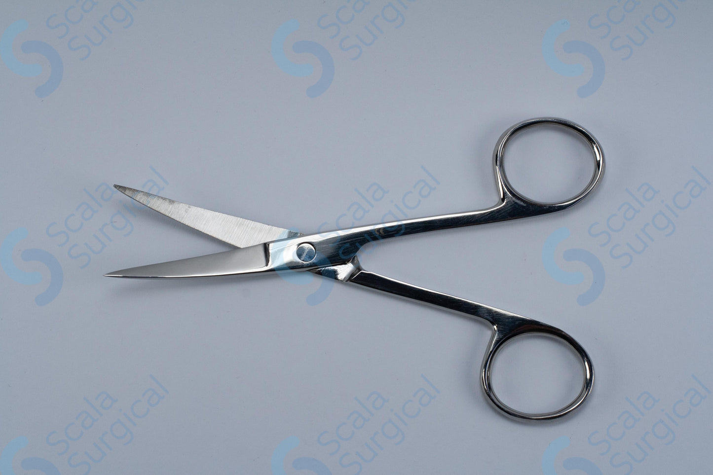 Dressing / Stitch Scissors Sharp / Sharp Curved (127mm) (5 inch) are used in the surgical field to cut sutures or dressings. They are designed to be sharp enough to cut through tough materials while still providing a precise cut. The curved blades make it easier to maneuver around tight corners and difficult to reach areas. The 127mm (5 inch) size is a popular size for a variety of surgical procedures.