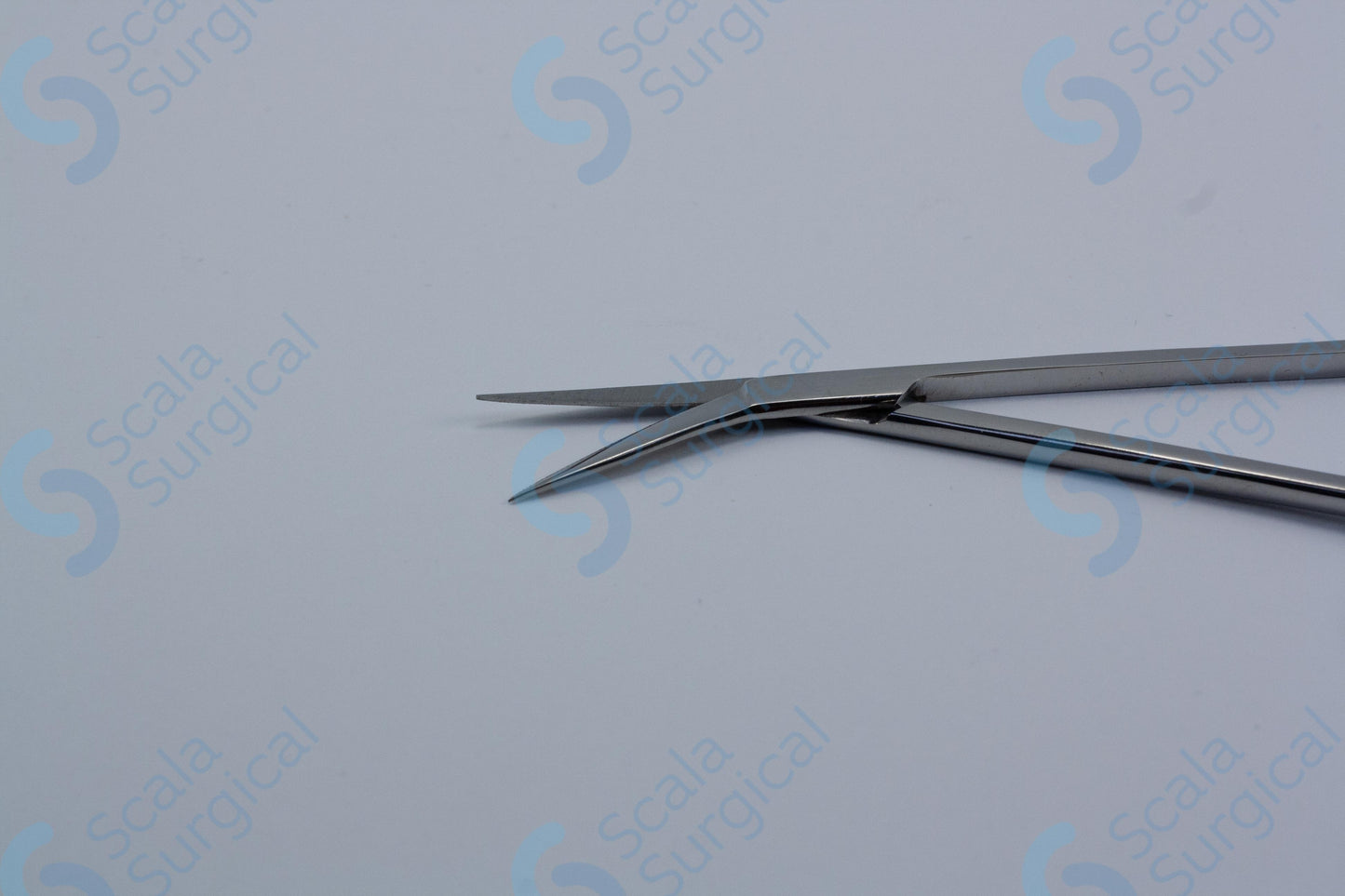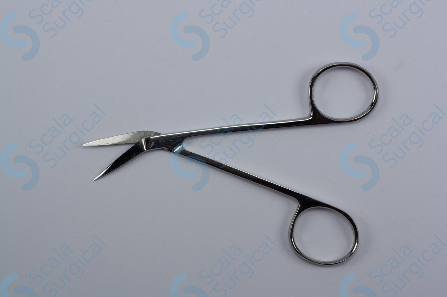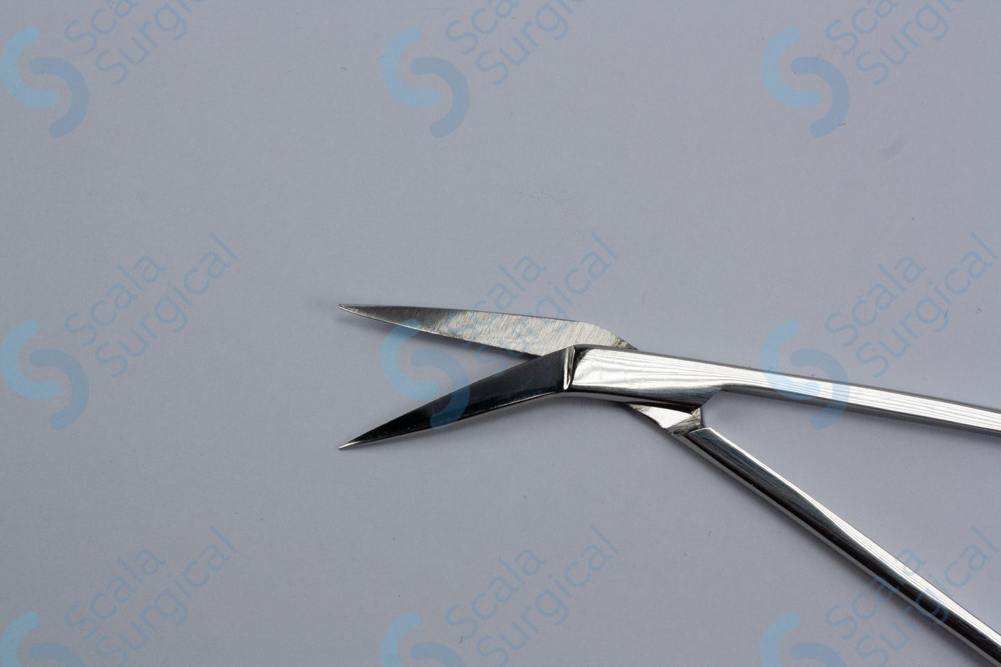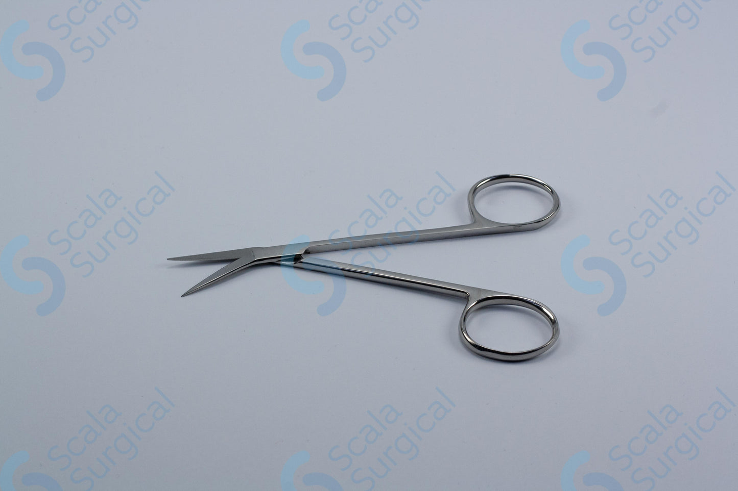 Iris scissors are a type of surgical scissors used in ophthalmic surgery. They are used to make precise cuts in delicate tissue, such as the iris of the eye, and are characterized by their angled blades and sharp tips.