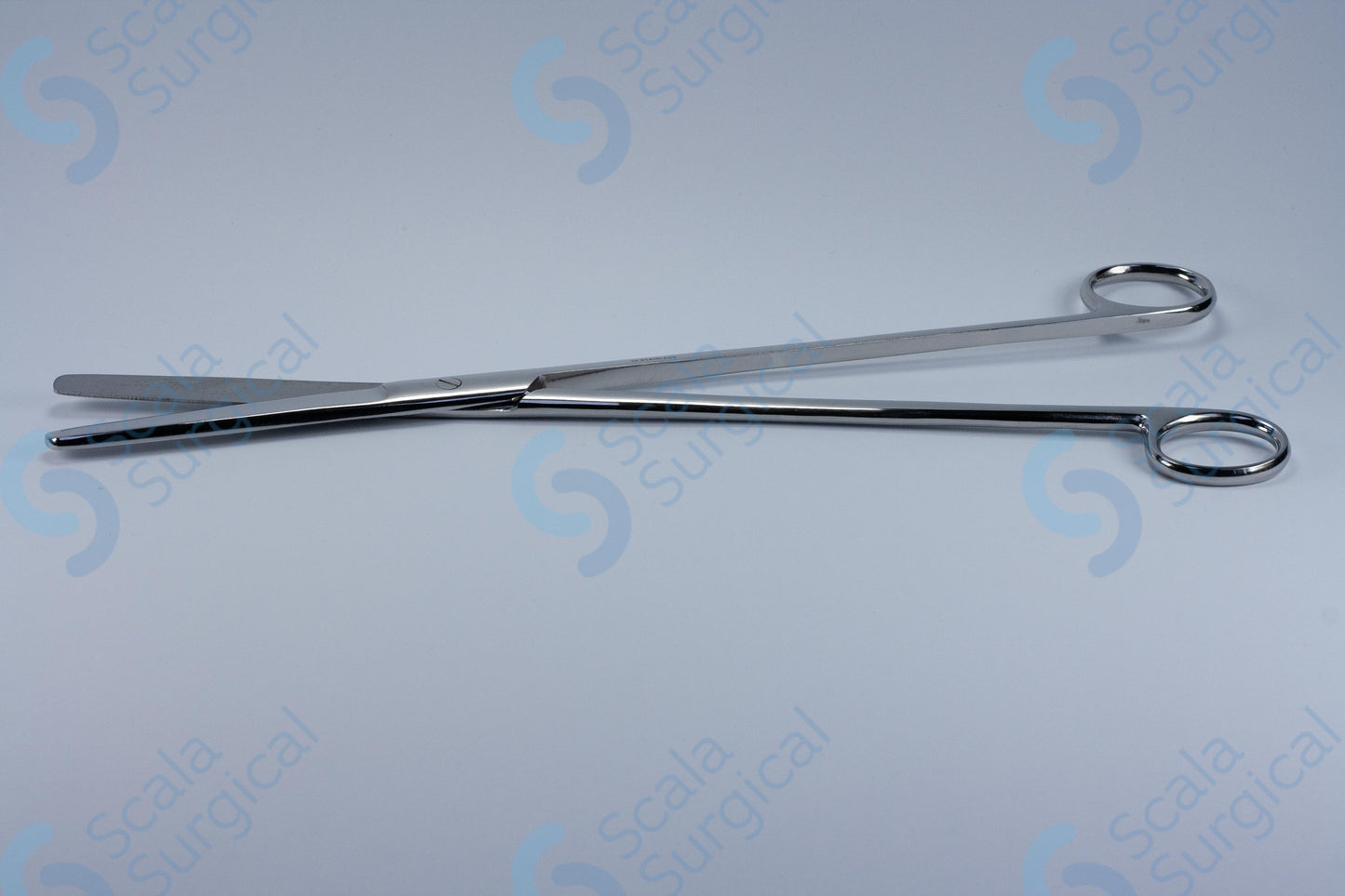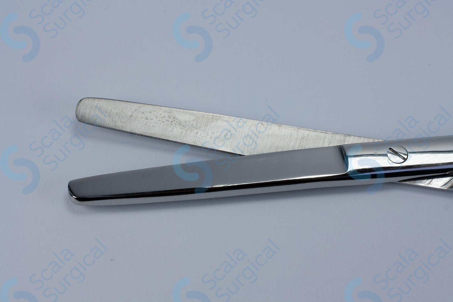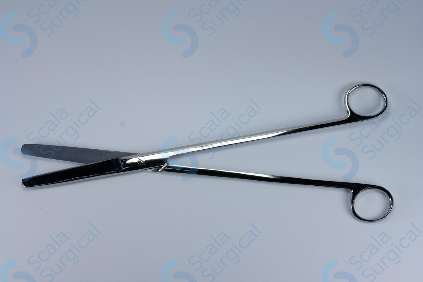 Dressing scissors blunt / blunt straight (305mm) (12 inch) are a type of surgical scissors used to cut through medical dressings and bandages. They have a straight, blunt tip and are typically 305mm (12 inch) in length. They are designed to prevent accidental cuts to the patient's skin.