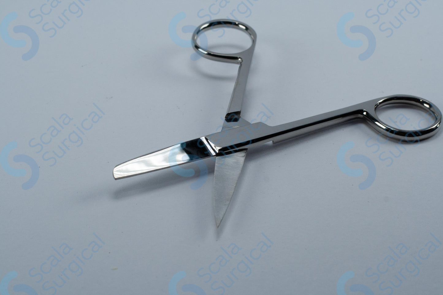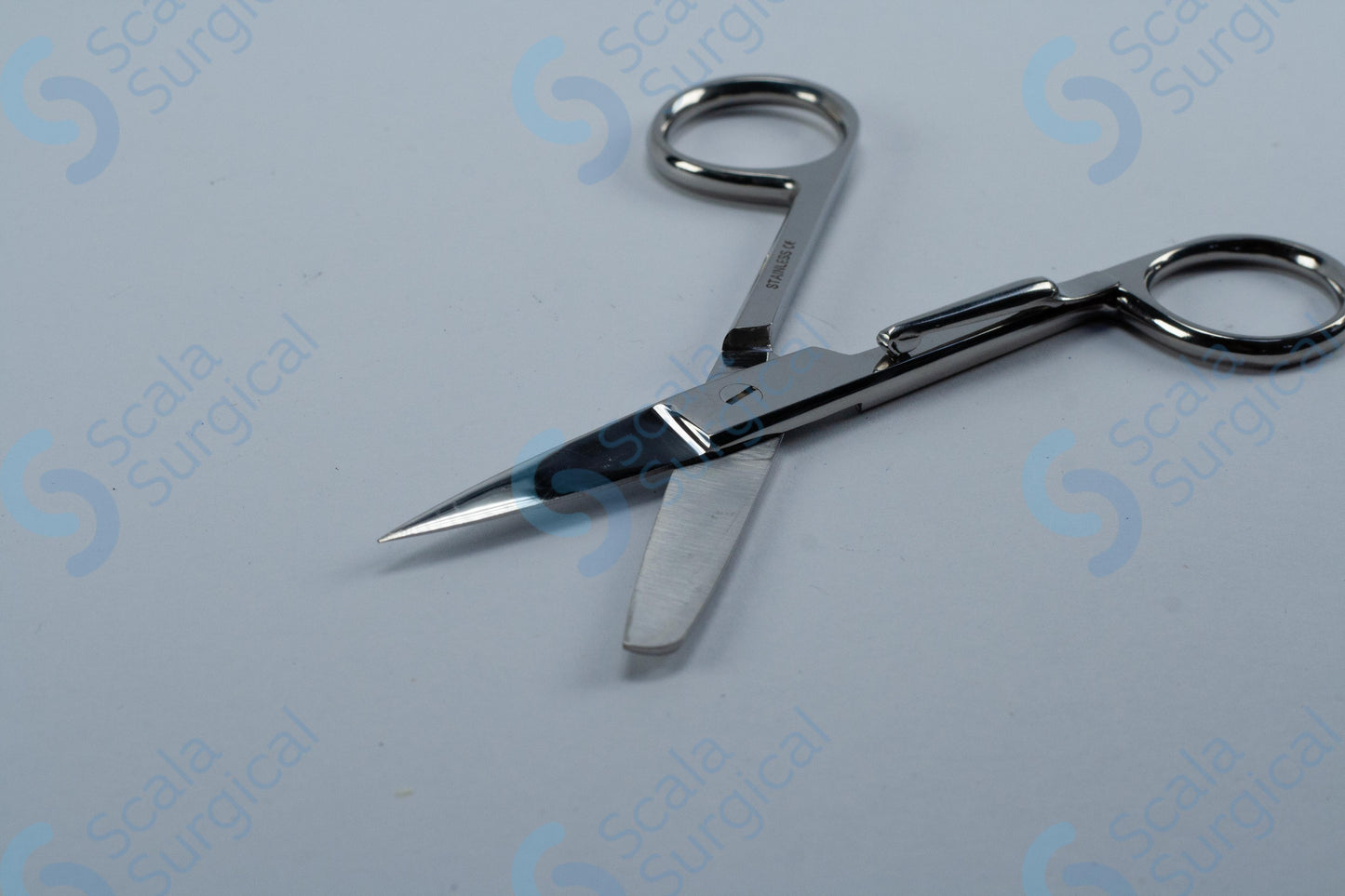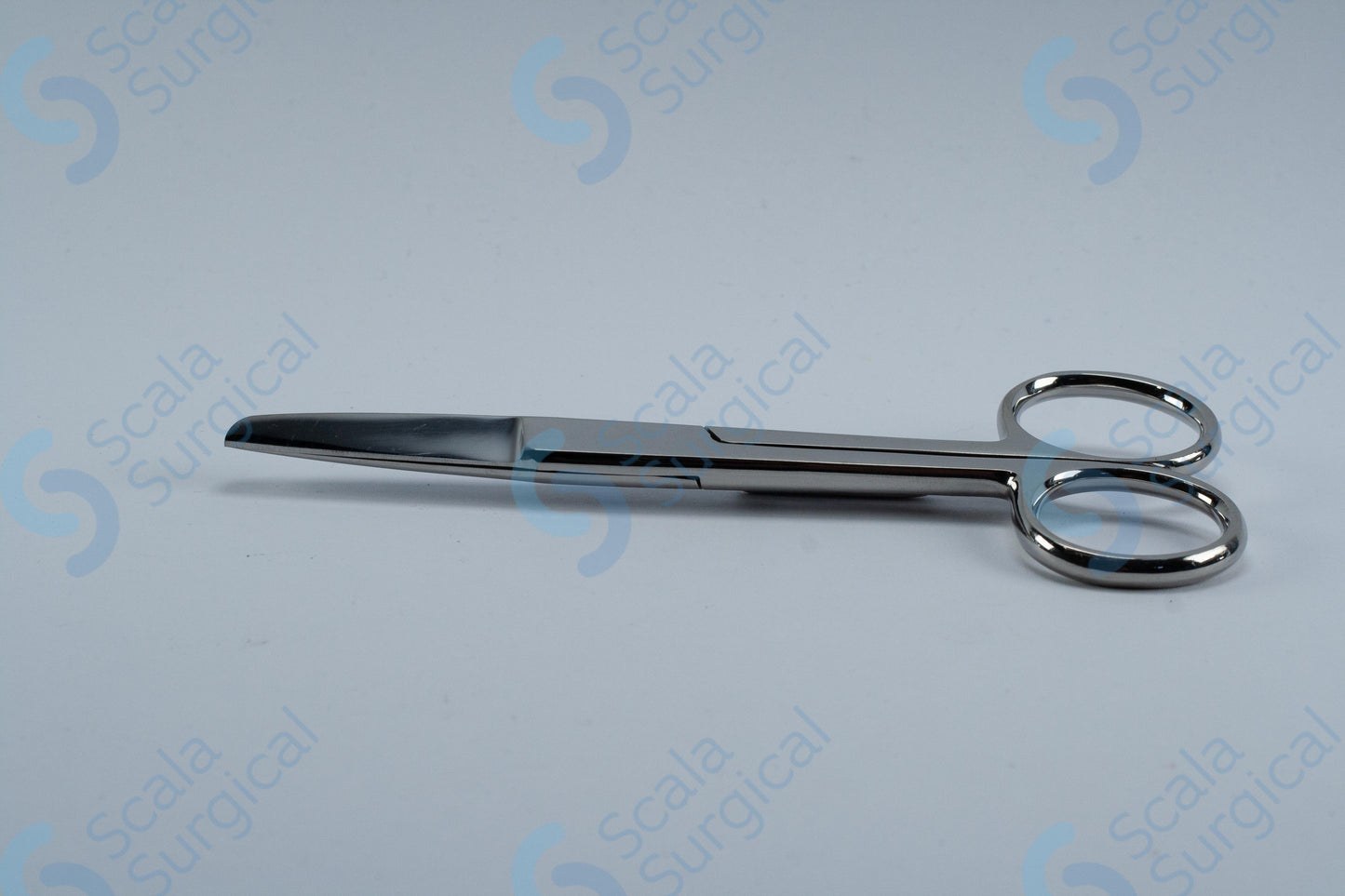 This particular item is a type of surgical scissors used to cut sutures and dressings. The sharp/blunt design allows for cutting of sutures while the blunt end can be used to manipulate dressings without damaging the surrounding tissue. The straight design of the scissors is ideal for precision cutting. The clip on the scissors allows for the instrument to be attached to a lanyard or other device for easy access. The length of the scissors is 127mm (5 inches) and they are designed for left-handed use.