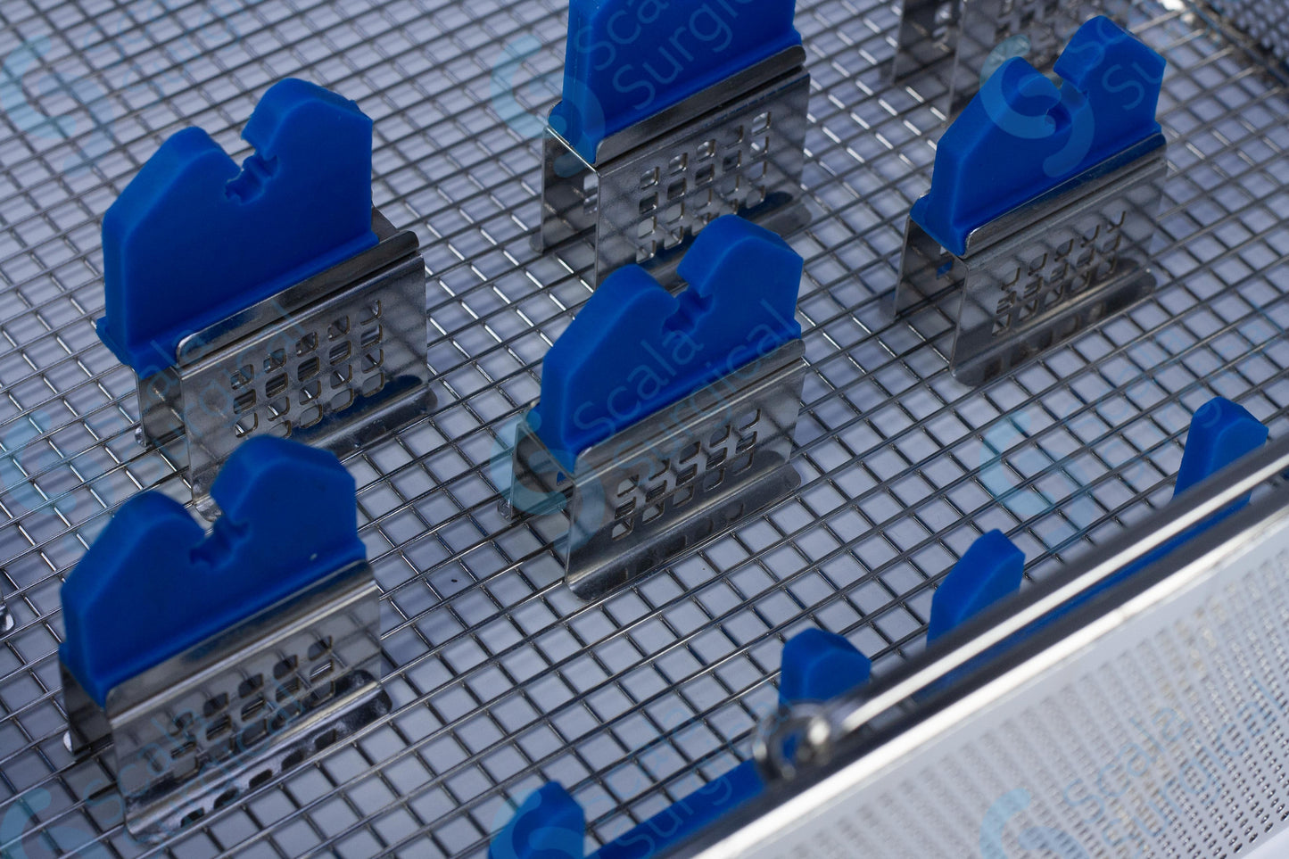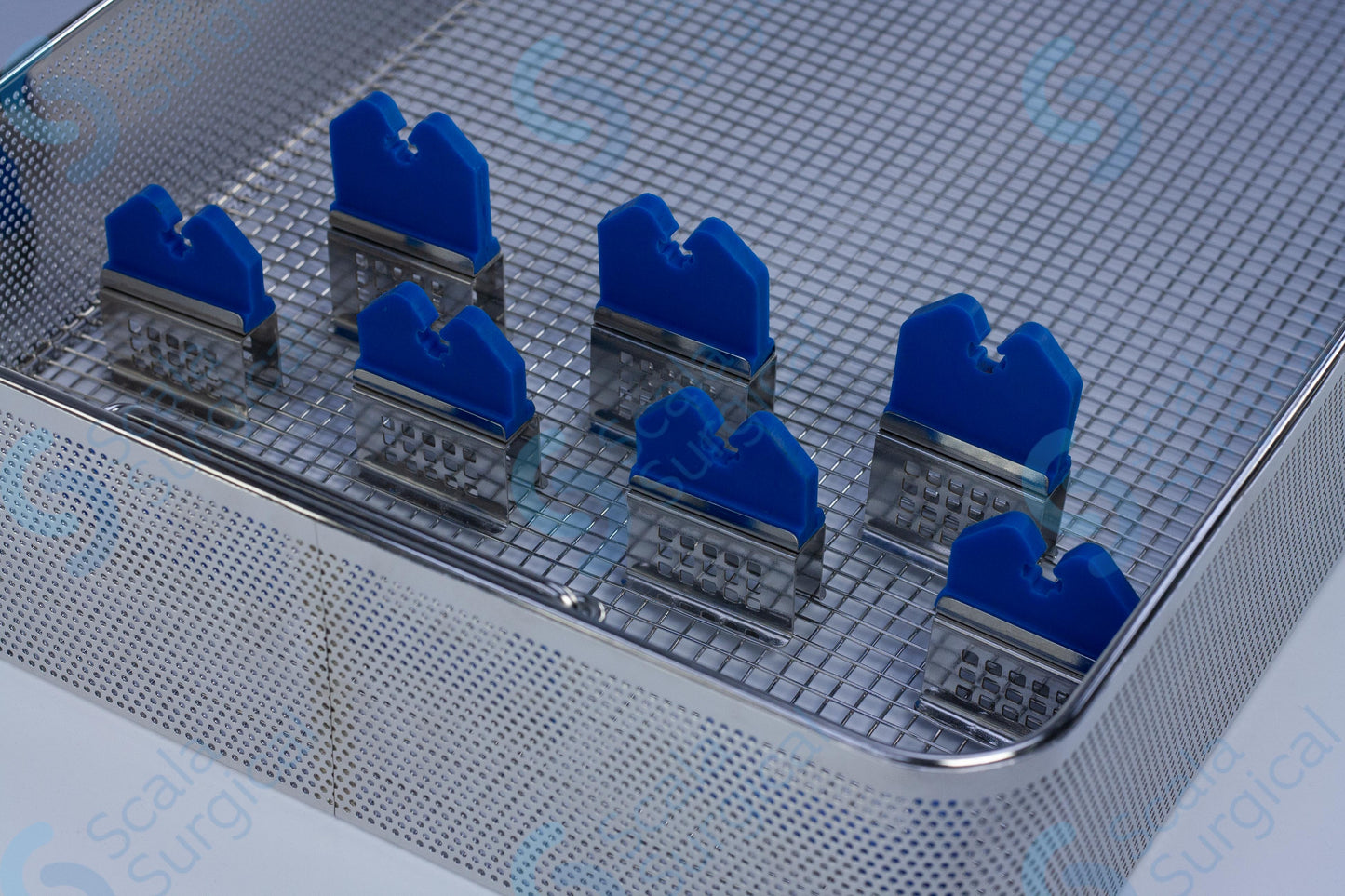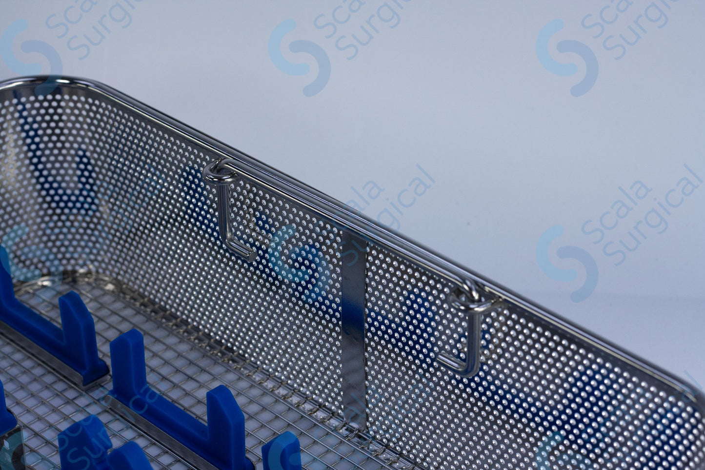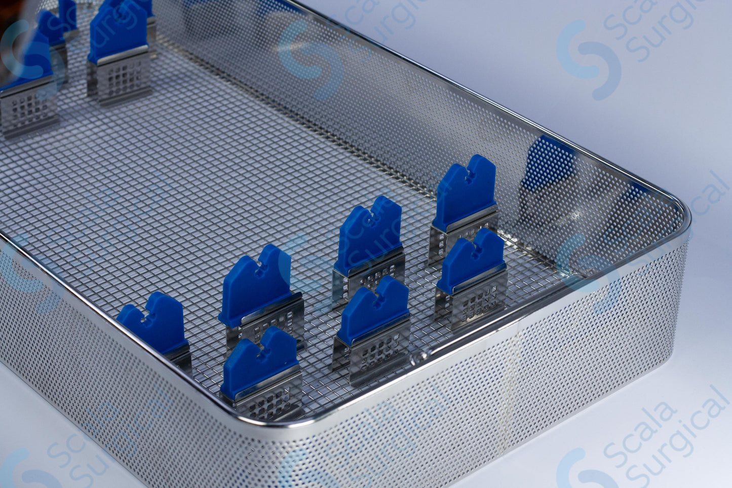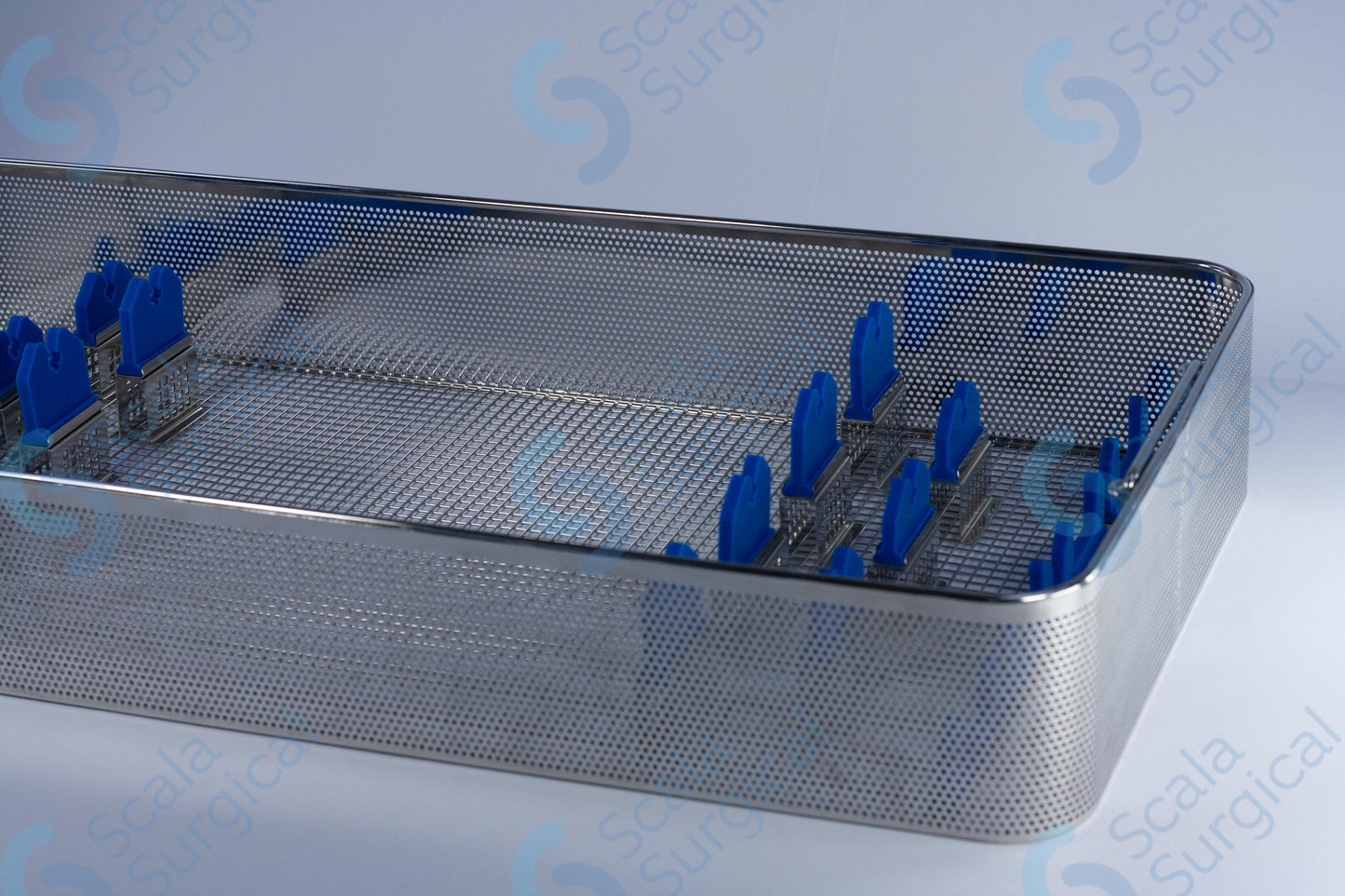 As a reliable partner in robotic instrument care, this flat base basket (680 x 350 x 100mm) is expertly designed to securely organise and protect 7 Da Vinci instruments during sterilisation, decontamination and handling. The efficient design promotes thorough sterilisation and minimizes damage and cross-contamination risks. Perfect for use in autoclaves or washer-disinfectors, the basket ensures a hygienic environment, contributing to safe surgical procedures and enhancing the longevity of your high-quality robotic instruments.