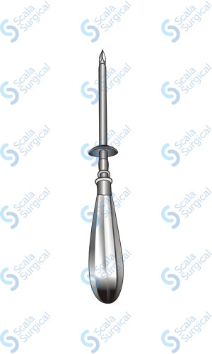 A hydrocele trocar is a surgical instrument used to remove fluid from a hydrocele (a fluid-filled sac in the scrotum). The trocar is a long, hollow tube with a sharp point at one end and a handle at the other. The chrome plating is used to make the instrument easier to clean and sterilize.