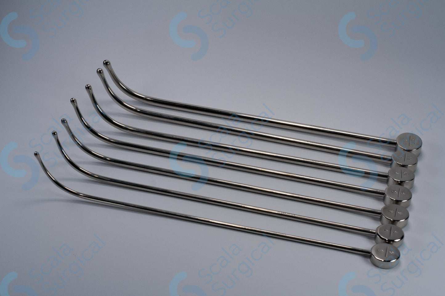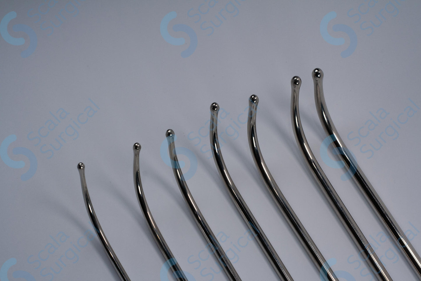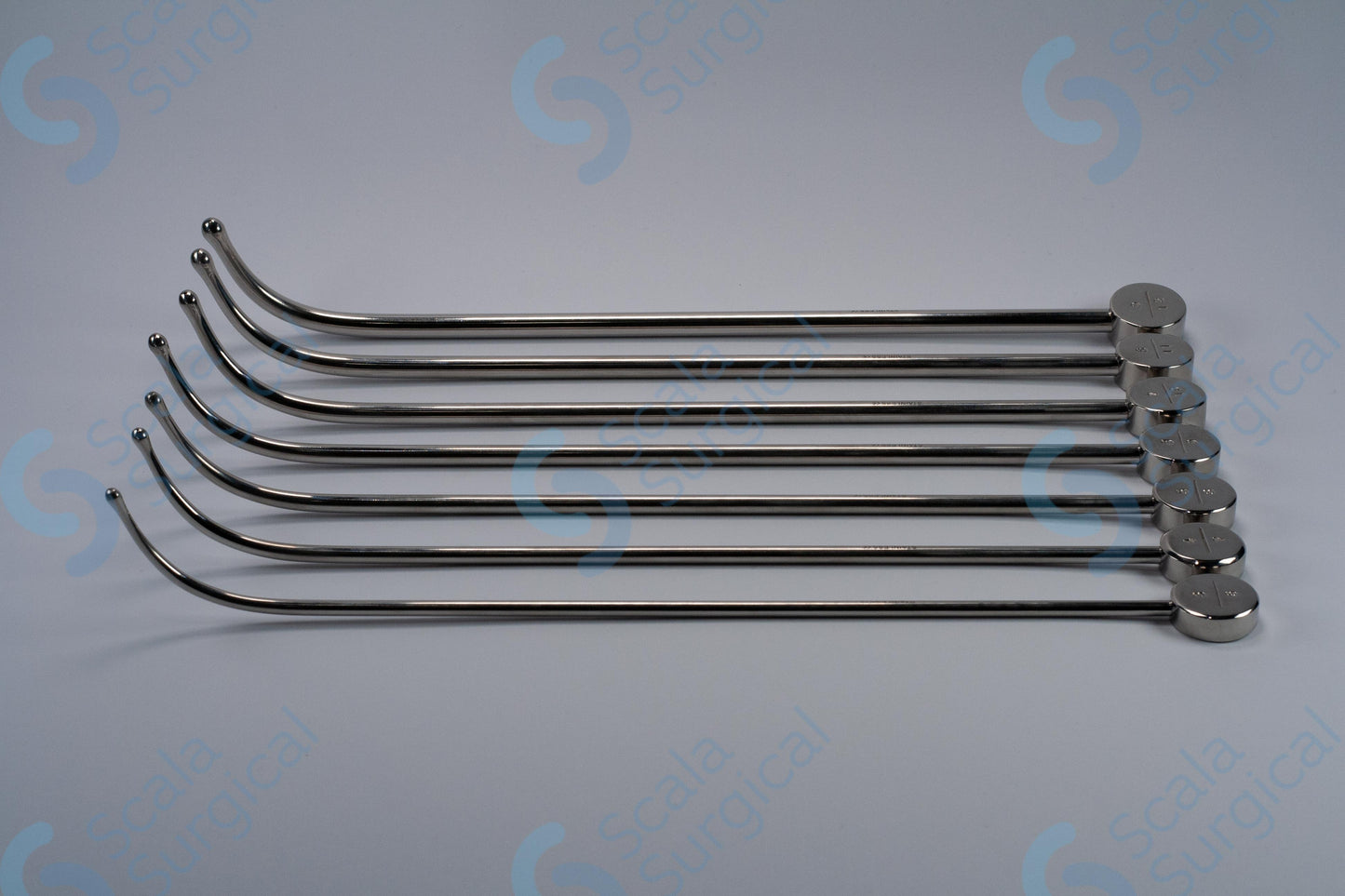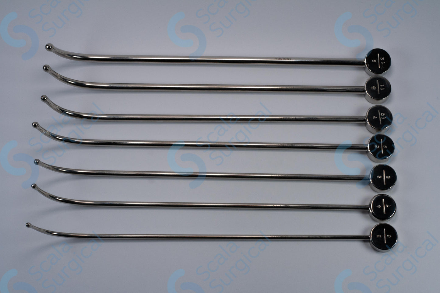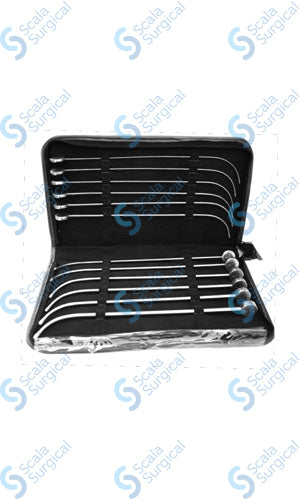 A Lister Urethral Bougie Set of 12 (11 inch) is a specialized medical instrument used in the urological field of surgery. It is used to help guide a catheter or other instrument through the urethra during a procedure. The set includes twelve bougies of 11 inches in length, which can be used to measure the size of the urethra and ensure the catheter is inserted correctly.