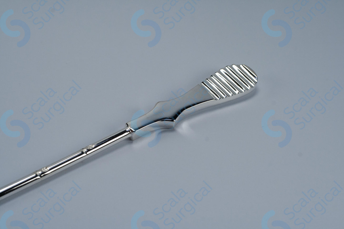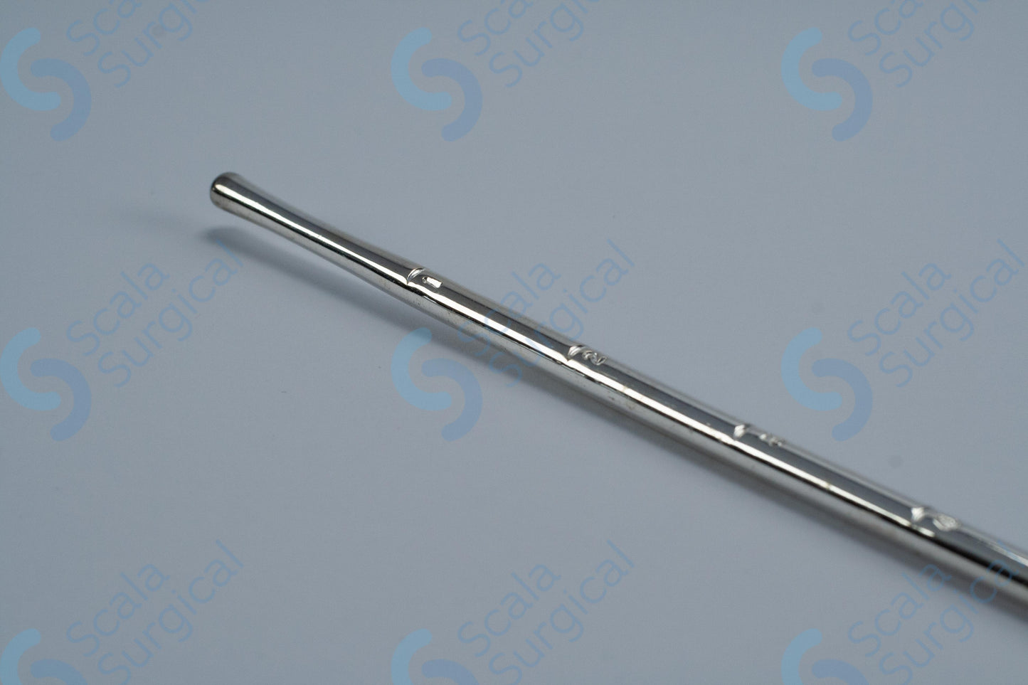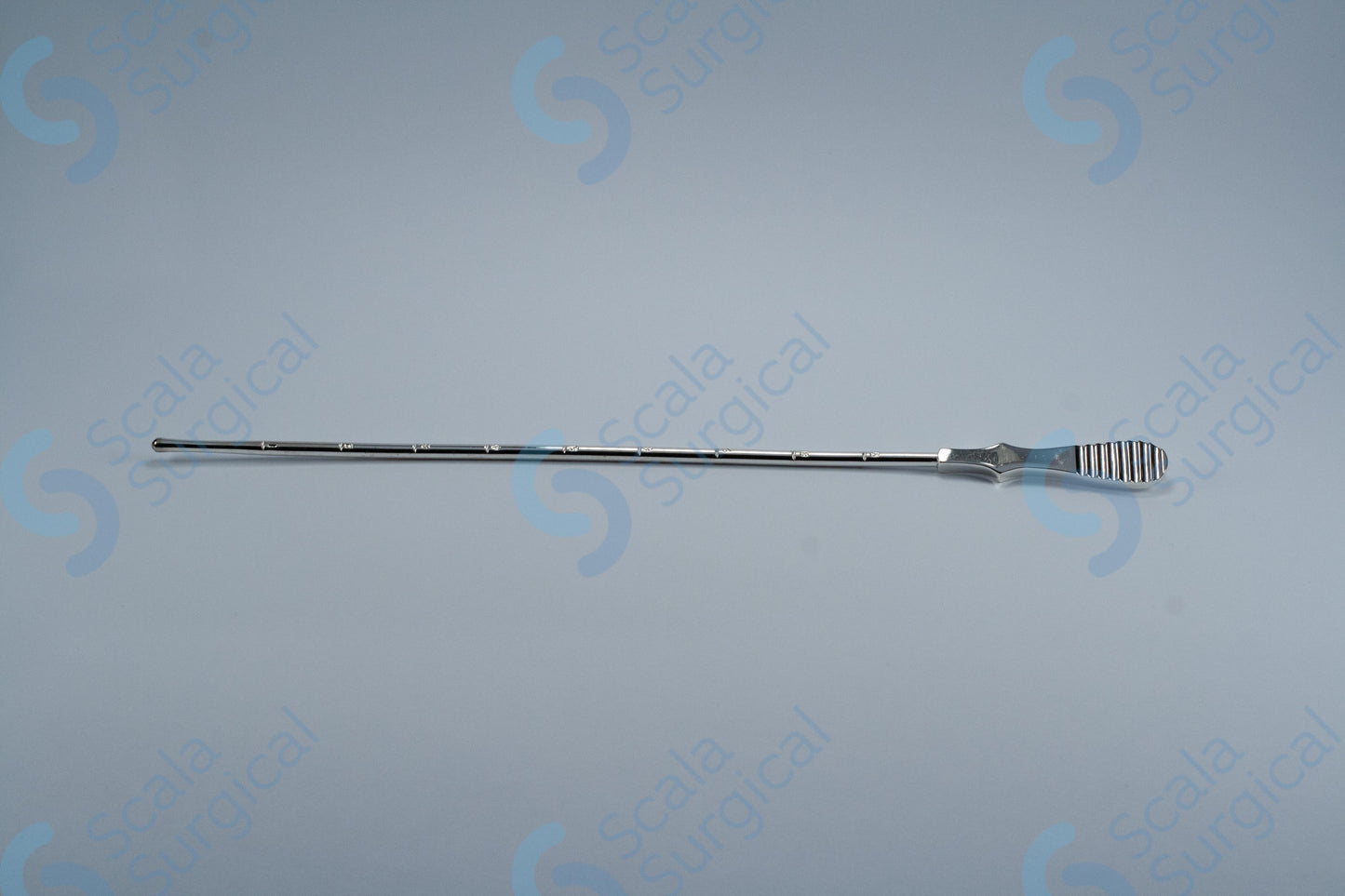 A Mayo urethral sound is a surgical instrument used to dilate the urethra. It is inserted into the urethra and used to measure the diameter of the urethra. The tip diameter of 5mm indicates the size of the instrument.