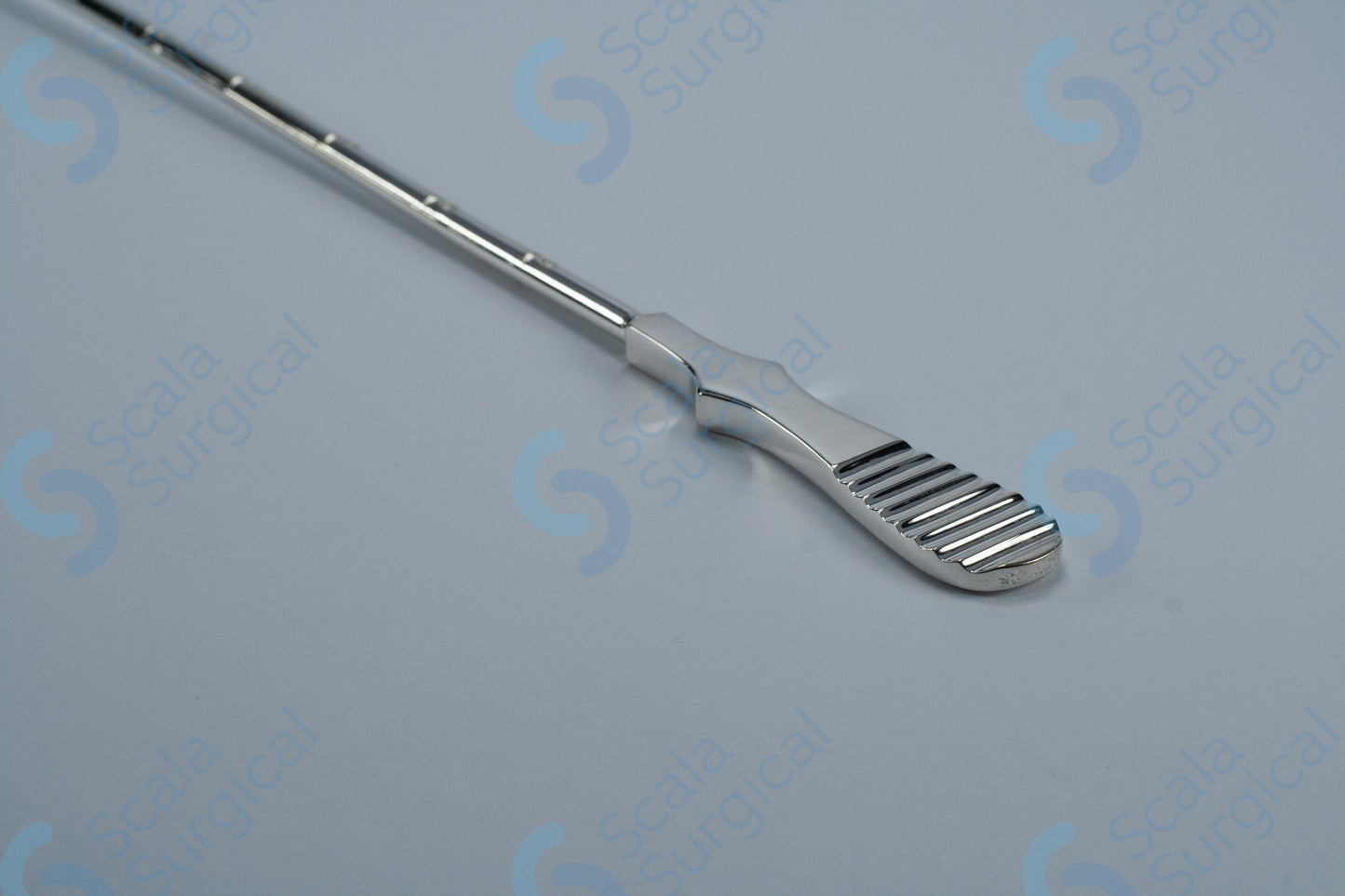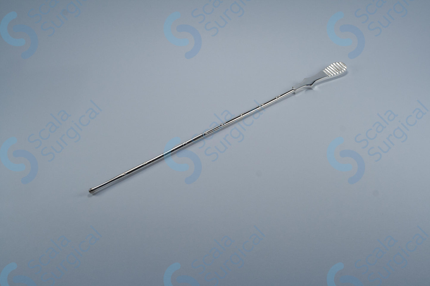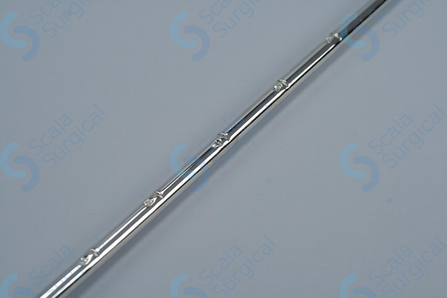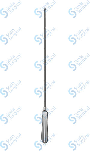 A Mayo urethral sound is a surgical instrument used to dilate the urethra. It is inserted into the urethra and used to measure the diameter of the urethra. The tip diameter of 5mm indicates the size of the instrument.