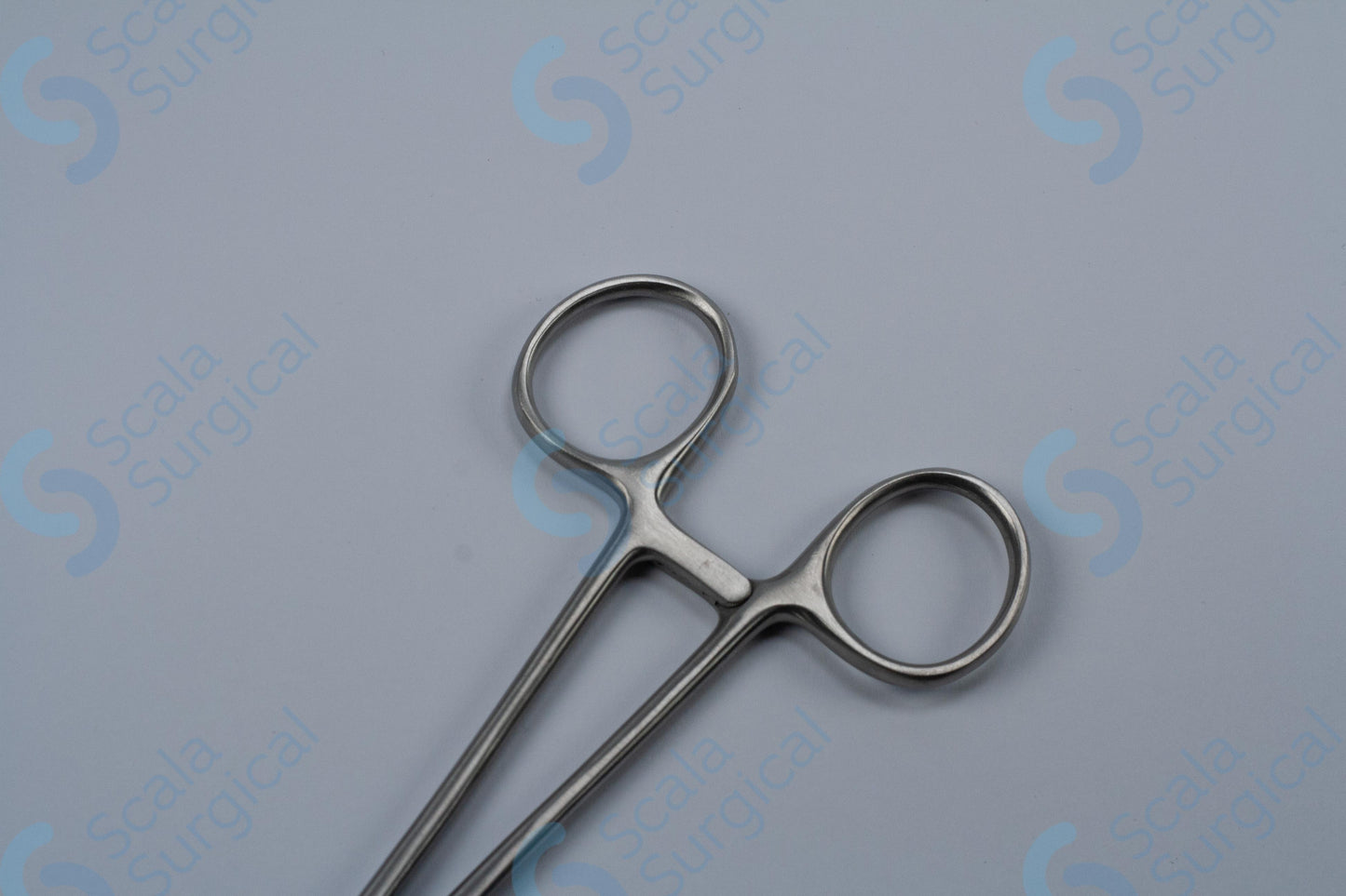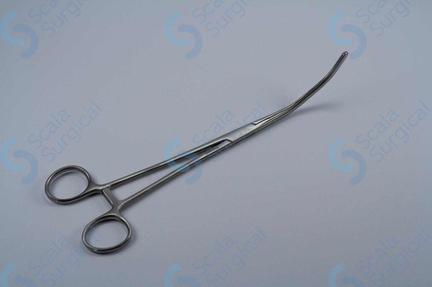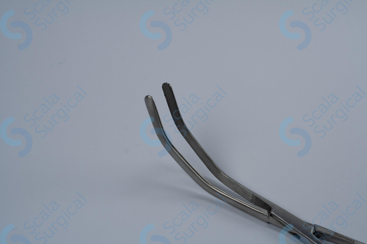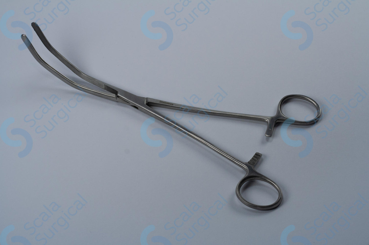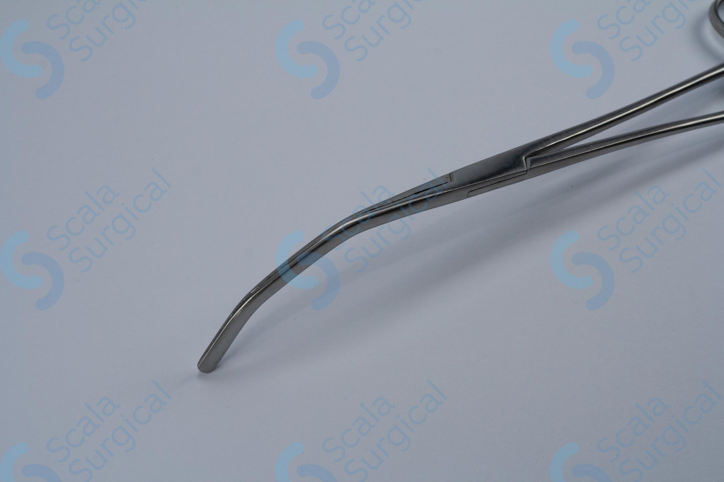 This item is used to clamp the pedicle of a kidney during a surgical procedure. It is designed to maintain hemostasis and can be used in a variety of kidney surgeries. The double angled box joint allows for better control and manipulation of the clamp during the procedure.