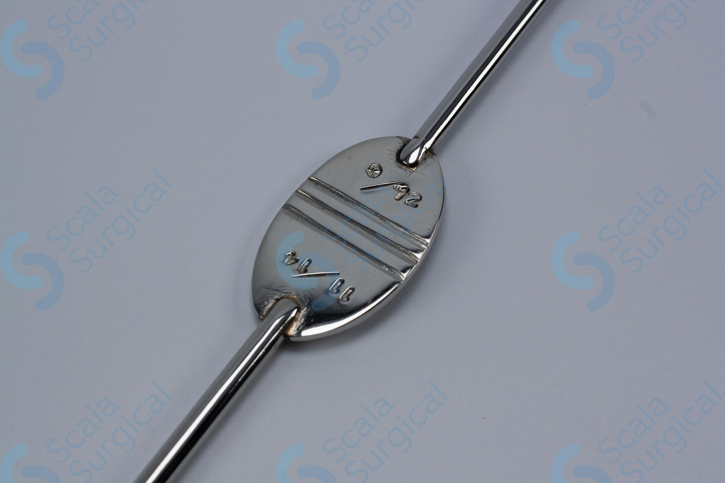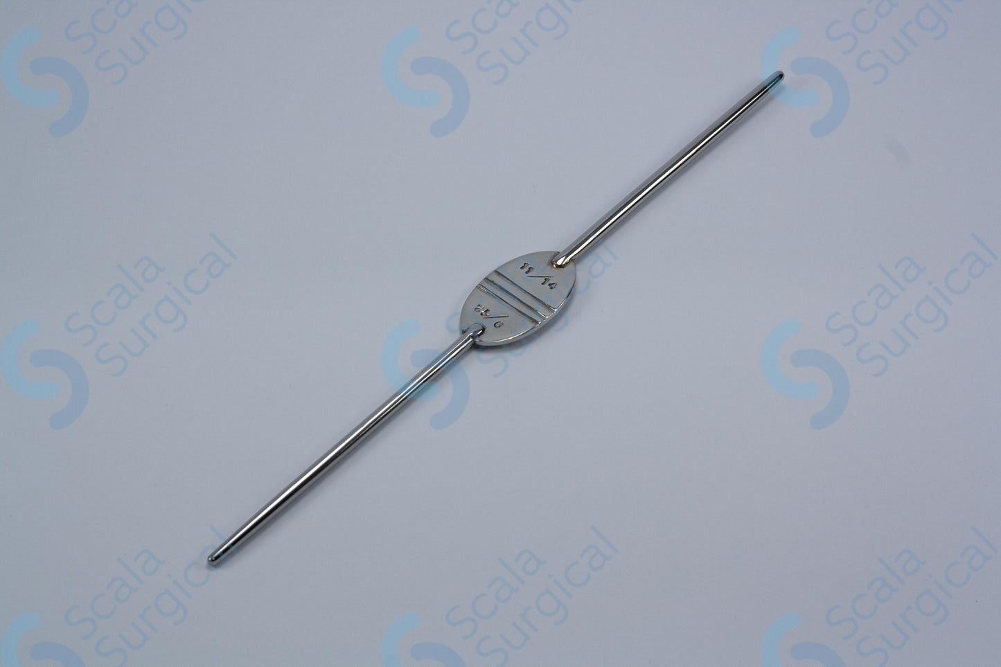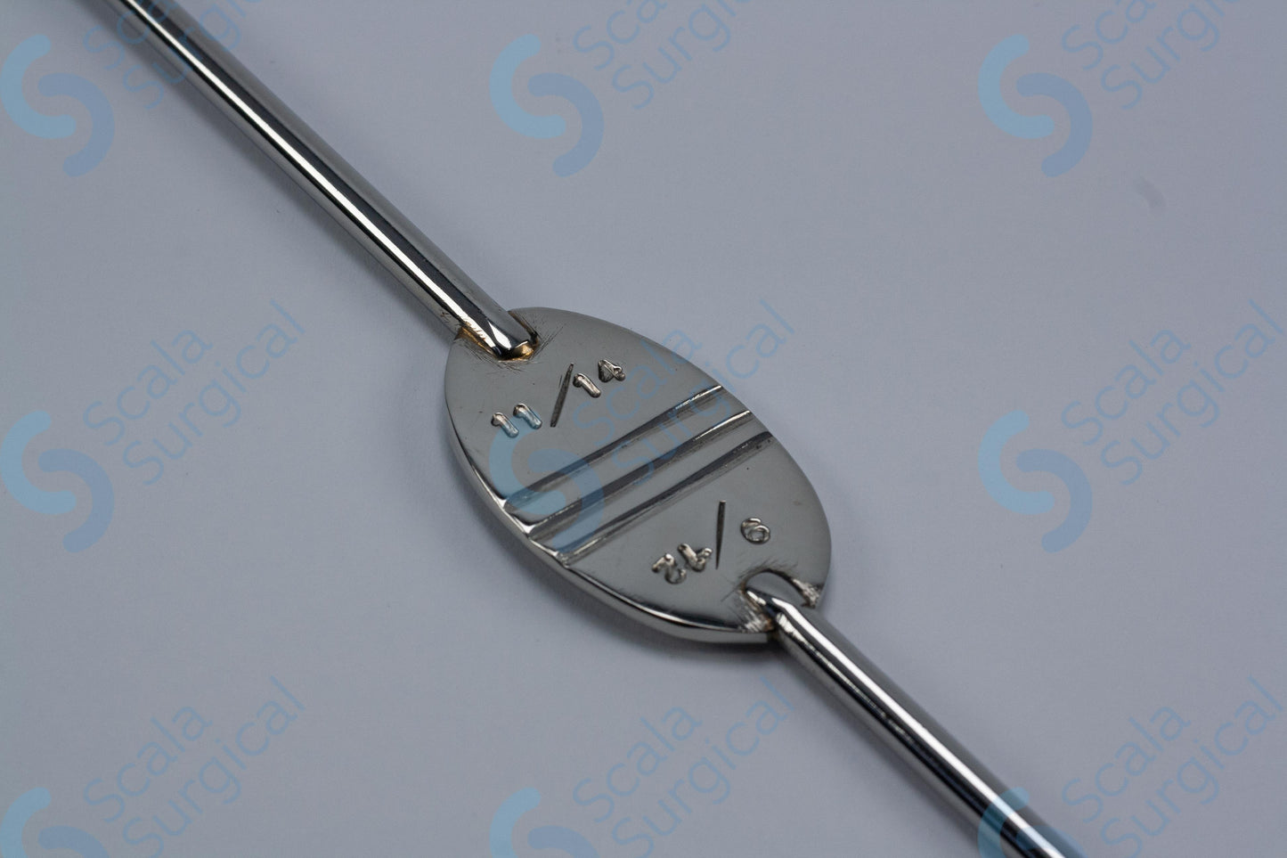 This is a type of medical device used to help guide the placement of an endotracheal tube (a tube inserted into the trachea to provide an airway) during intubation. The Canny Ryall Bougie is a flexible, curved metal rod with a rounded tip. It is available in different sizes, and this particular model ranges from 9/12 FG (French gauge) to 11/14 FG (245mm).