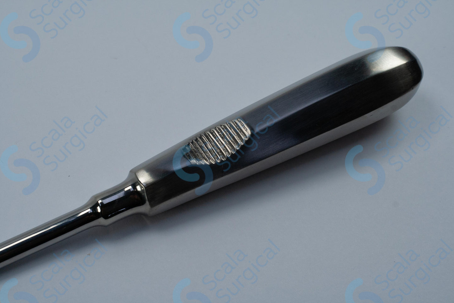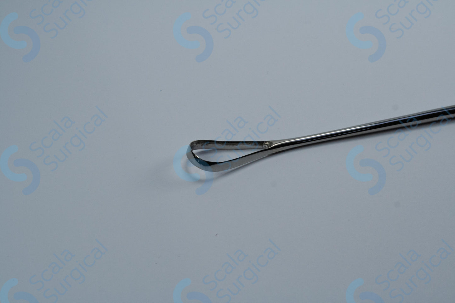 A Recamier Uterine Curette Sharp is a surgical instrument used to scrape the lining of the uterus during a uterine biopsy or dilation and curettage procedure. It is used to diagnose and treat abnormal uterine bleeding, endometrial polyps, and other conditions. The instrument has a sharp, curved tip and a narrow, 16.5mm width. The total length of the instrument is 317.5mm.