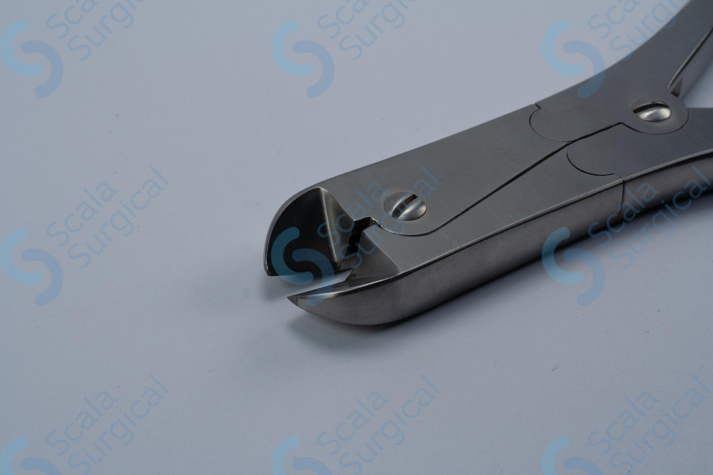 This wire cutter is designed to cut through metal wires in the surgical field. It has a compound action handle, tungsten carbide jaws, and lateral cutting capabilities. It is 234.95mm (9? inch) in length.