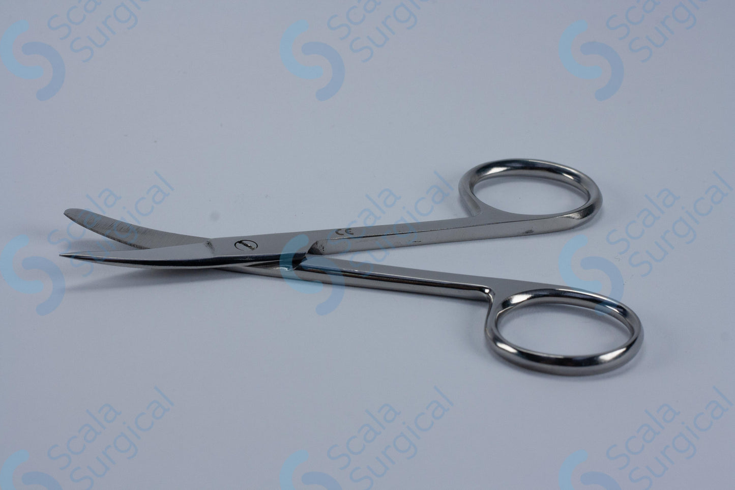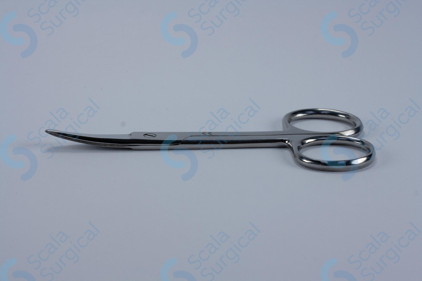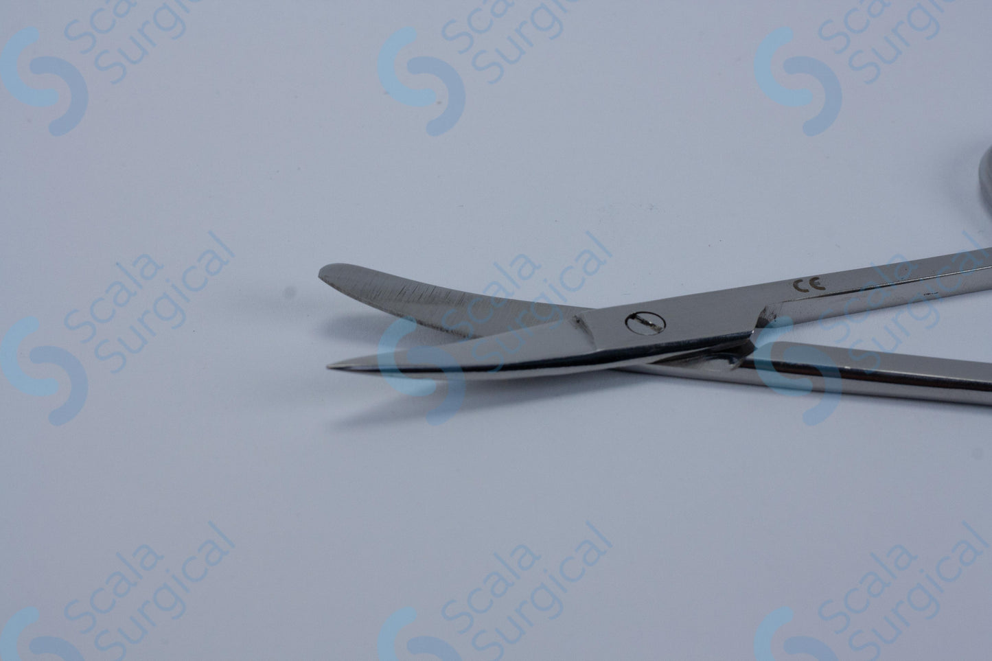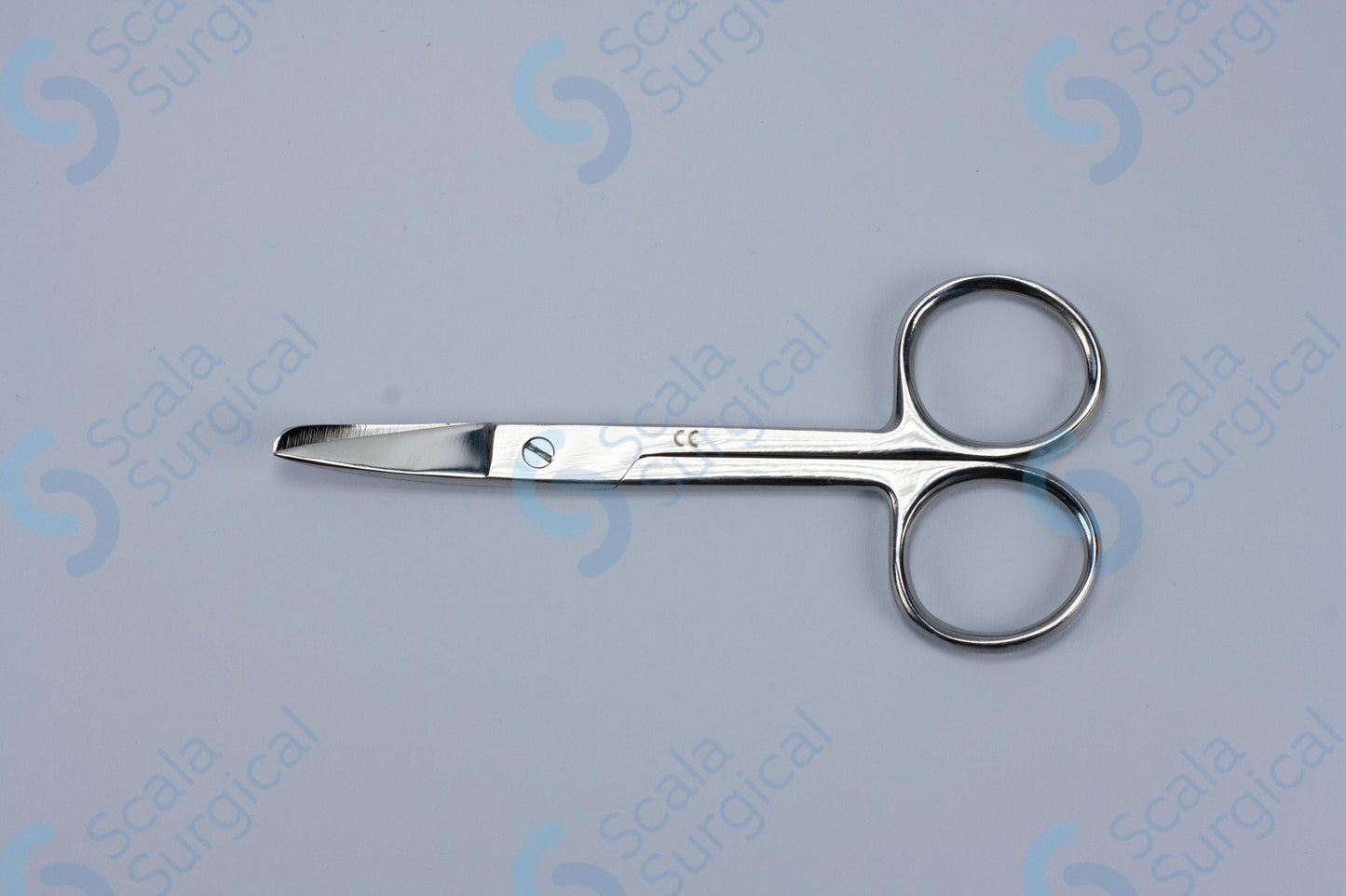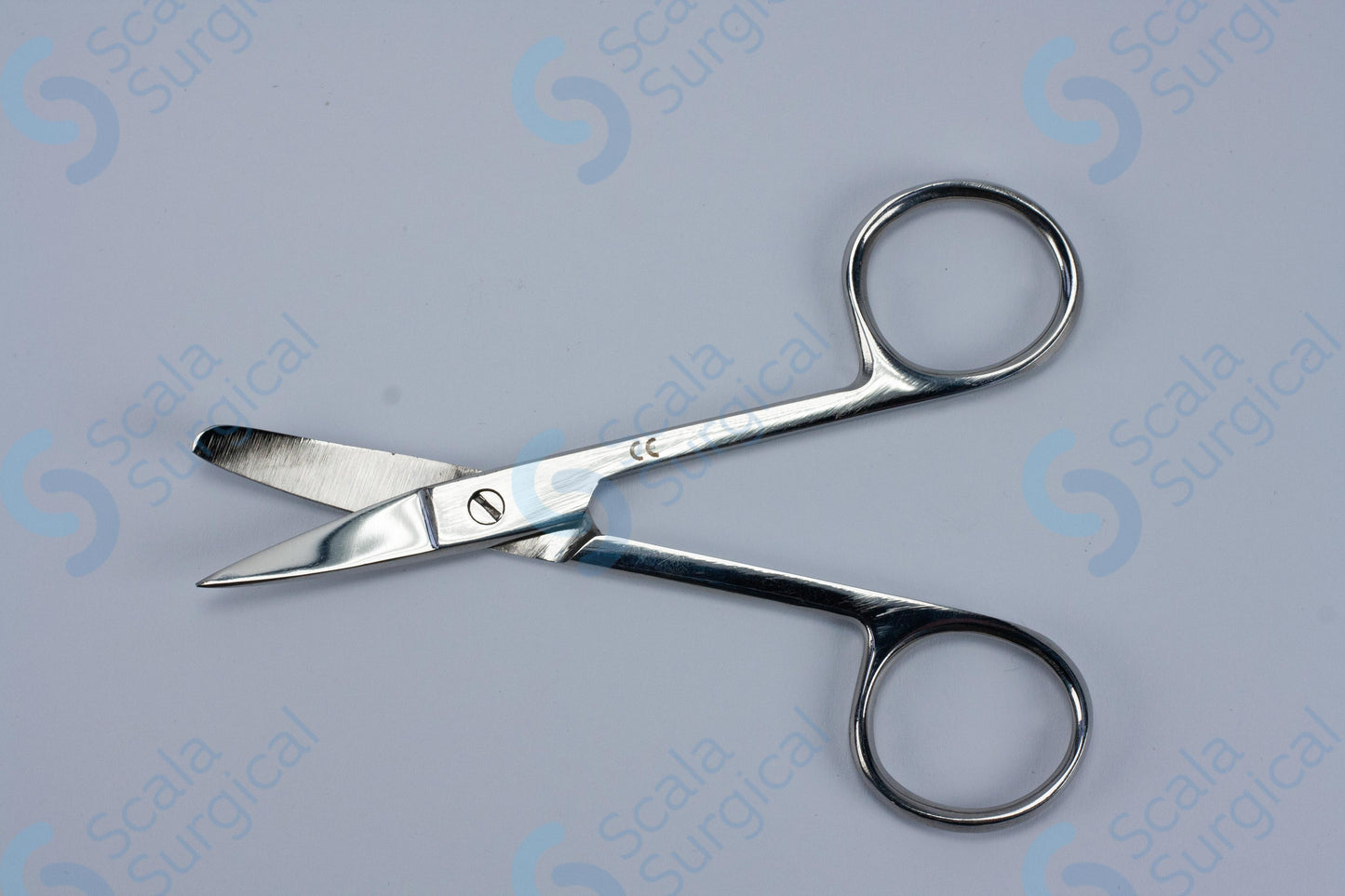 Dressing scissors are a type of surgical scissors used to cut through bandages, tape, and other dressing materials. These scissors have one sharp and one blunt blade, and are curved to fit the contours of the body. They are typically 114.3mm (4? inch) in length.