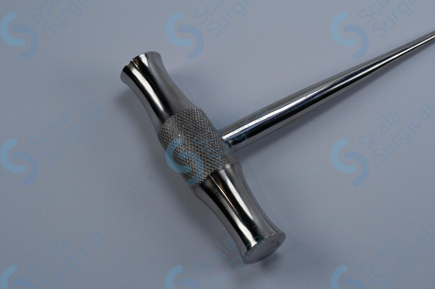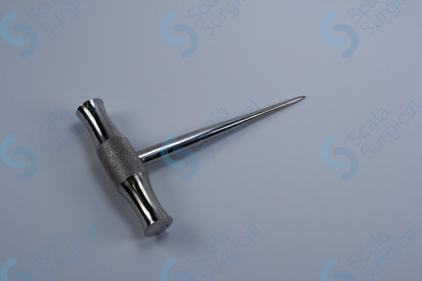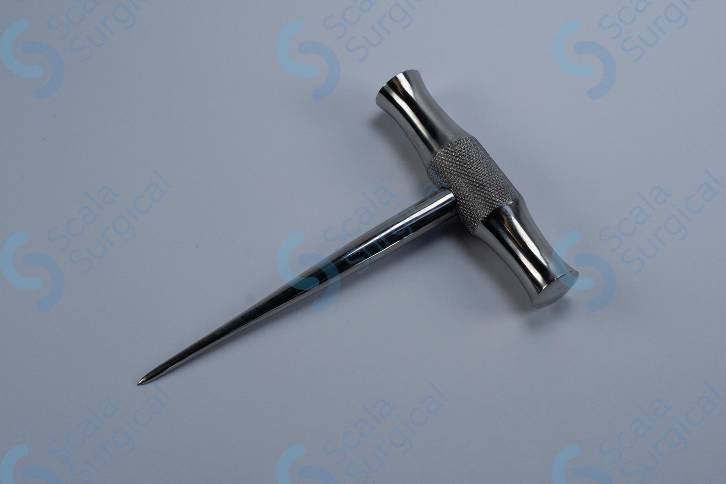 Root elevators with a T-shaped handle and a straight blade are used to gently separate the tissue around the root of a tooth during dental surgery. The blade is inserted into the gum line and used to carefully lift and separate the tissue from the root of the tooth. This helps to provide access for the dentist to remove the tooth or perform other procedures.