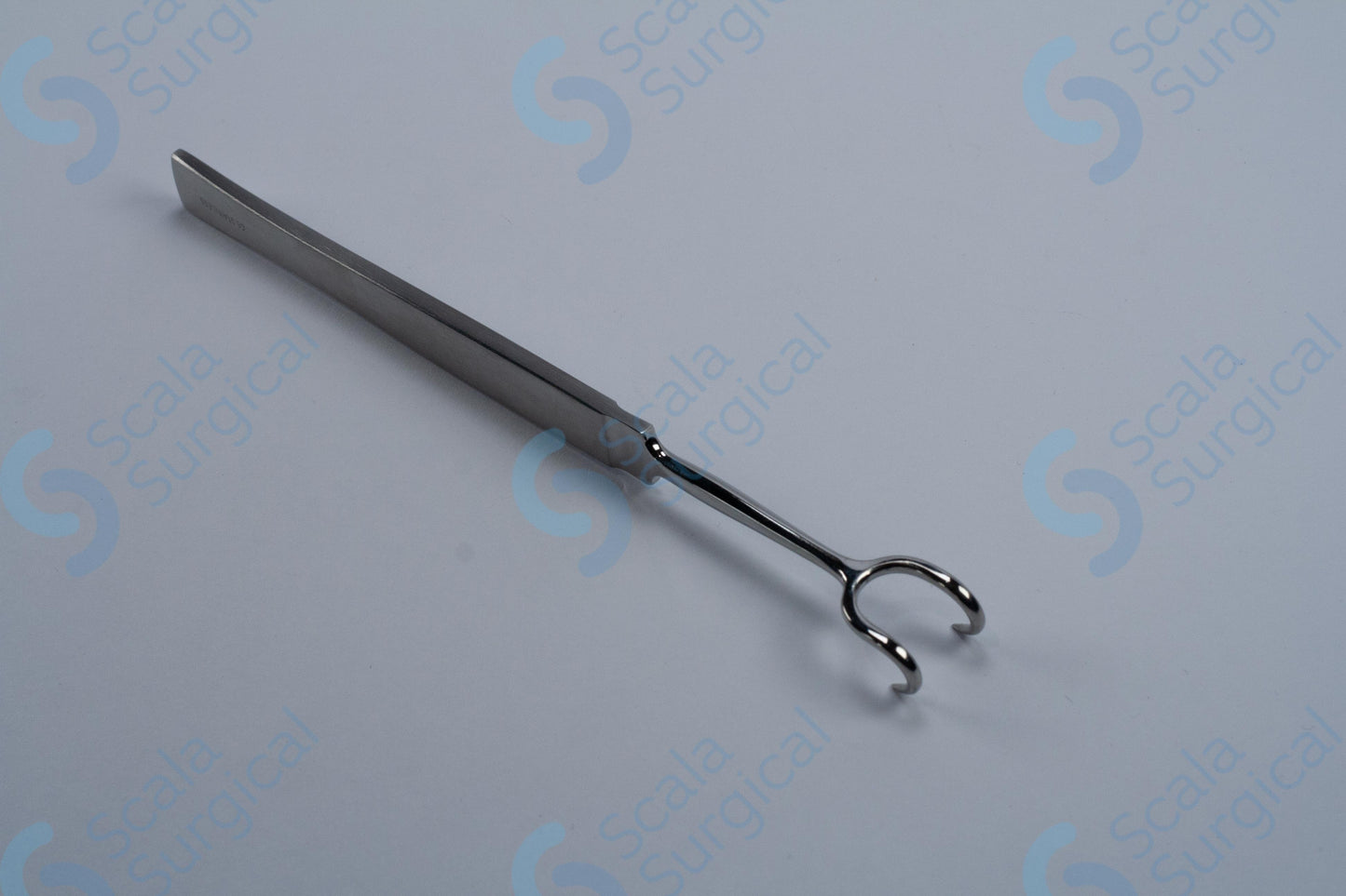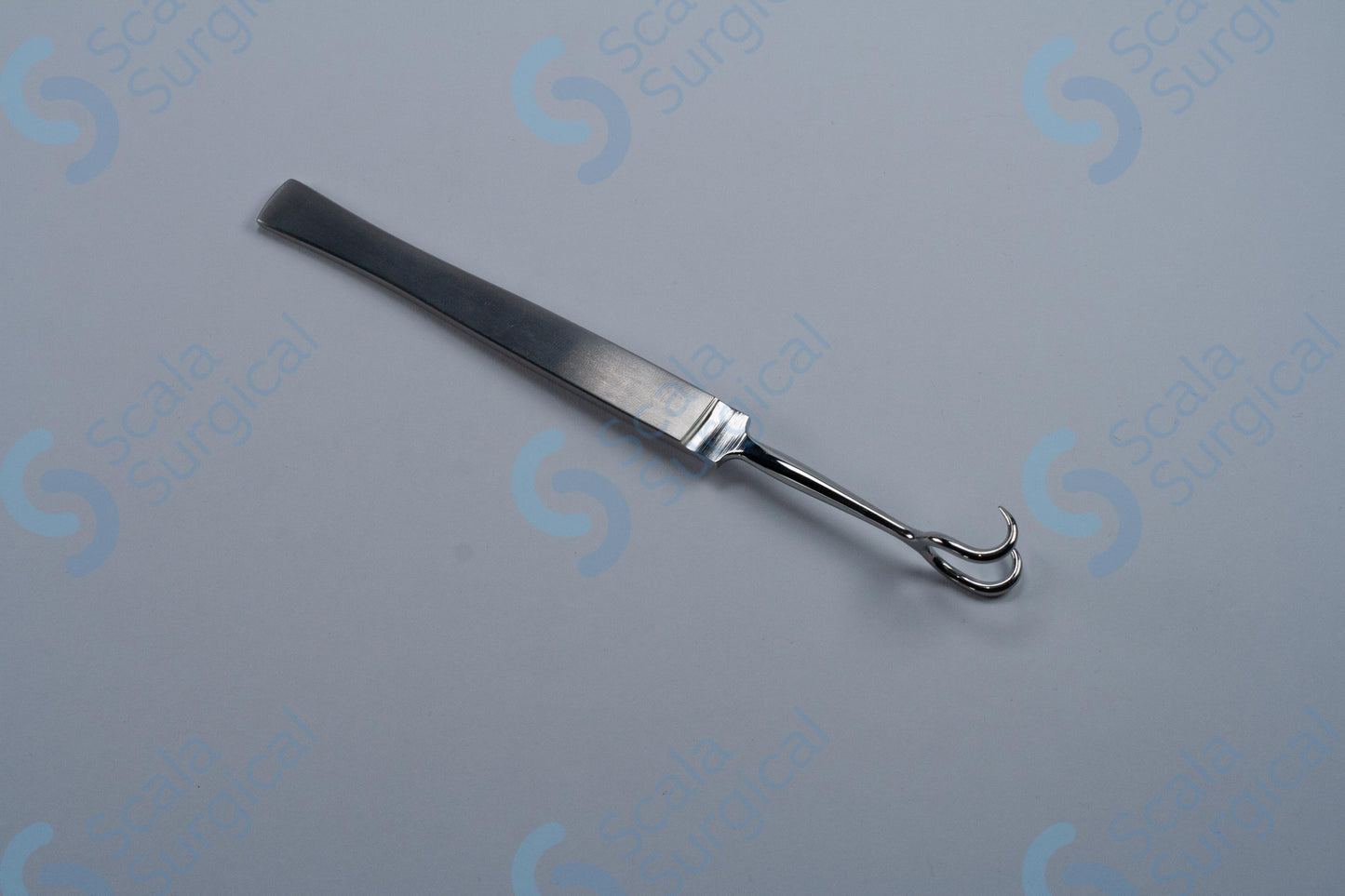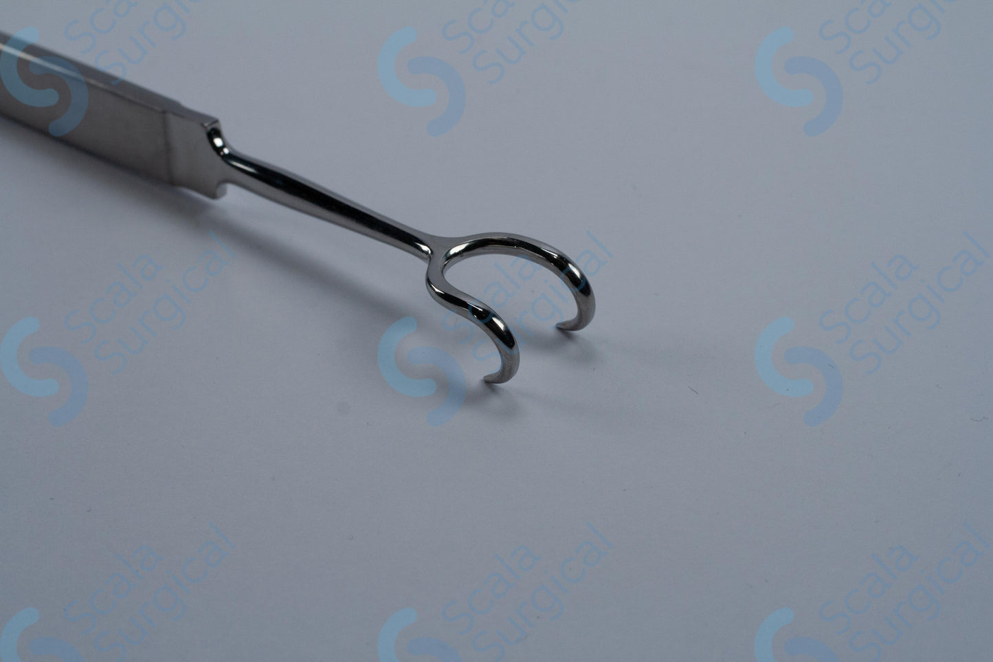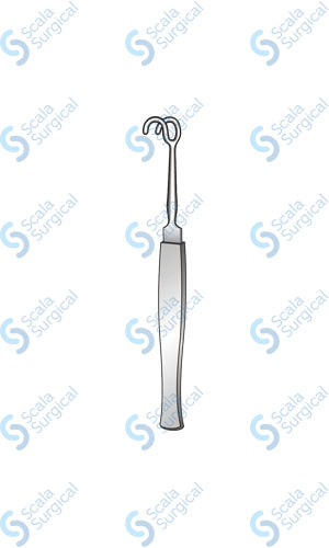 A tracheal double hook retractor sharp (158.75mm) (6? inch) is a surgical instrument used to hold open the trachea during surgery. It is used to facilitate access to the trachea and surrounding structures and to provide exposure to the surgical field. The double hook design allows for better control and manipulation of the tissue.