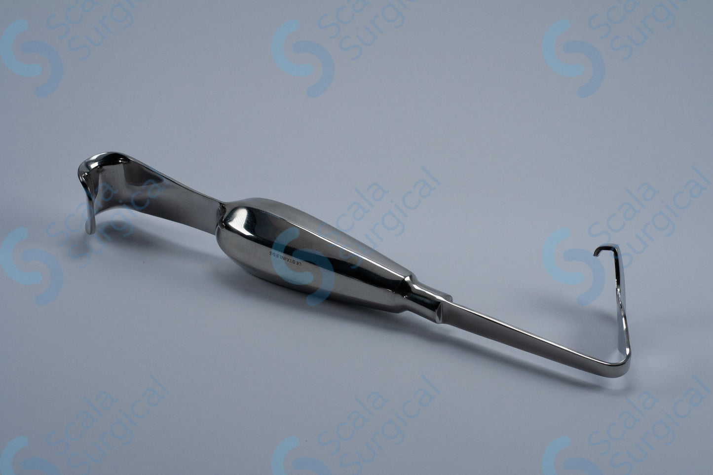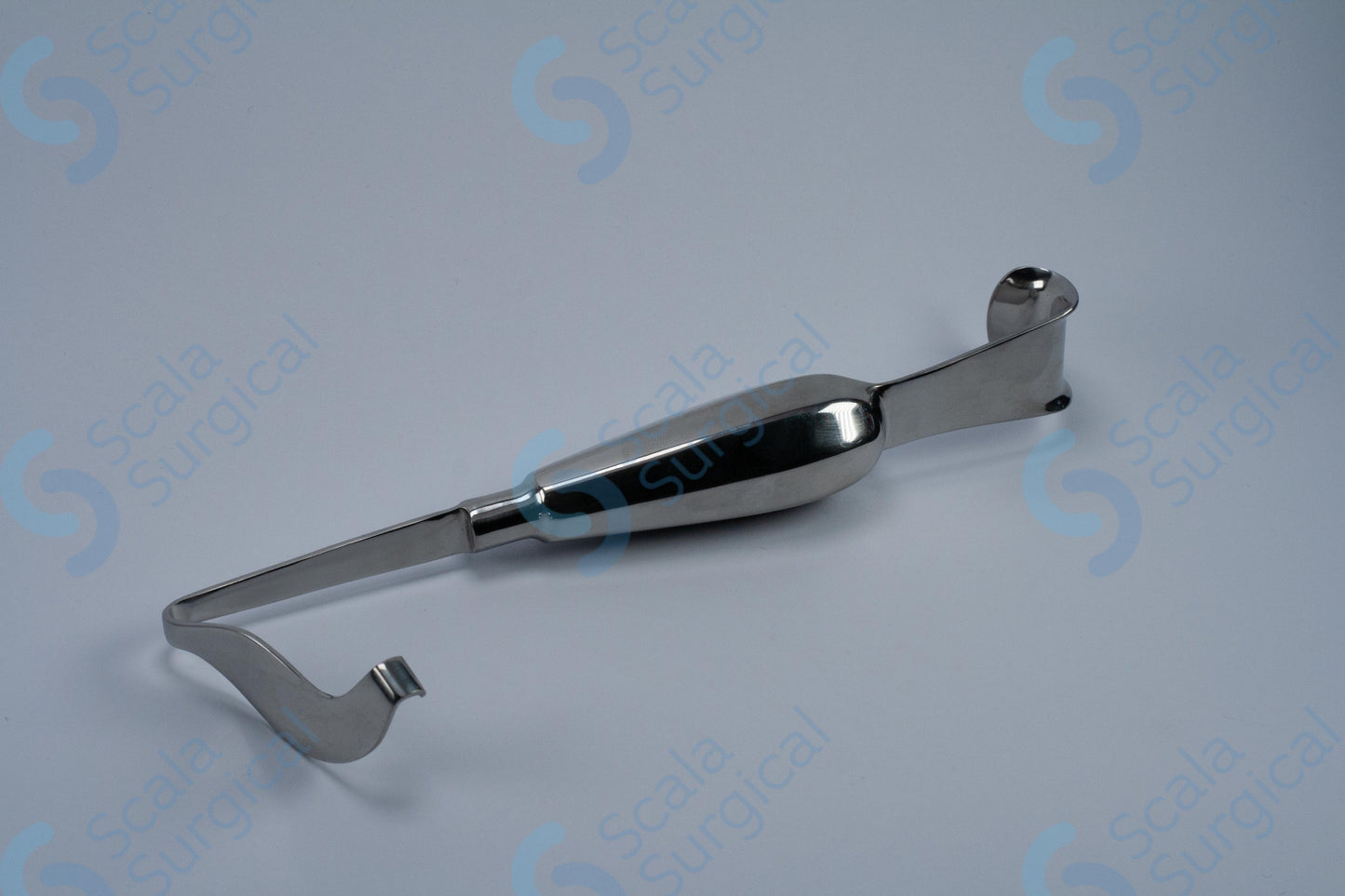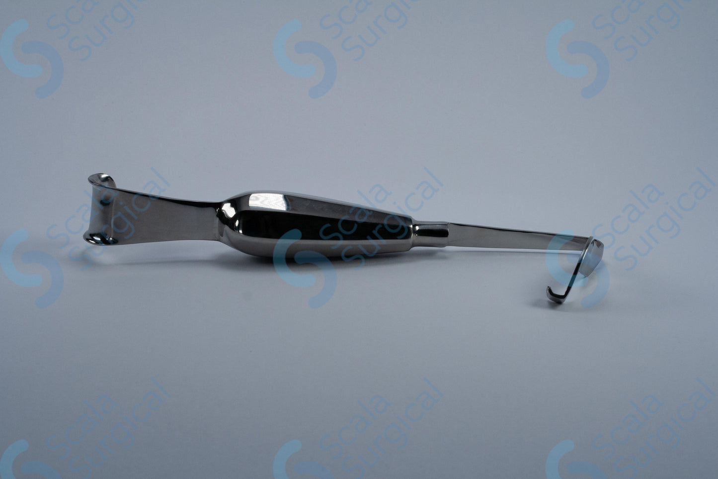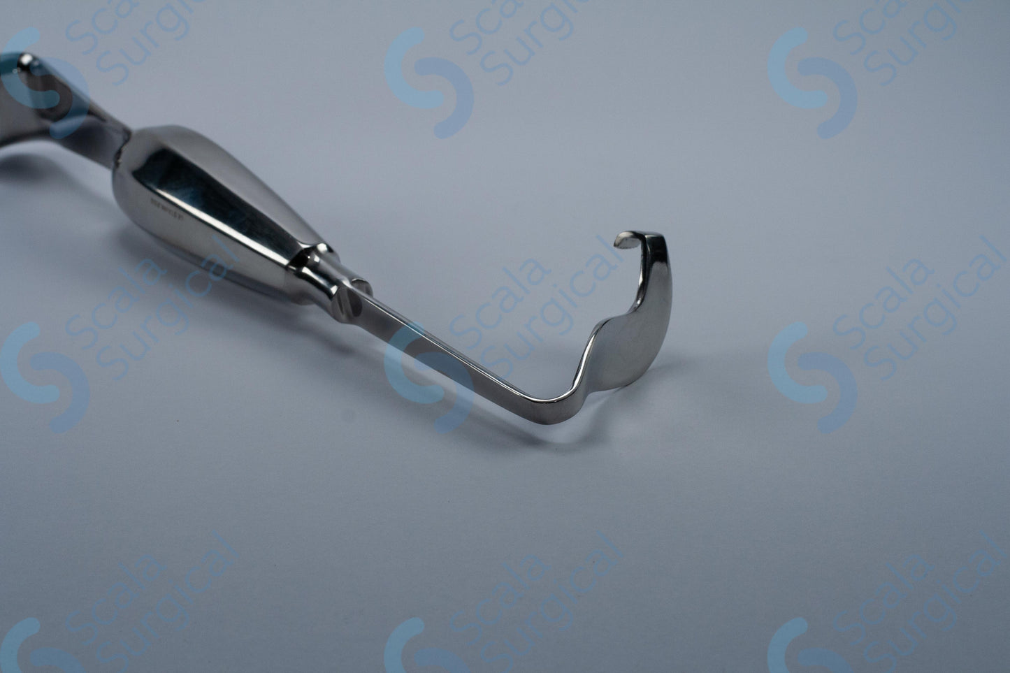 A Rowe Buccal Flap Retractor is a surgical instrument used to retract the buccal mucosa (inner lining of the cheek) during oral and maxillofacial surgery. The double-ended hollow handle is curved to the right and allows for greater access to the surgical area. It is commonly used in procedures such as dental implant placement, orthognathic surgery, and reconstructive surgery.