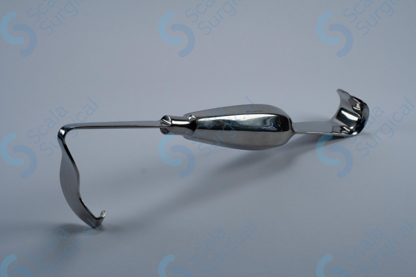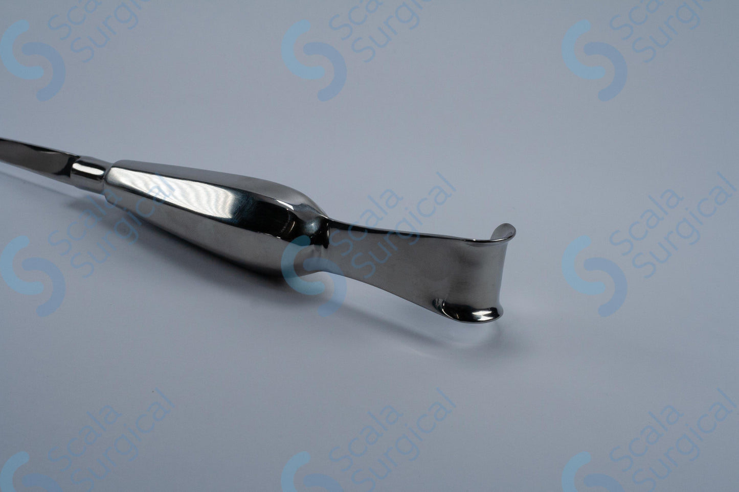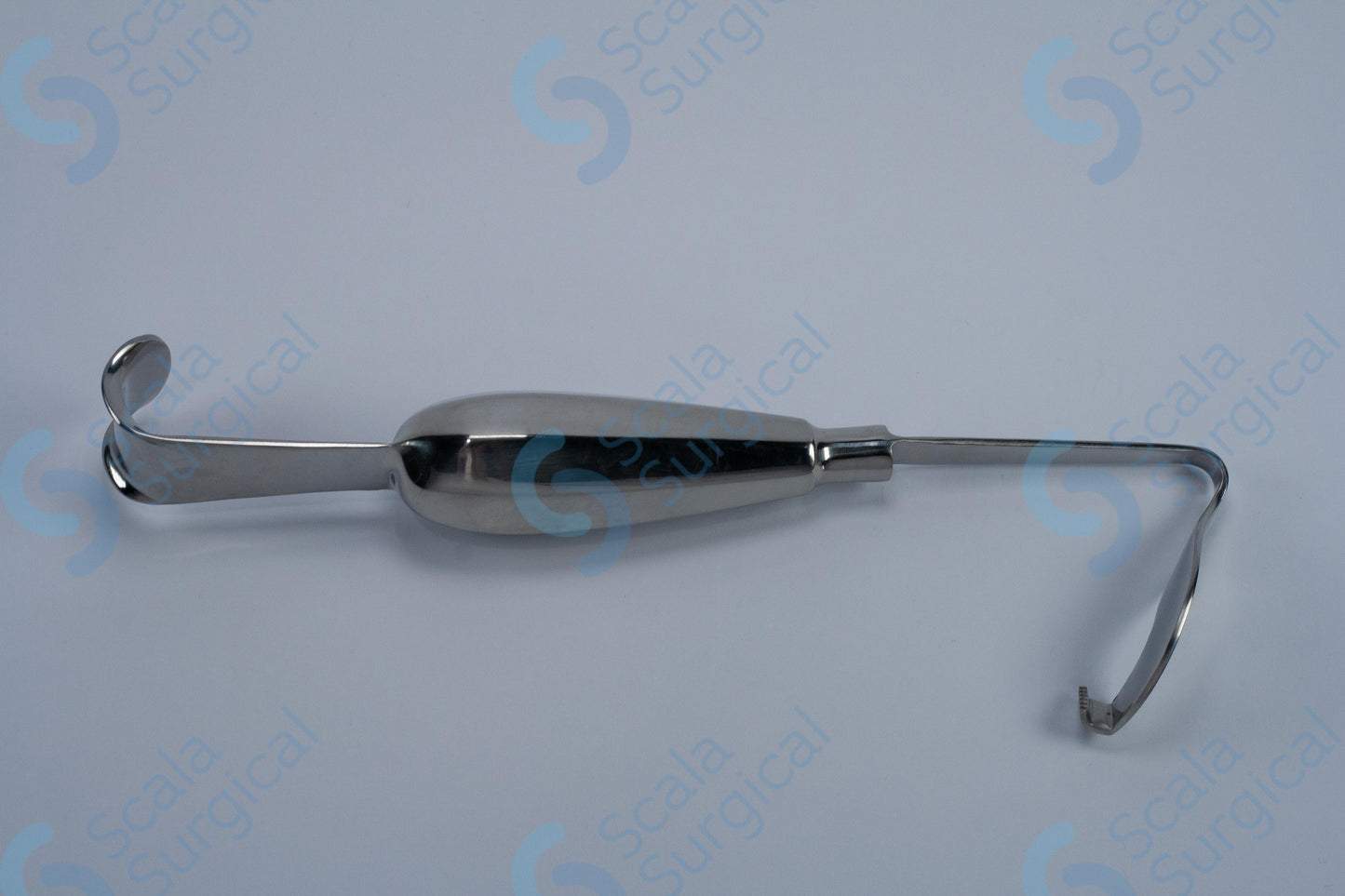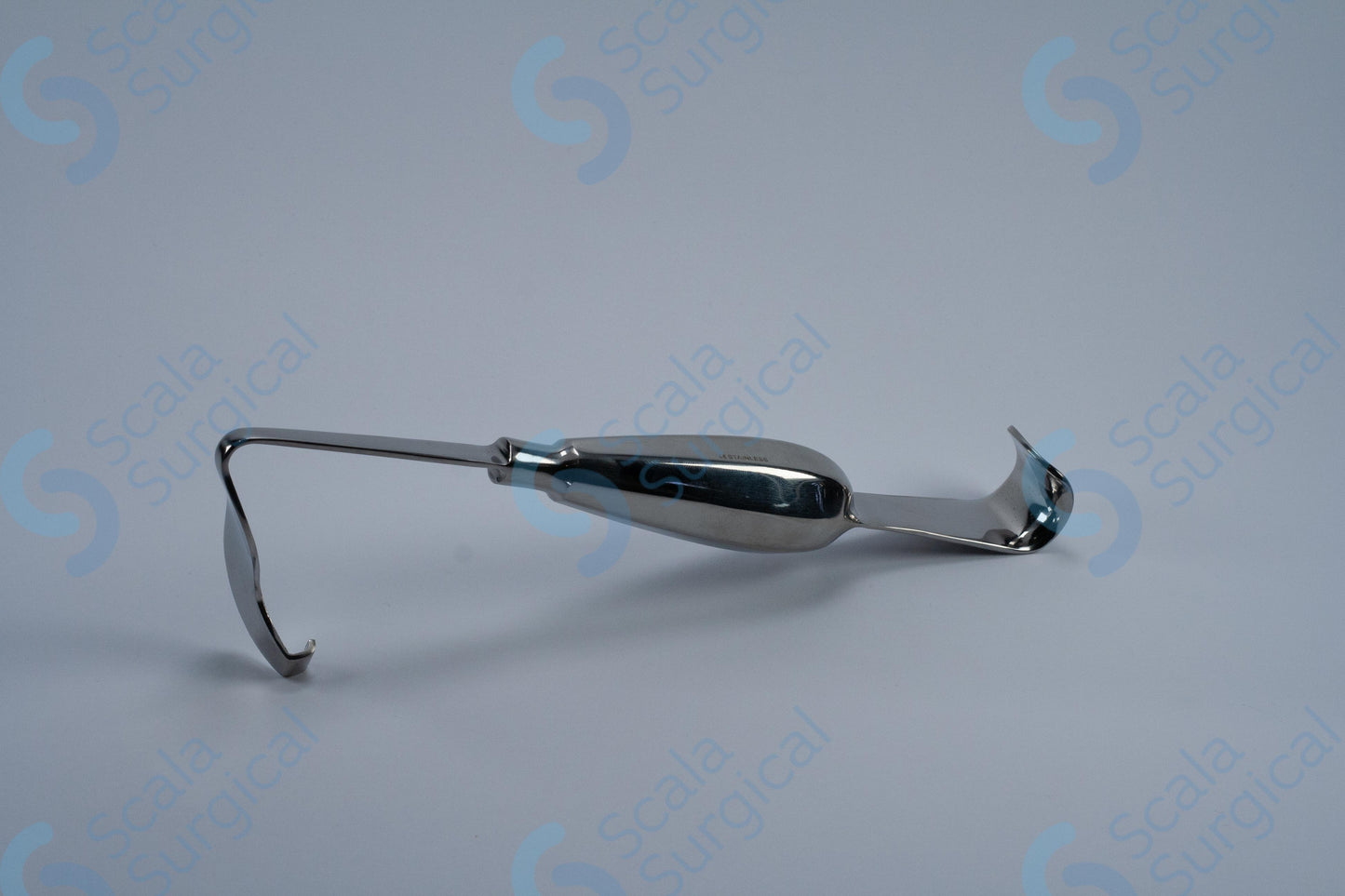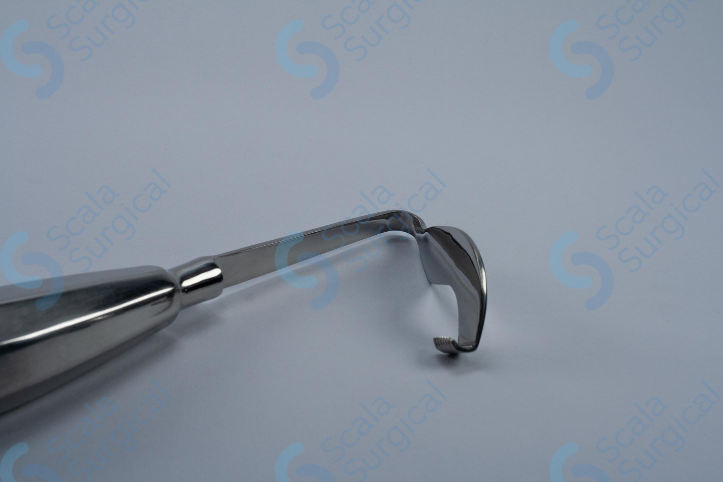 A Rowe Buccal Flap Retractor is a surgical instrument used to retract the buccal mucosa (inner lining of the cheek) during oral and maxillofacial surgery. The double-ended hollow handle is curved to the right and allows for greater access to the surgical area. It is commonly used in procedures such as dental implant placement, orthognathic surgery, and reconstructive surgery.