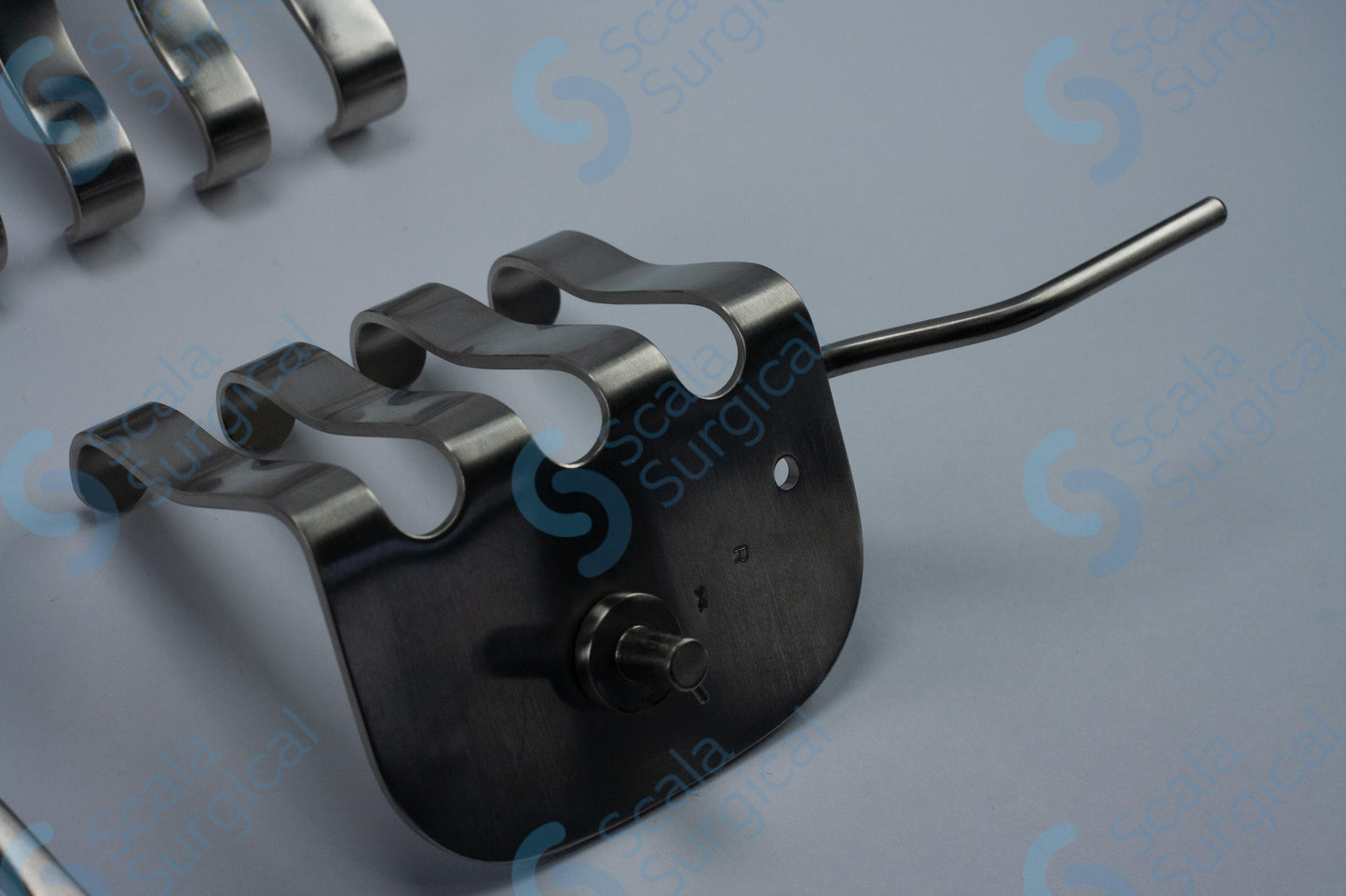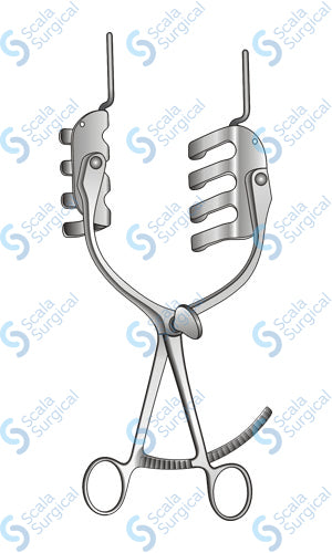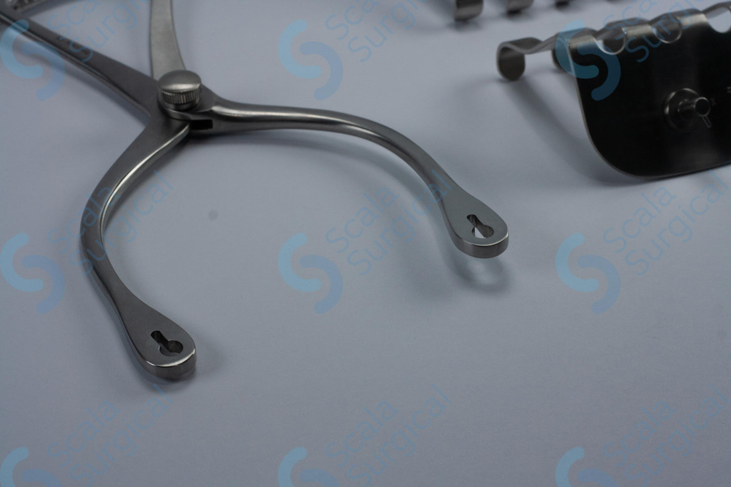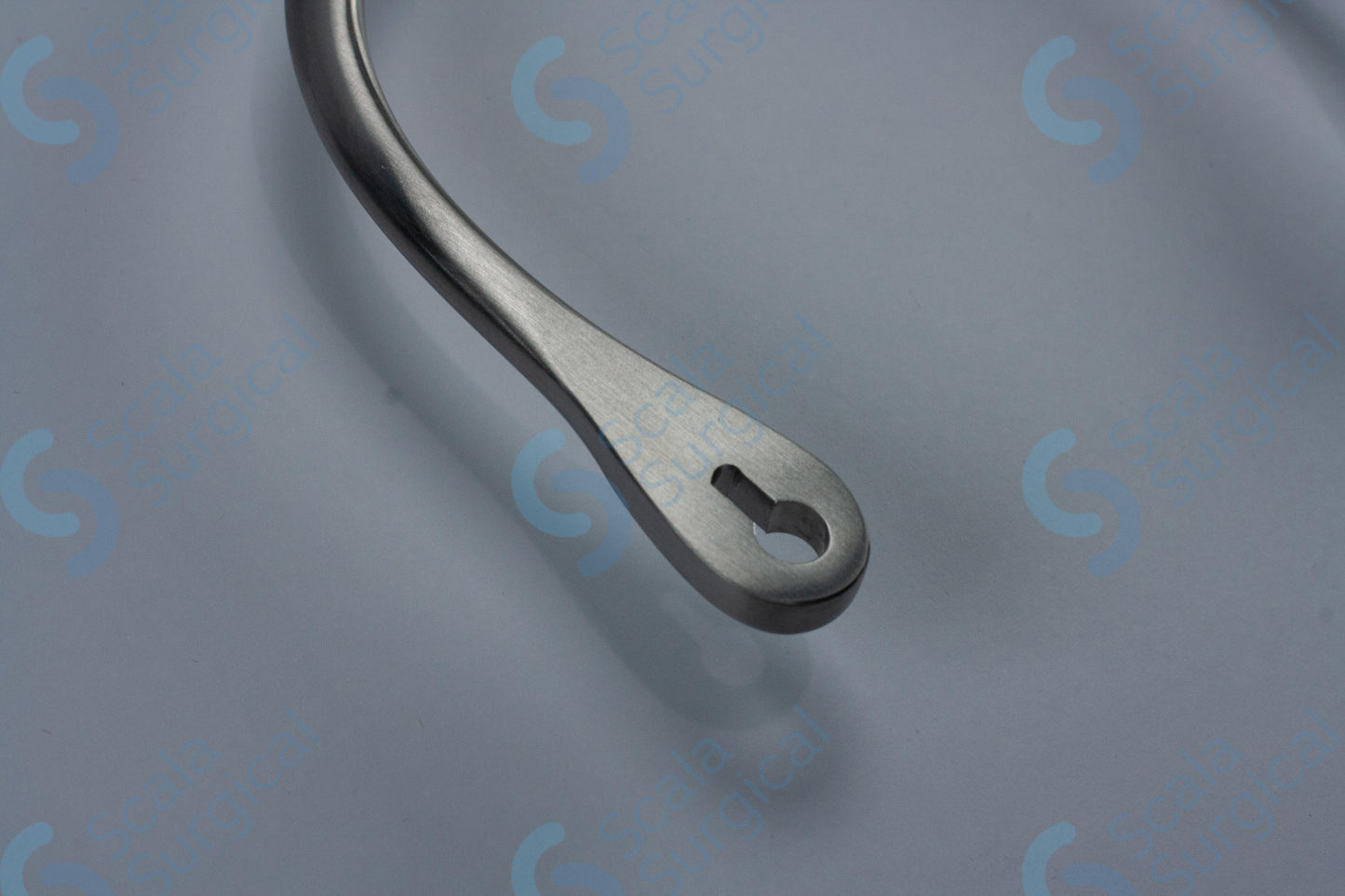 This item is a surgical retractor used to hold back the tissue around the perineum during surgery. It is typically used for gynecological and urological procedures. The retractor has self-retaining blades that are held in place with a towel peg. The blades are 209.55mm (8? inch) in size.