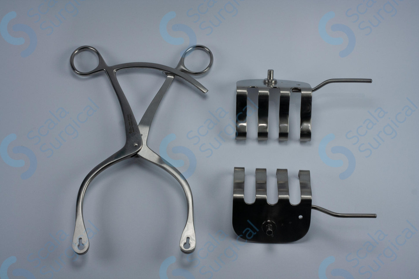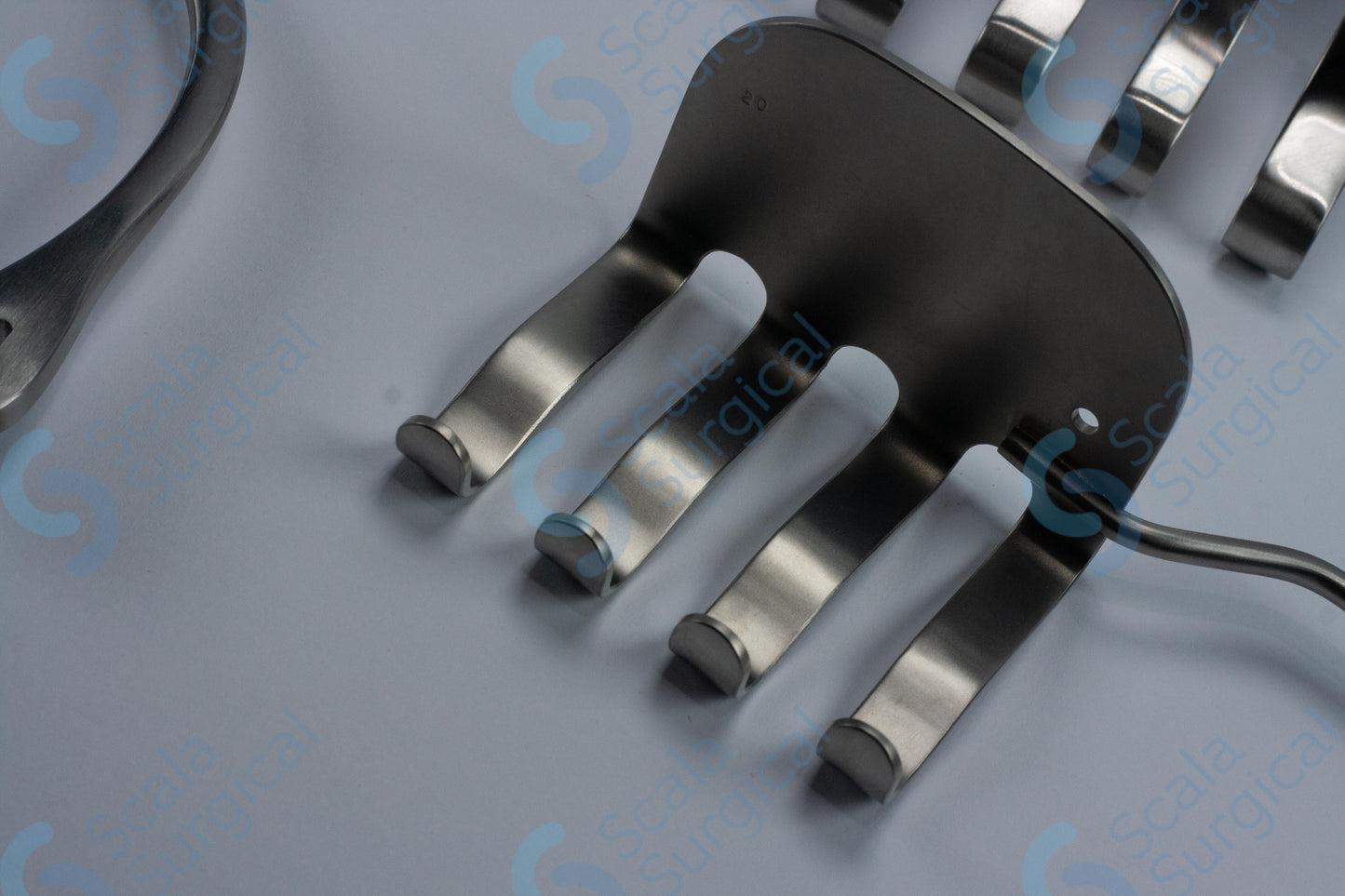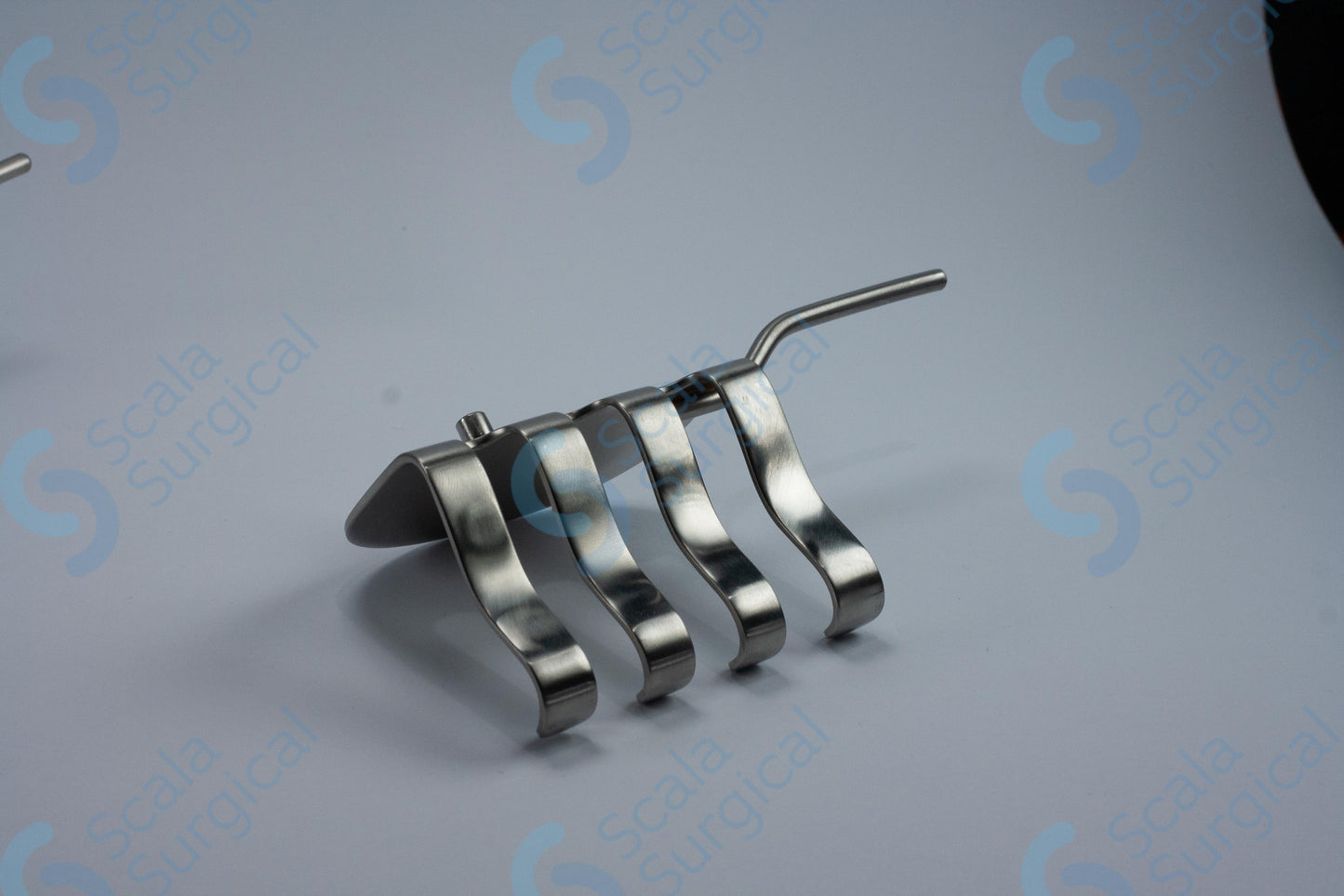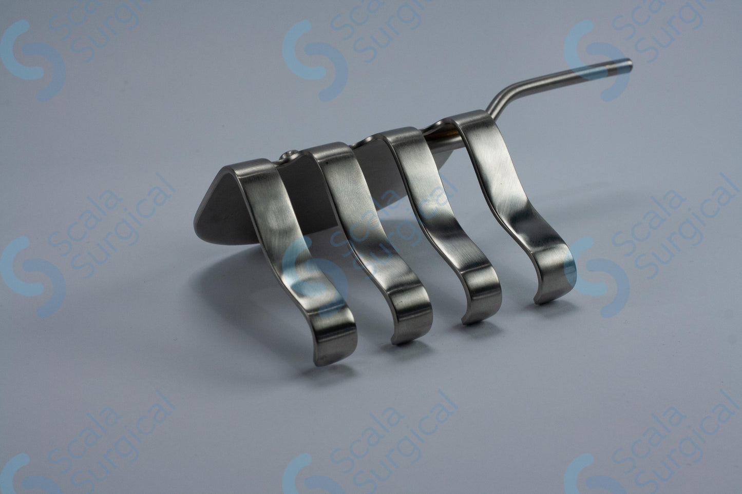 This item is a surgical retractor used to hold back the tissue around the perineum during surgery. It is typically used for gynecological and urological procedures. The retractor has self-retaining blades that are held in place with a towel peg. The blades are 209.55mm (8? inch) in size.
