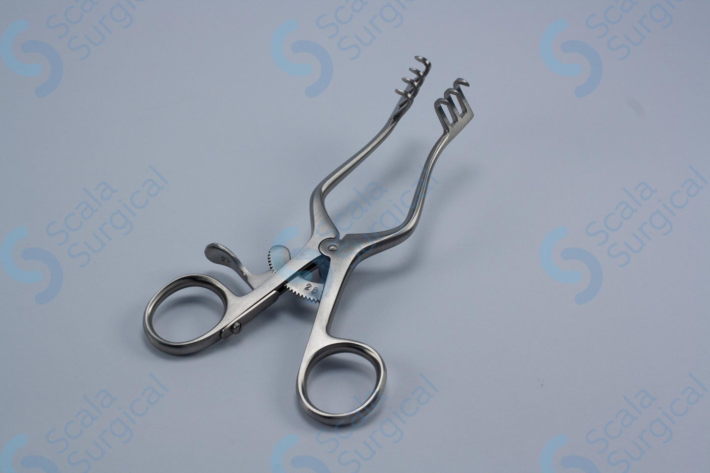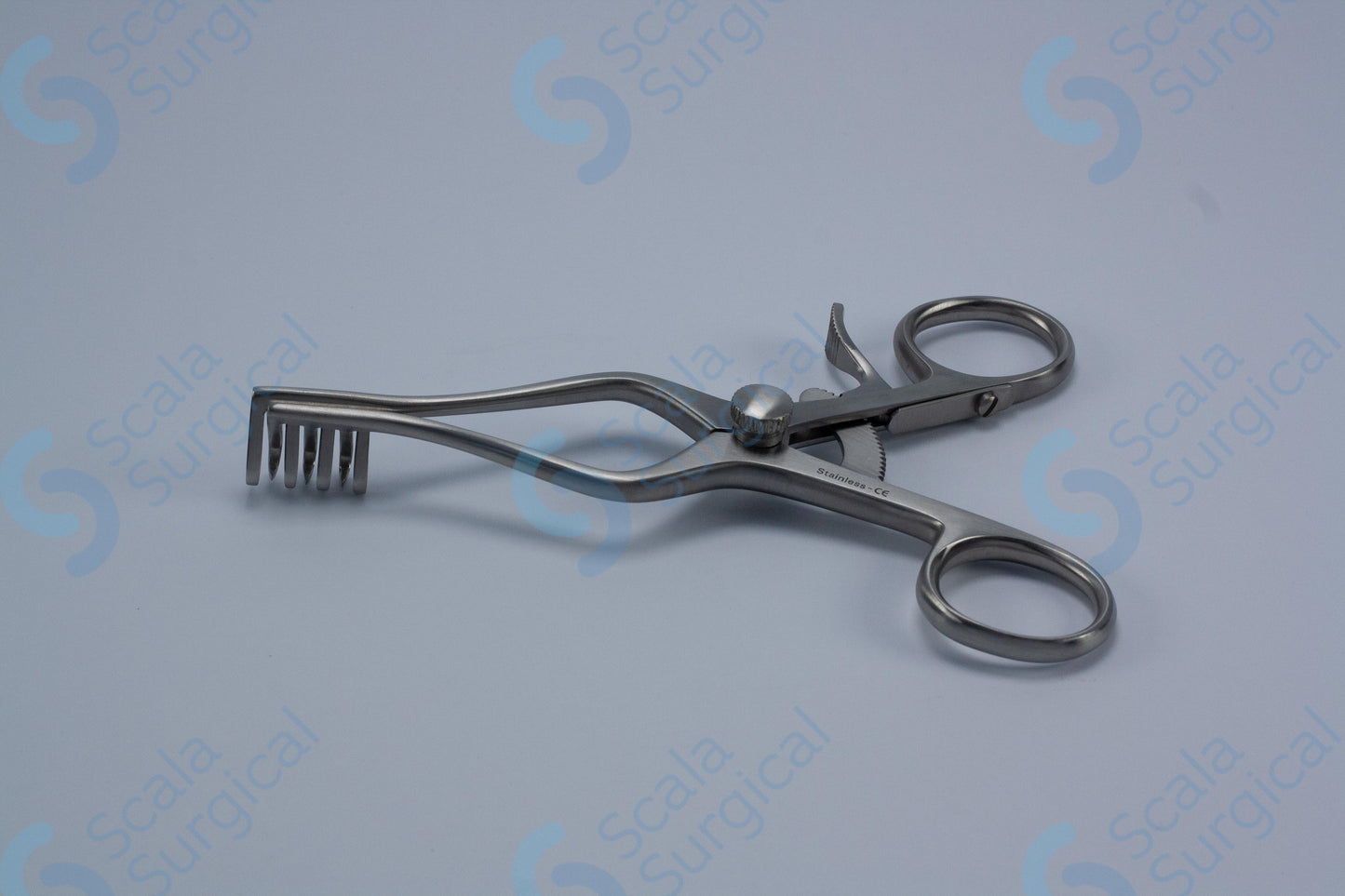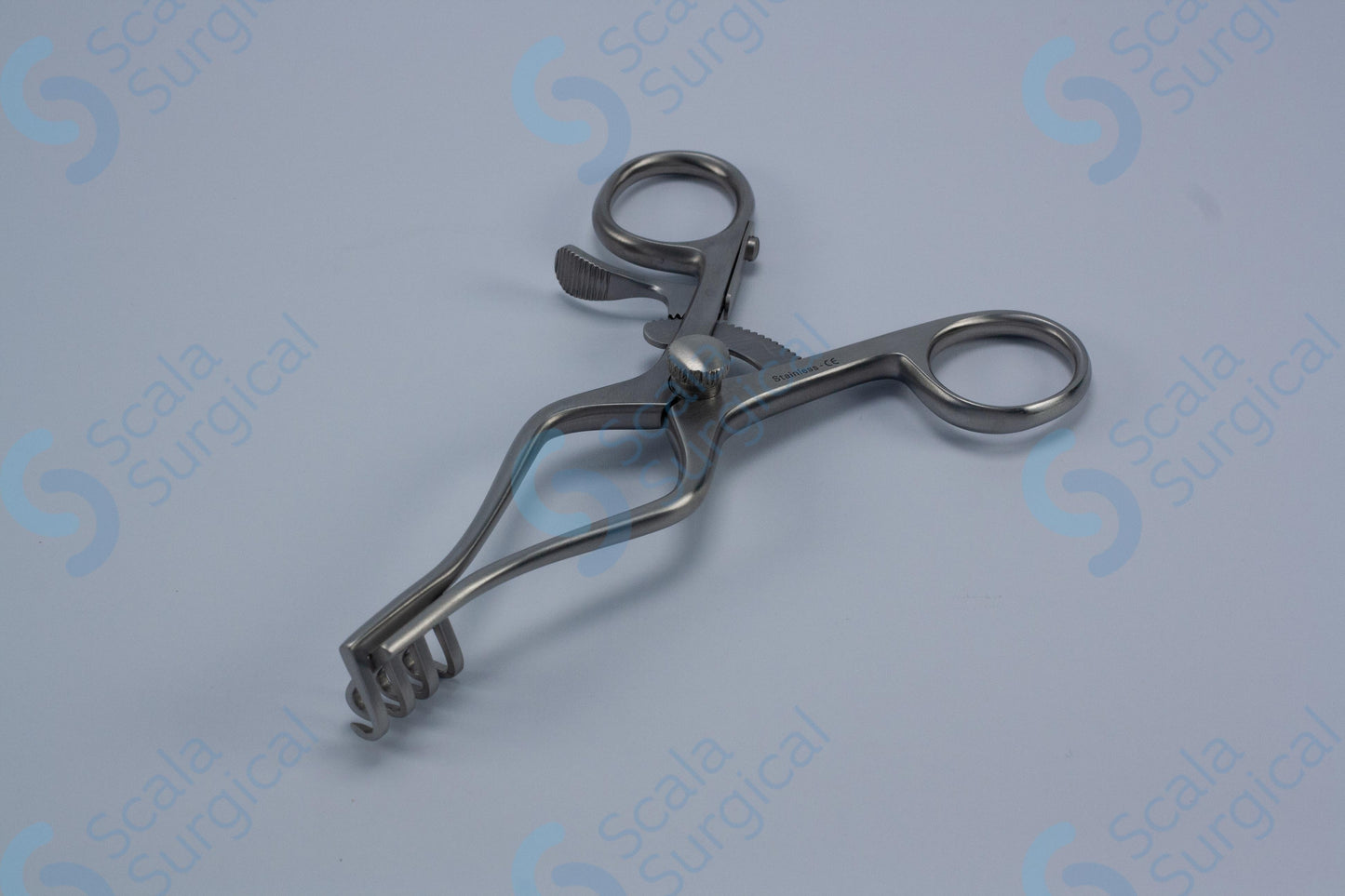 This self-retaining retractor is used to hold back tissue and organs during a surgical procedure, allowing the surgeon to have better access to the area of the body being operated on. The three 4-prong sharp design allows for a secure grip and the 139.7mm (5? inch) size is suitable for most surgical procedures.