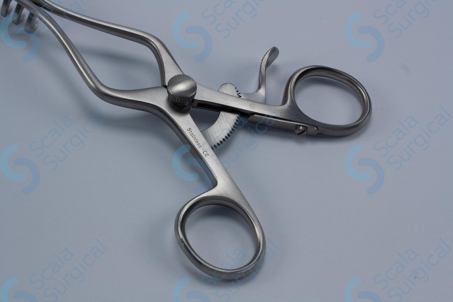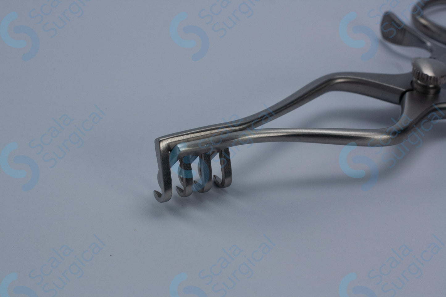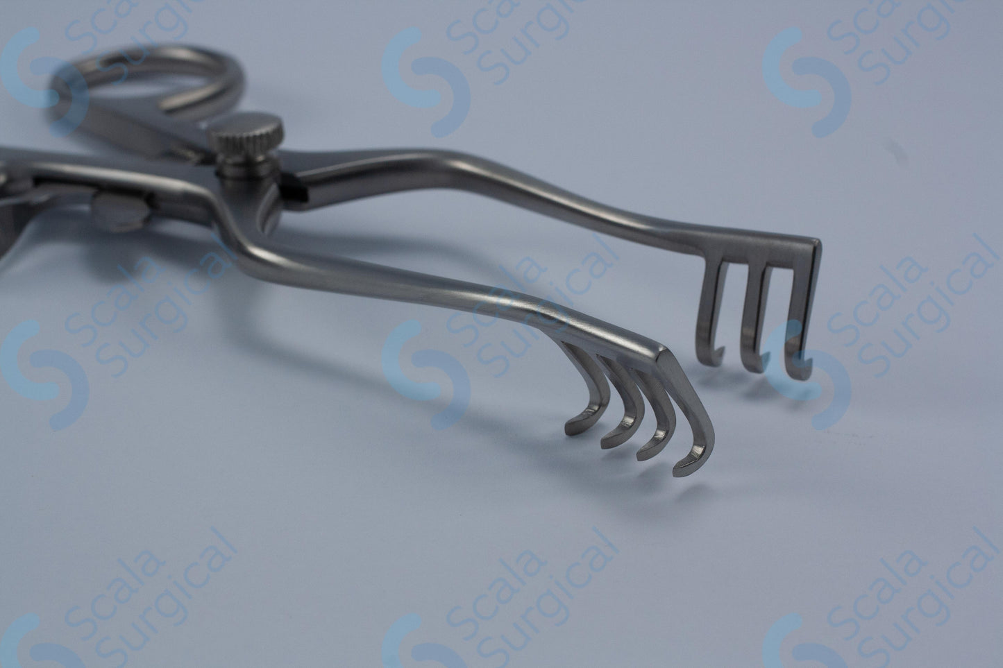 This self-retaining retractor is used to hold back tissue and organs during a surgical procedure, allowing the surgeon to have better access to the area of the body being operated on. The three 4-prong sharp design allows for a secure grip and the 139.7mm (5? inch) size is suitable for most surgical procedures.