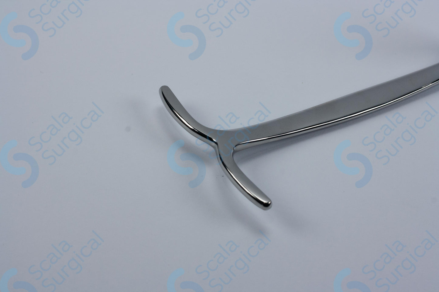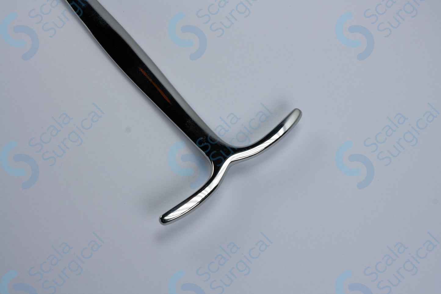The Smillie Retractor Obtuse Angled (145mm) (5? inch) is a surgical instrument used to retract tissues and organs during surgery. It is designed with a curved blade and an angled handle, allowing the surgeon to access and work in tight spaces. The instrument is commonly used in abdominal, gynecological, and orthopedic surgeries.