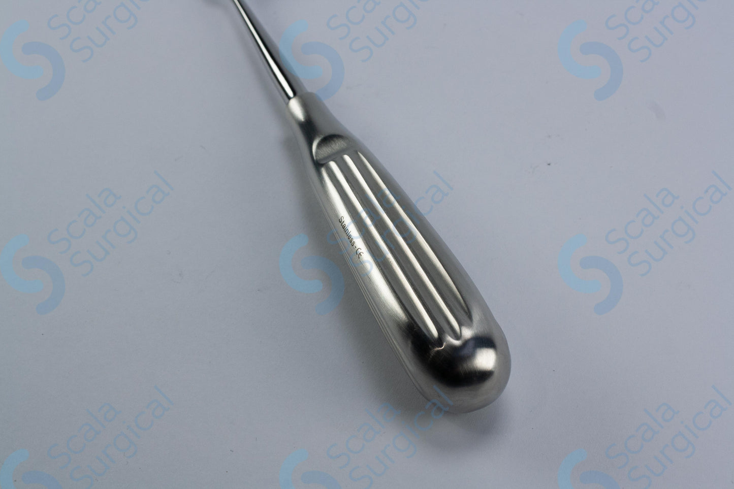 A Schede Curette is a surgical instrument used to scrape or curette tissue from a surface. It is commonly used in gynecological and obstetrical procedures, such as for the removal of intrauterine polyps. The size of the curette indicates the diameter of the looped blade and the length of the handle. In this case, the curette has a 7.4mm diameter blade and a 6? inch handle.