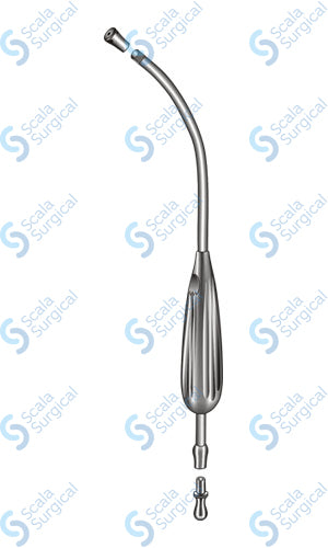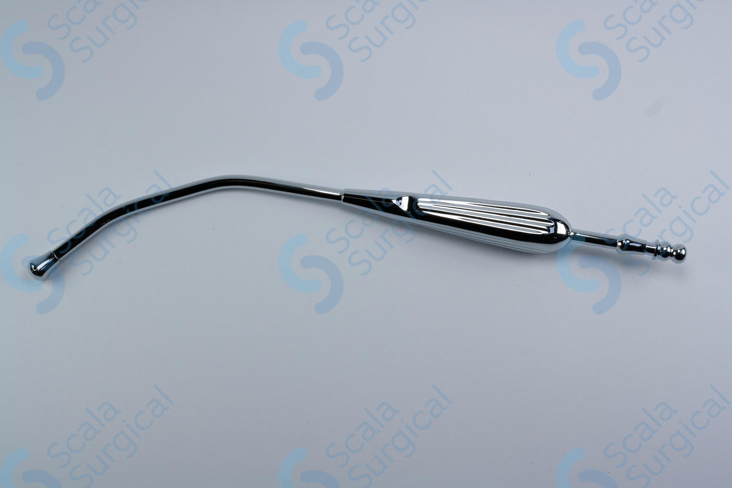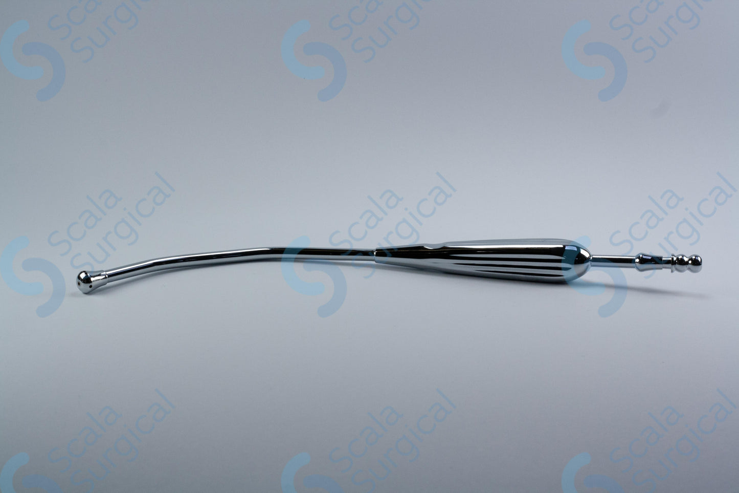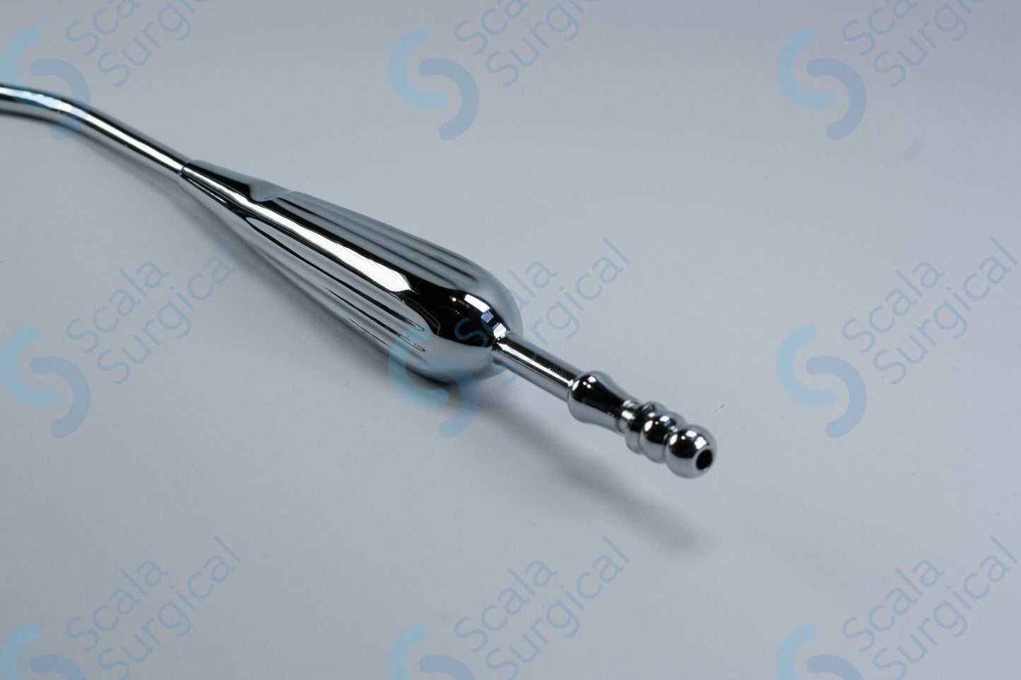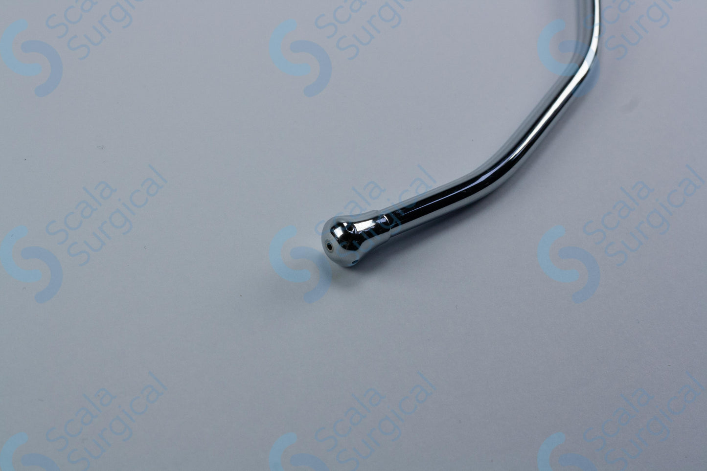 A Yankauer Suction Tube is a medical device used to remove bodily fluids, such as blood, saliva, and vomit, from a patient's airway during surgery. The rose end of the tube is inserted into the patient's mouth, and the chrome plated end is attached to a suction machine. The suction machine then removes the fluids from the patient's airway.