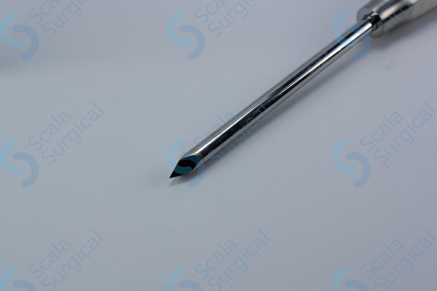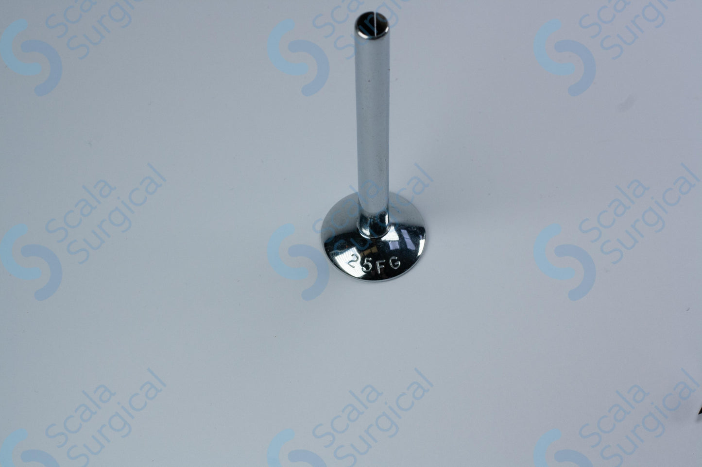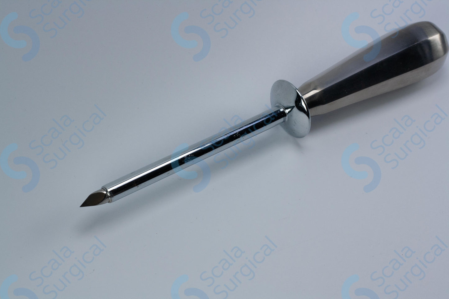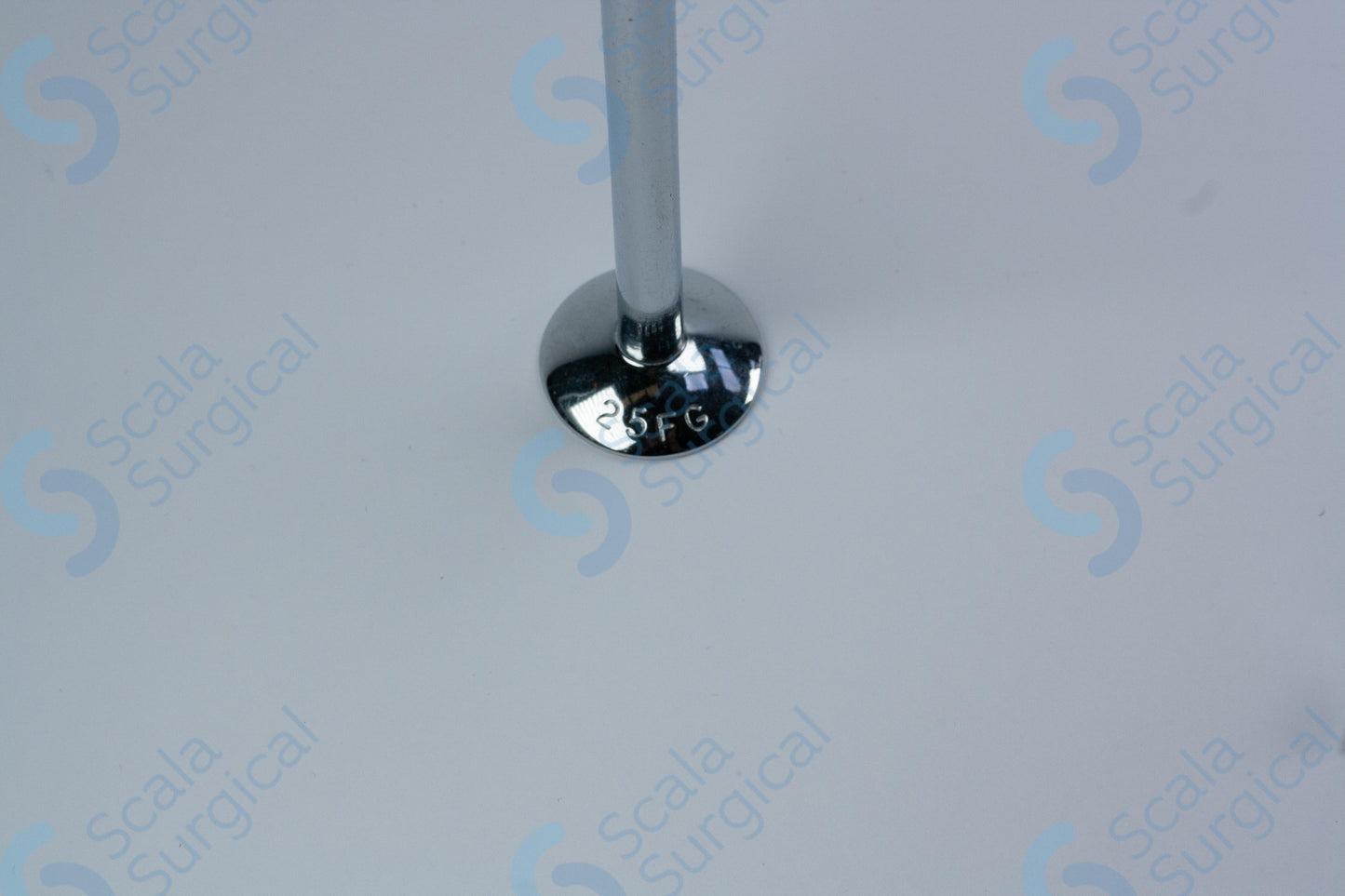 A Nelson Trocar Chrome Plated 25 FG is a surgical instrument used for accessing the abdominal cavity during laparoscopic surgery. It is a sharp, hollow tube that is inserted into the abdominal wall to create an entry point for the insertion of other instruments.