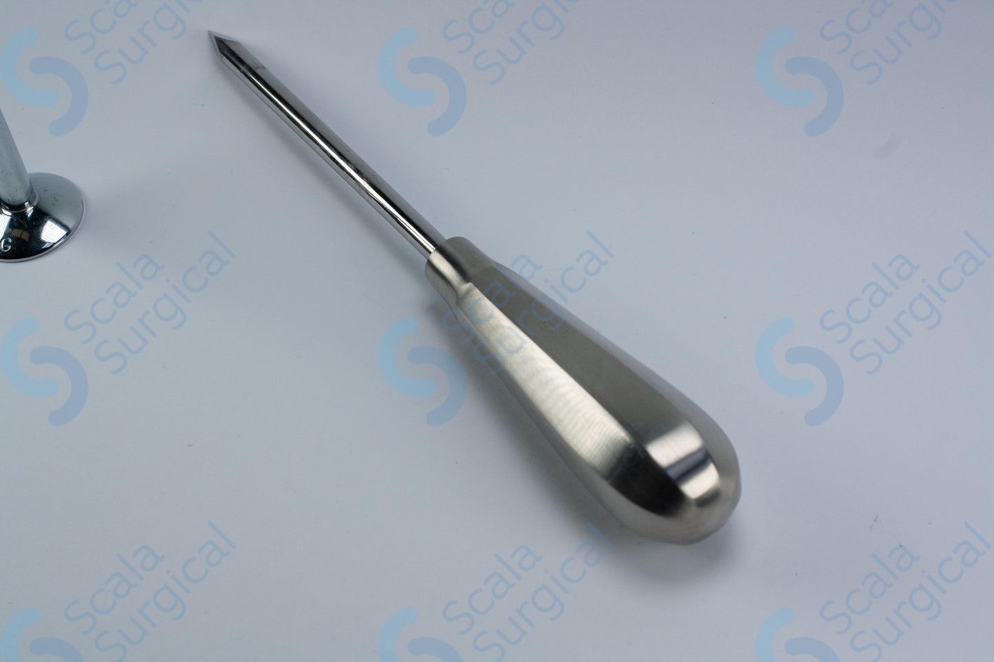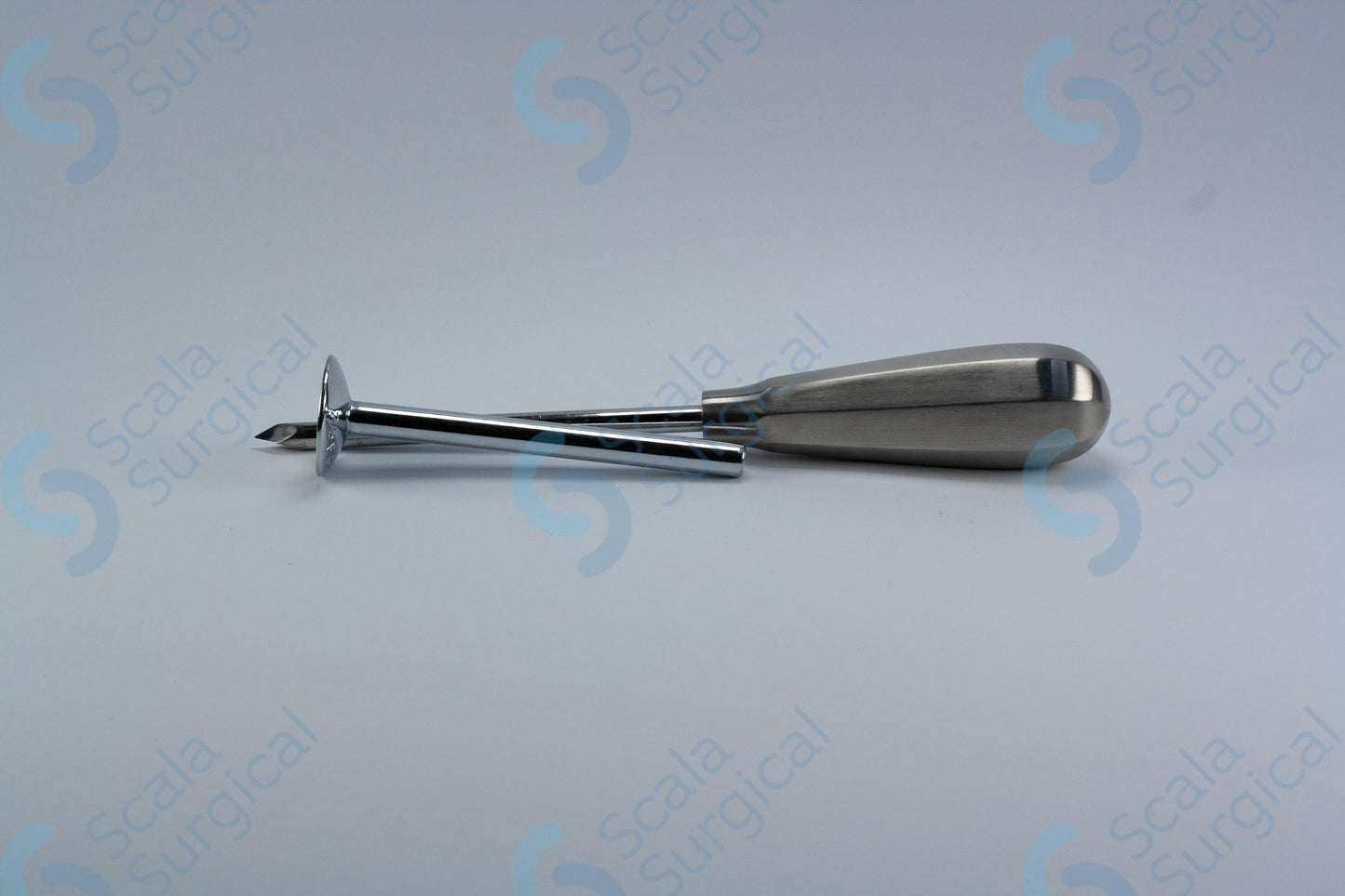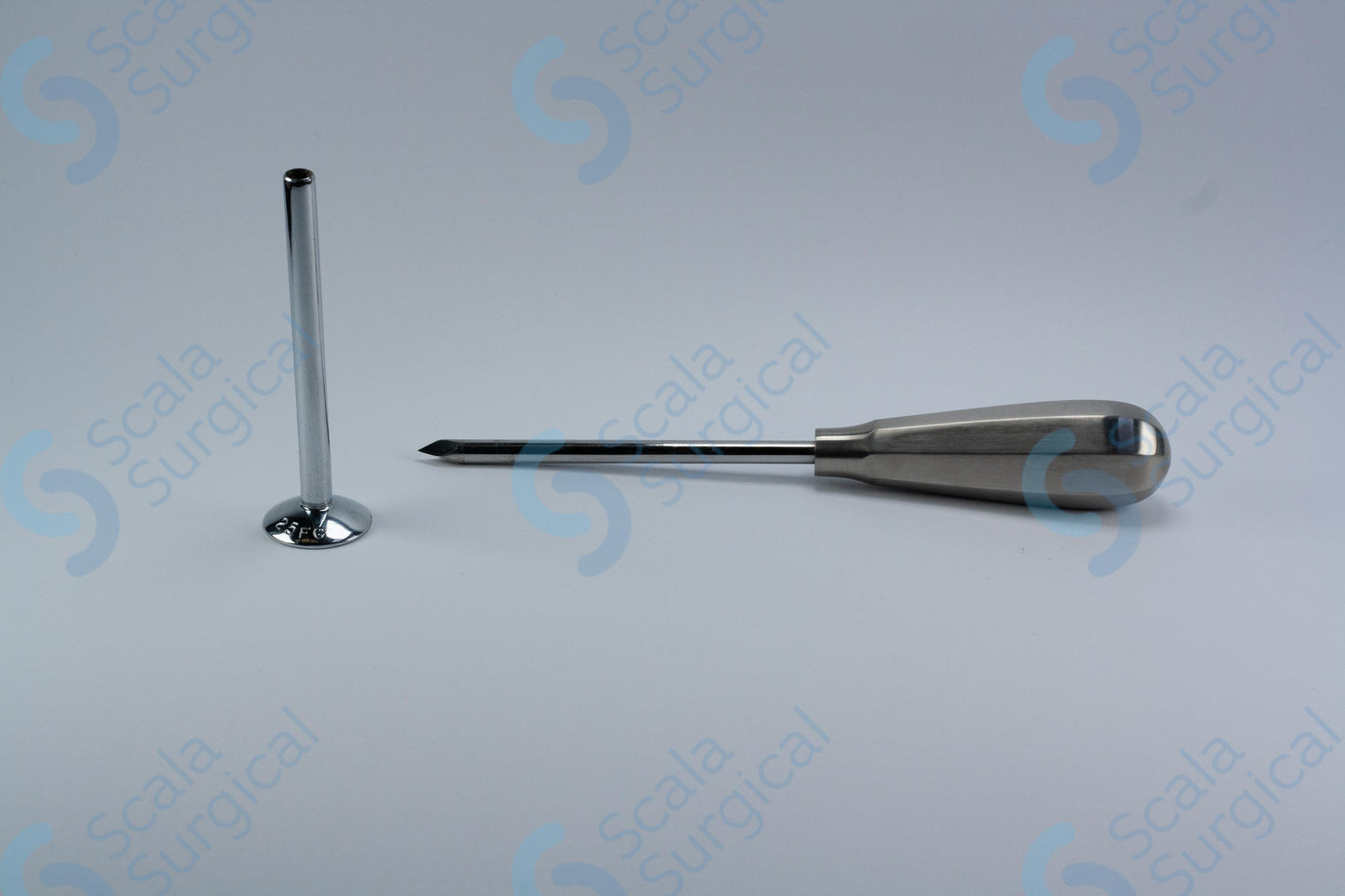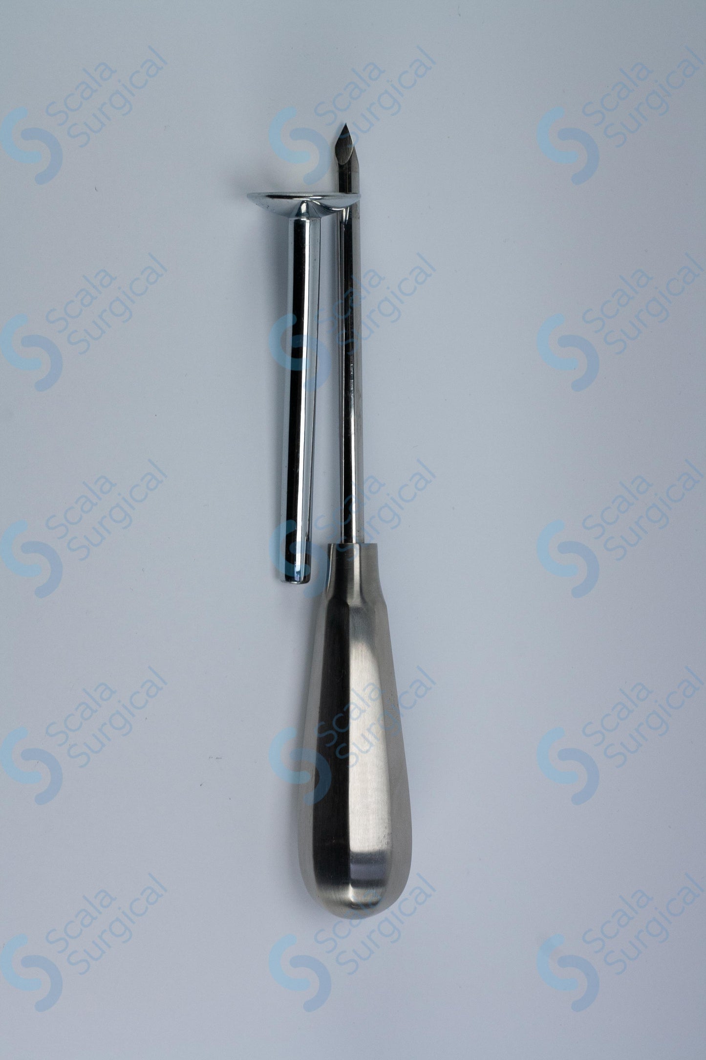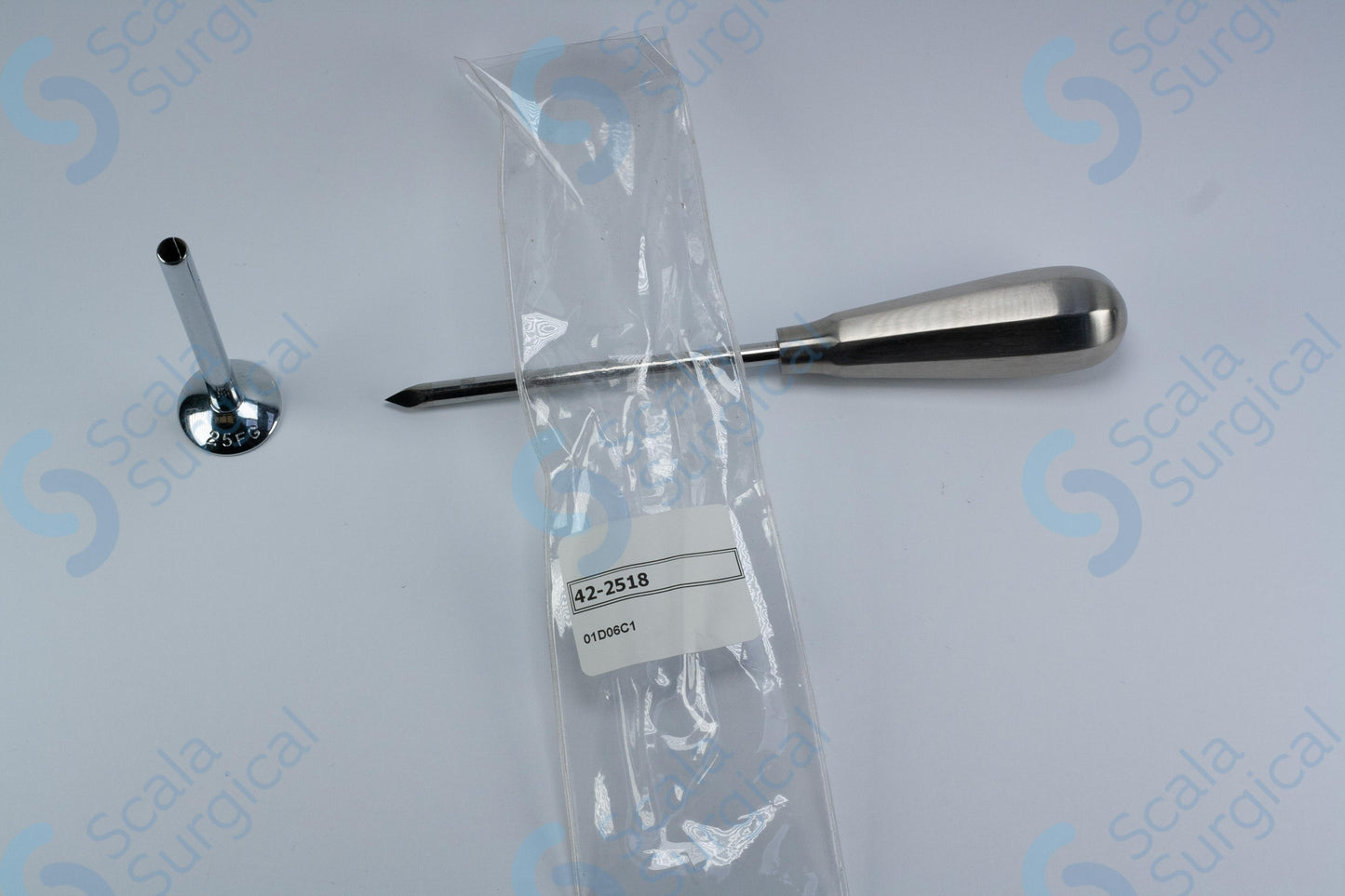A Nelson Trocar Chrome Plated 25 FG is a surgical instrument used for accessing the abdominal cavity during laparoscopic surgery. It is a sharp, hollow tube that is inserted into the abdominal wall to create an entry point for the insertion of other instruments.