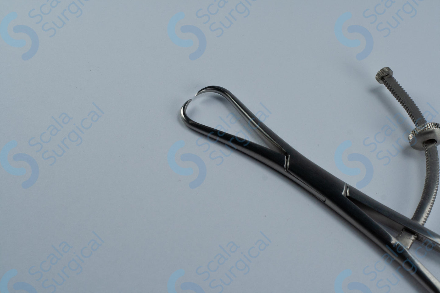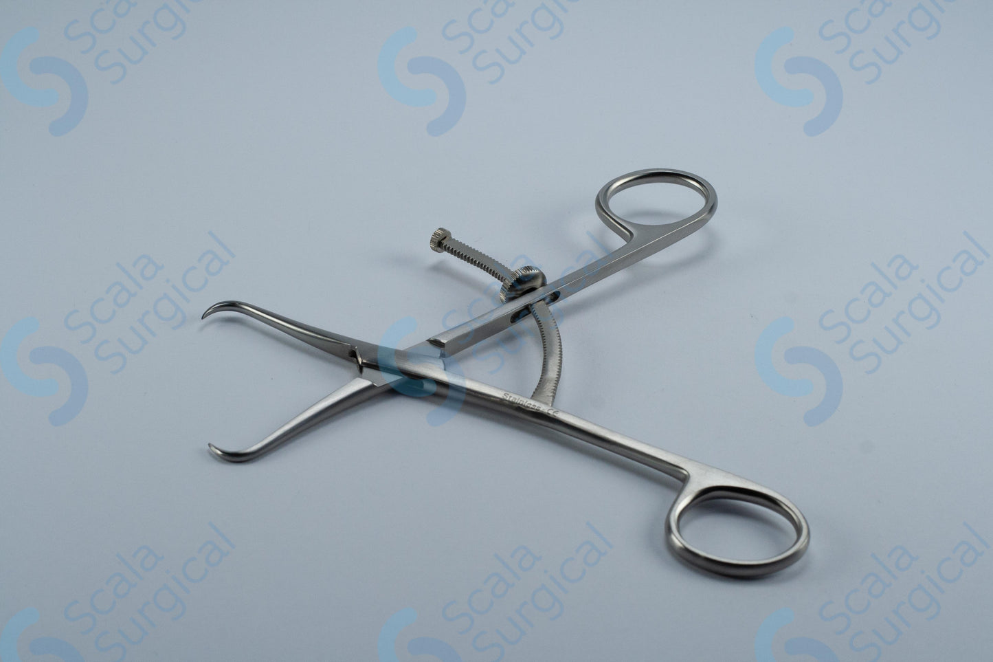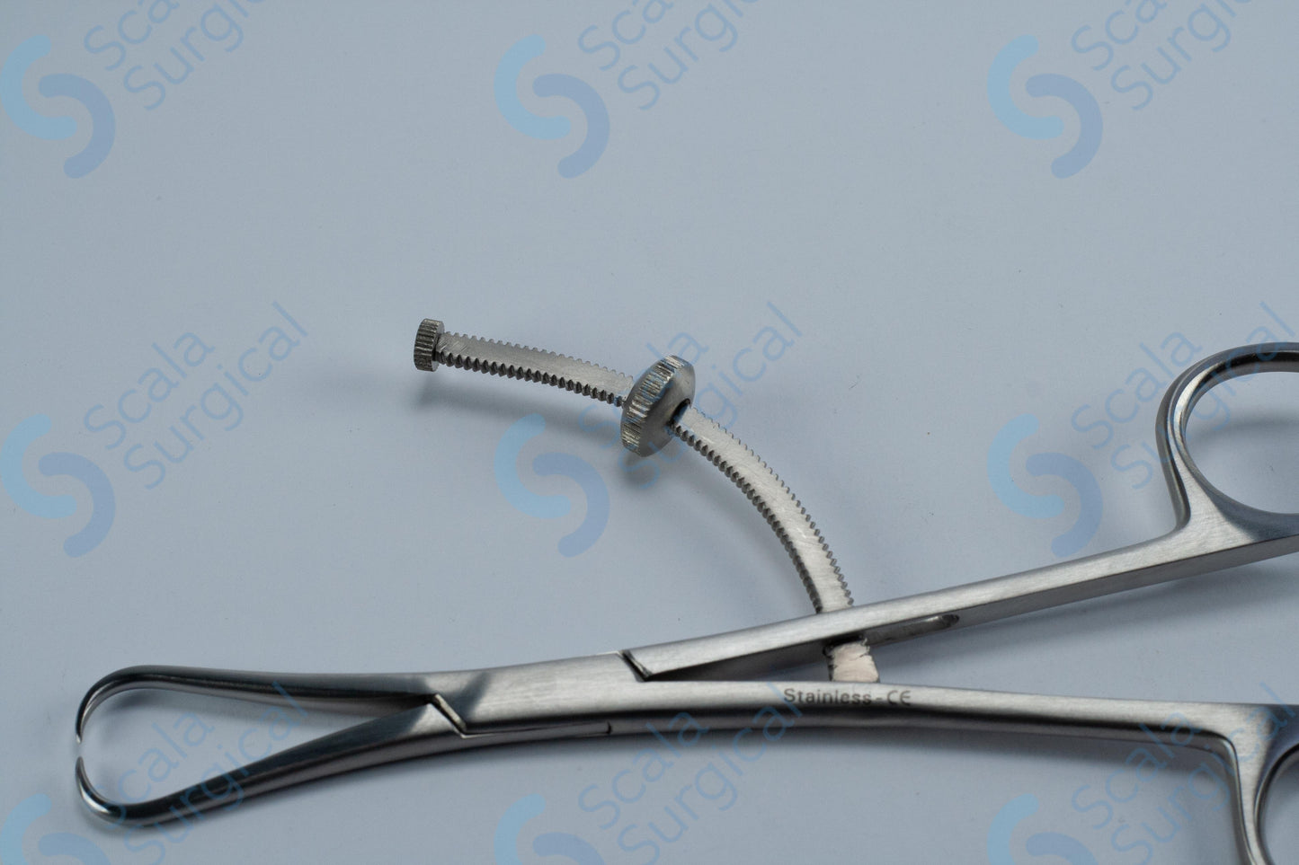 A Tullock Brown Scarf Clamp is a surgical instrument used to hold skin flaps in place during plastic surgery procedures. The clamp has two hinged arms with serrated edges that can be adjusted to fit the size and shape of the skin flap being held. The clamp is typically used to hold the skin flap in place while the surgeon performs suturing or other procedures.