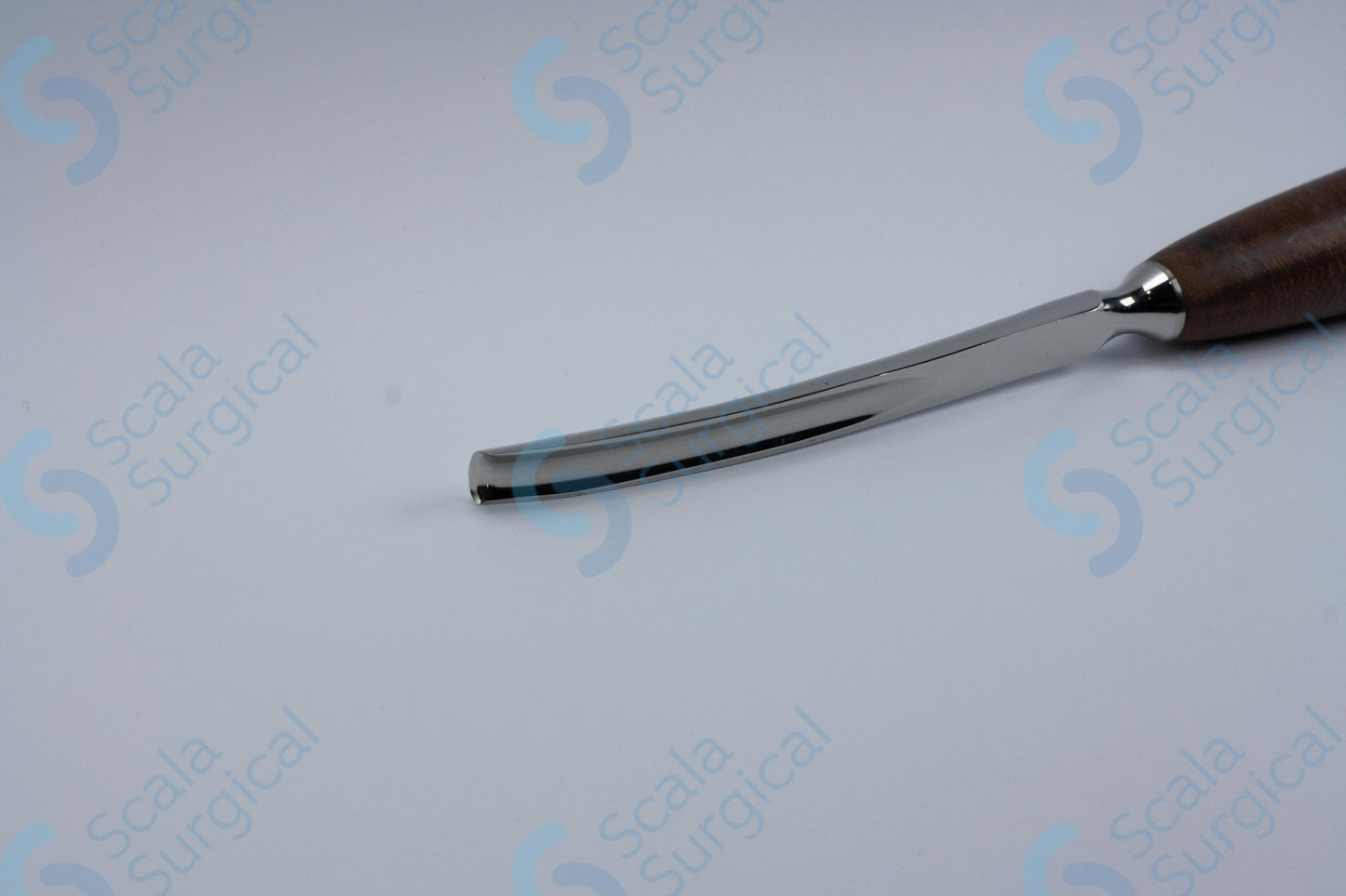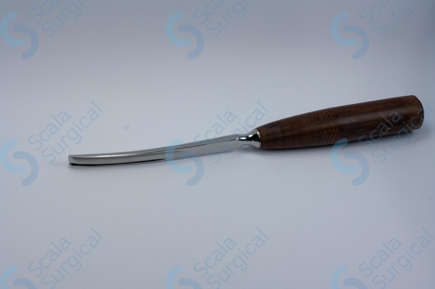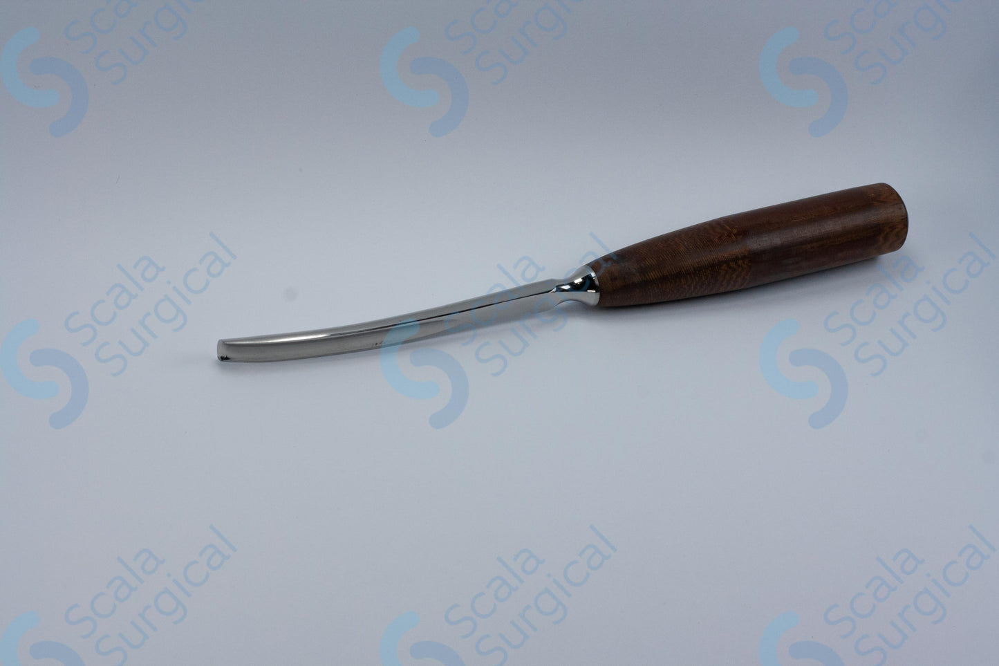 A Stille Gouge Curved Backward With Tufnol Handle (10 inch) is a surgical instrument used for cutting and carving bone during surgery. It can be used for a variety of procedures, including orthopedic and plastic surgery. The curved design of the blade allows for greater precision when cutting. The Tufnol handle provides a comfortable and secure grip.