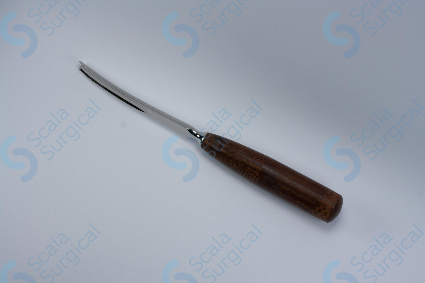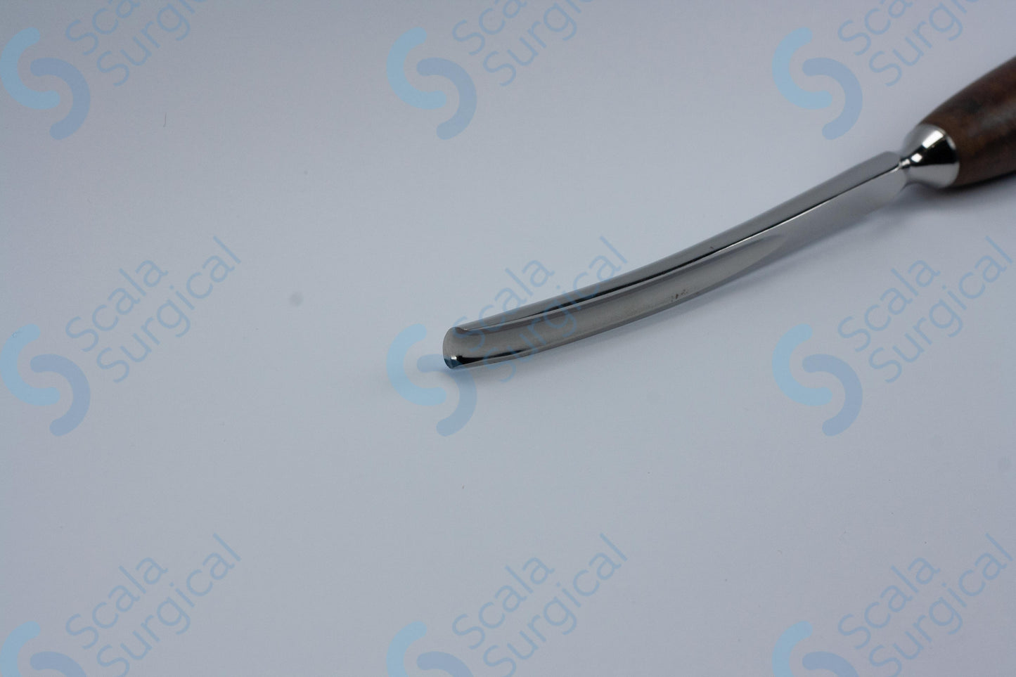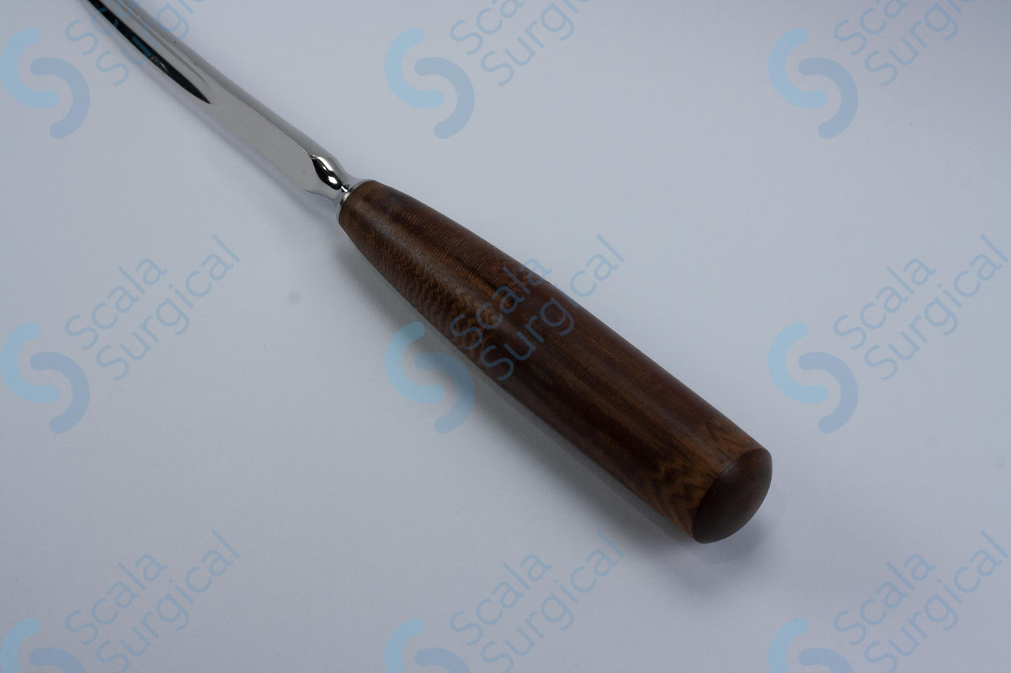 A Stille Gouge Curved Backward With Tufnol Handle (10 inch) is a surgical instrument used for cutting and carving bone during surgery. It can be used for a variety of procedures, including orthopedic and plastic surgery. The curved design of the blade allows for greater precision when cutting. The Tufnol handle provides a comfortable and secure grip.
