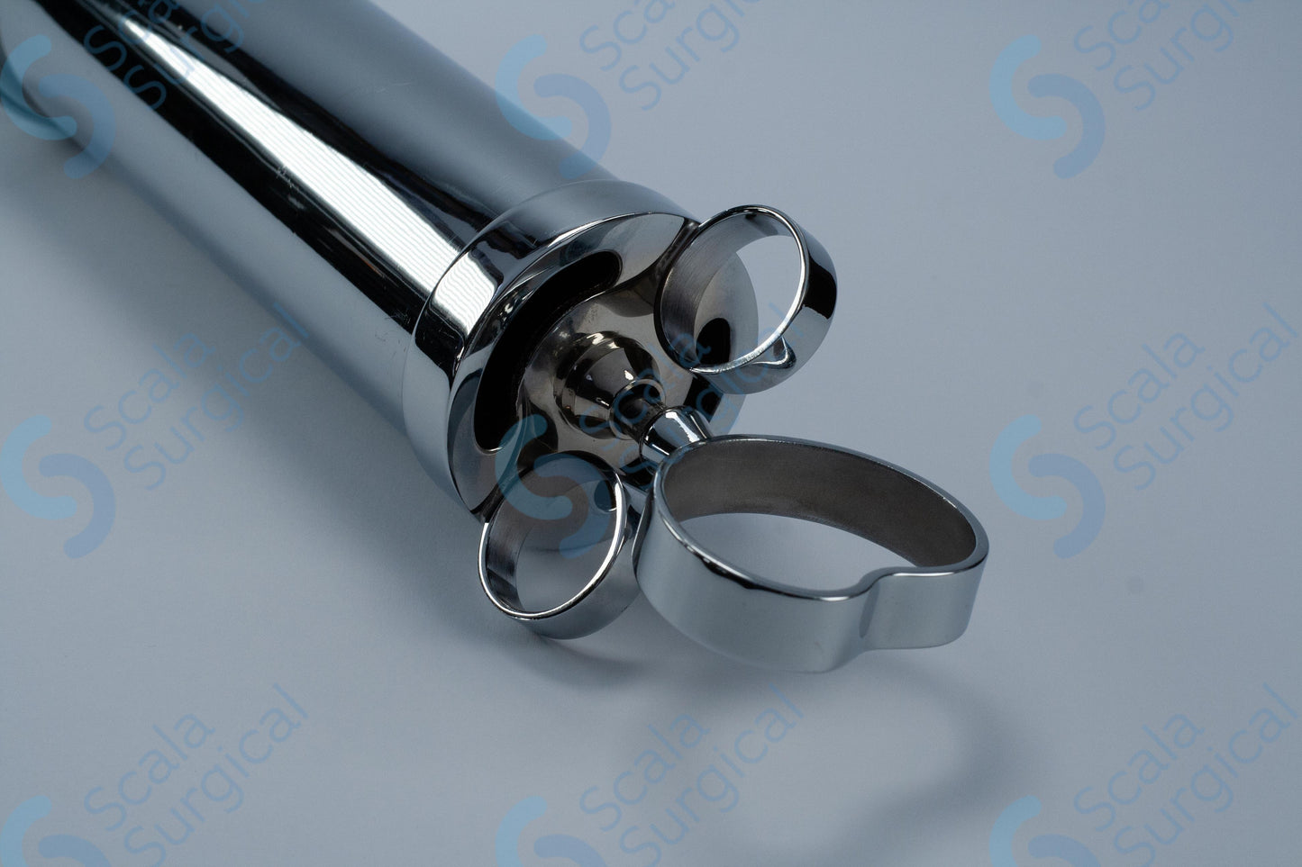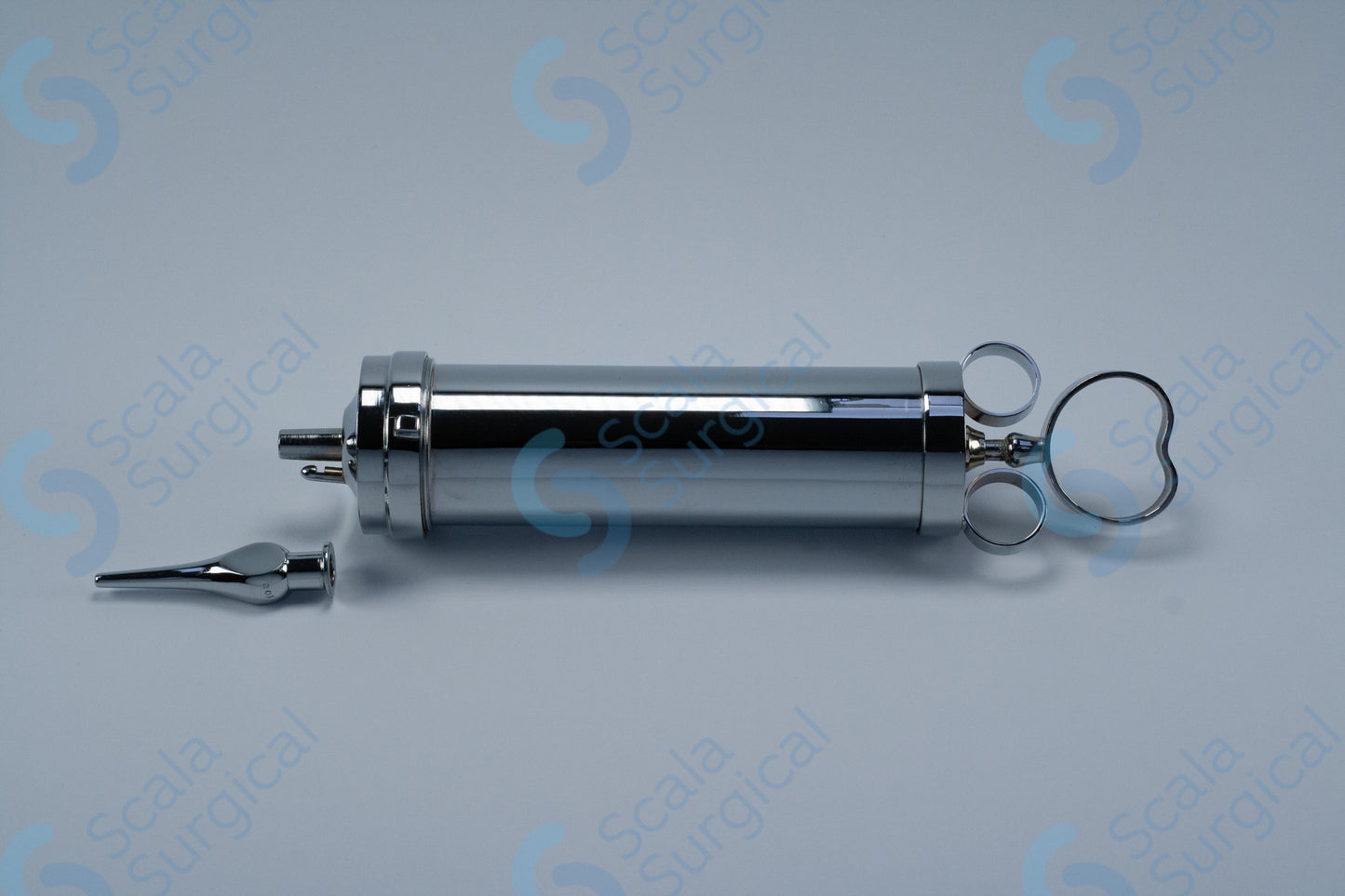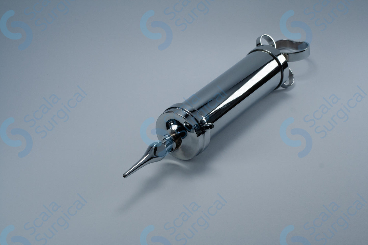 The Thomson Walker Bladder Syringe is a device used to irrigate the bladder during surgical procedures. It is equipped with a coned end to the barrel and is chrome plated for easy cleaning and sterilization. The weight of the syringe is 226.80grams.