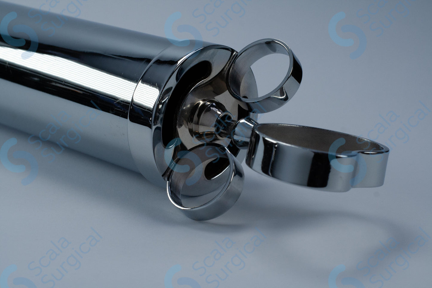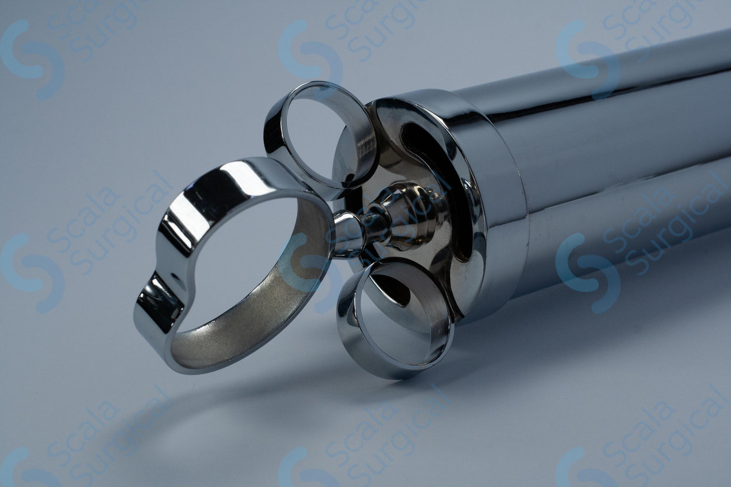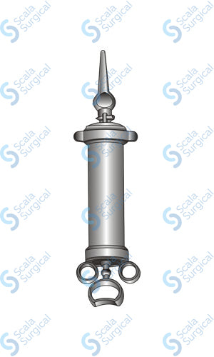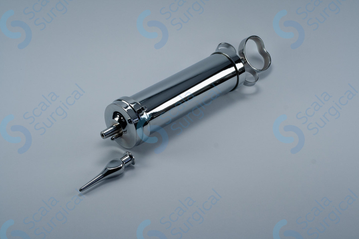 The Thomson Walker Bladder Syringe is a device used to irrigate the bladder during surgical procedures. It is equipped with a coned end to the barrel and is chrome plated for easy cleaning and sterilization. The weight of the syringe is 226.80grams.